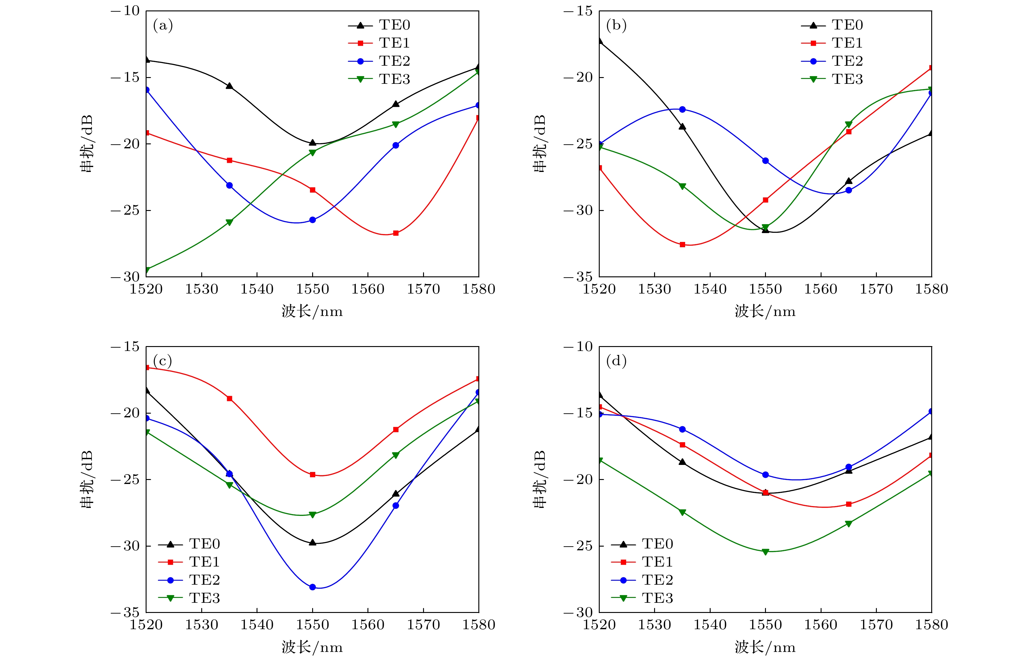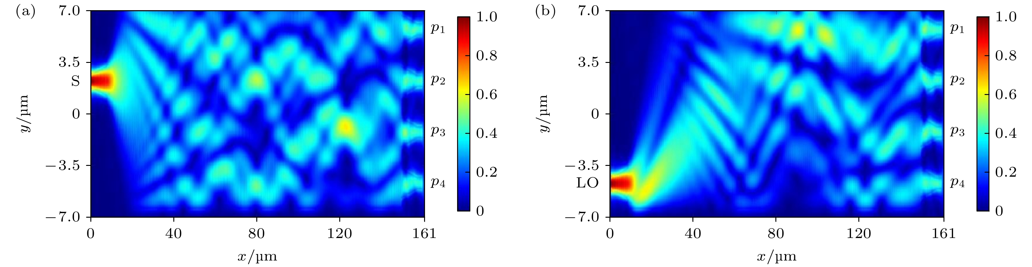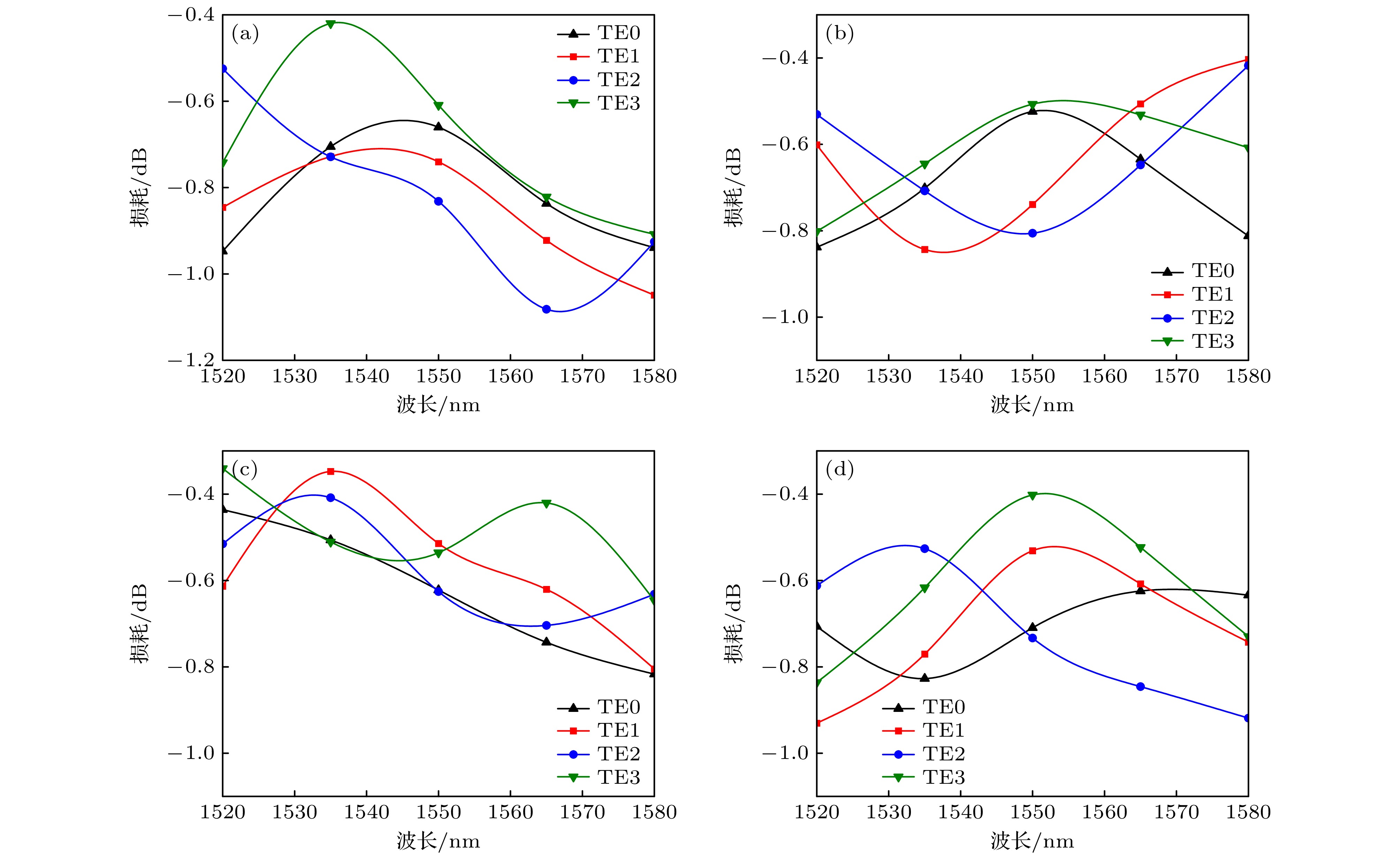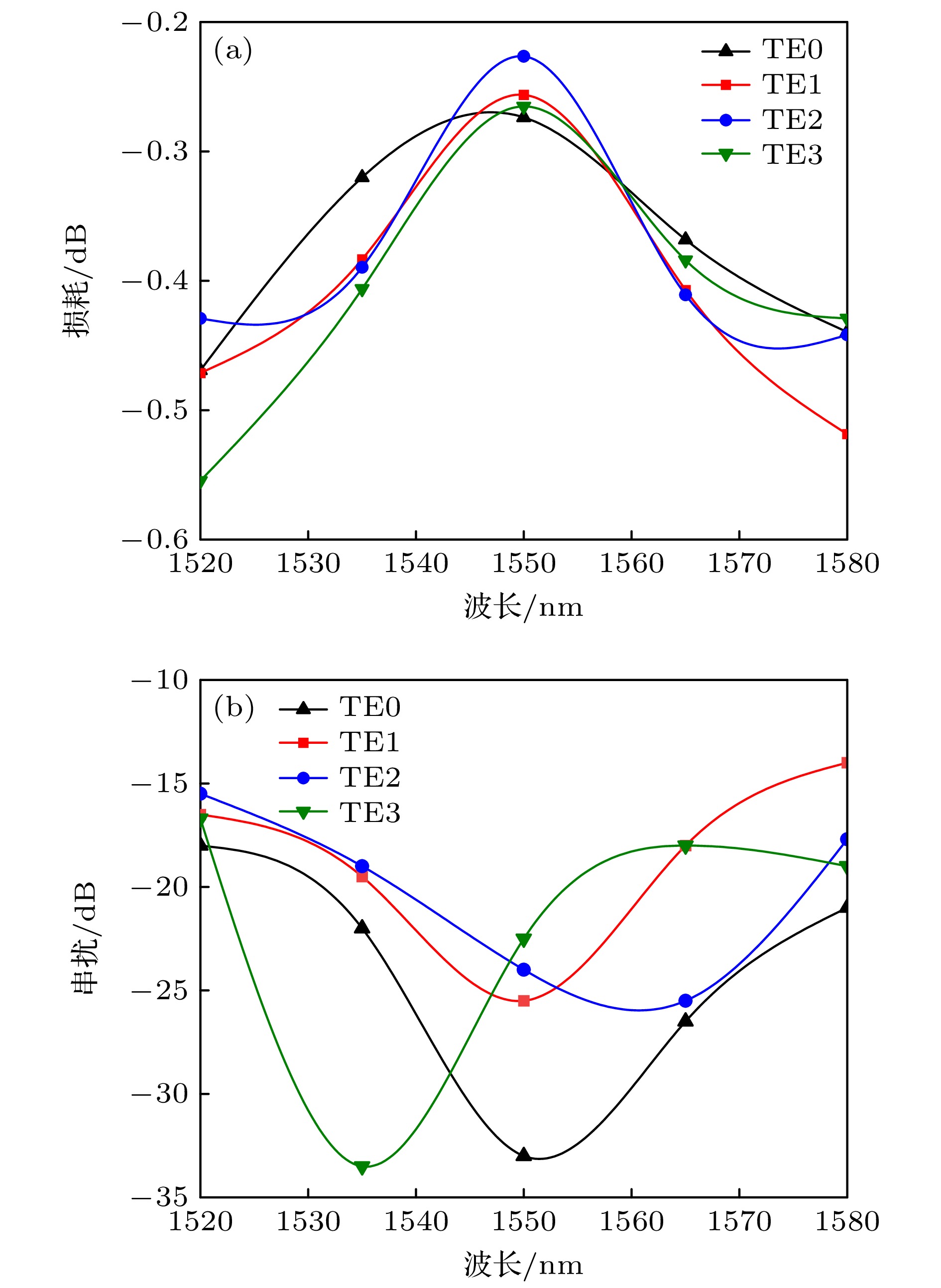 90°optical mixer, as an essential part of coherent optical communication and heterodyne detection, improves polarization discrimination and anti-interference capabilities, increases receiver sensitivity, and permits demodulation of higher-order modulation forms. The disadvantages of traditional 90° optical mixers, however, include their high precision needs, size, mode mismatch restrictions, polarization sensitivity, and single functionality. Utilizing a lithium niobate platform, a multimode interference (MMI) structure, and a micro-thermoelectric electrode array, and with the help of the finite difference time domain (FDTD) method, a multipurpose device that combines 90° optical mixing and mode separation capabilities is designed in this work. According to the results, when no voltage is applied across the micro-thermoelectric electrodes, the multipurpose device acts as a 90° optical mixer. The common-mode rejection ratios of all four outputs are all above –30 dB, phase errors are below 4°, and the losses in the wavelength range of 1520–1580 nm exceed –13.862 dB. When a voltage is applied across the micro-thermoelectric electrodes, TE0, TE1, TE2, and TE3 modes are separated by the multipurpose device acting as a mode splitter. In addition to controlling crosstalk fluctuation within 8.8 dB, the minimum loss divergence between modes is less than 0.024 dB. Research findings indicate that the physical characteristics of optical field interference within the MMI structure enable perfect phase matching and energy distribution across a wide spectrum range, even when no voltage is supplied across the micro-thermoelectric electrode terminals. By controlling the interference superposition process inside the multi-mode region and improving broadband 90° optical mixing parameters, the stable phase-matching conditions are maintained across the wide spectrum. The lithium niobate-based linear electro-optic effect (Pockels effect) modifies the waveguide refractive index distribution through an external electric field when a voltage is applied across the micro-thermoelectrodes. By changing the light field’s coupling path and propagation mode inside the MMI structure, the mode-separating integrator can precisely achieve mode separation, thereby confirming the efficiency of the electro-optic effect in optical functional control, which meets the isolation requirements for various mode optical signals. Furthermore, a systematical tolerance analysis of the device’s width and length is carried out, demonstrating how structural dimensional deviations affect the mode coupling efficiency and optical field interference circumstances. The integrated broadband 90° optical mixer and mode splitter device described in this paper has excellent process tolerance properties.