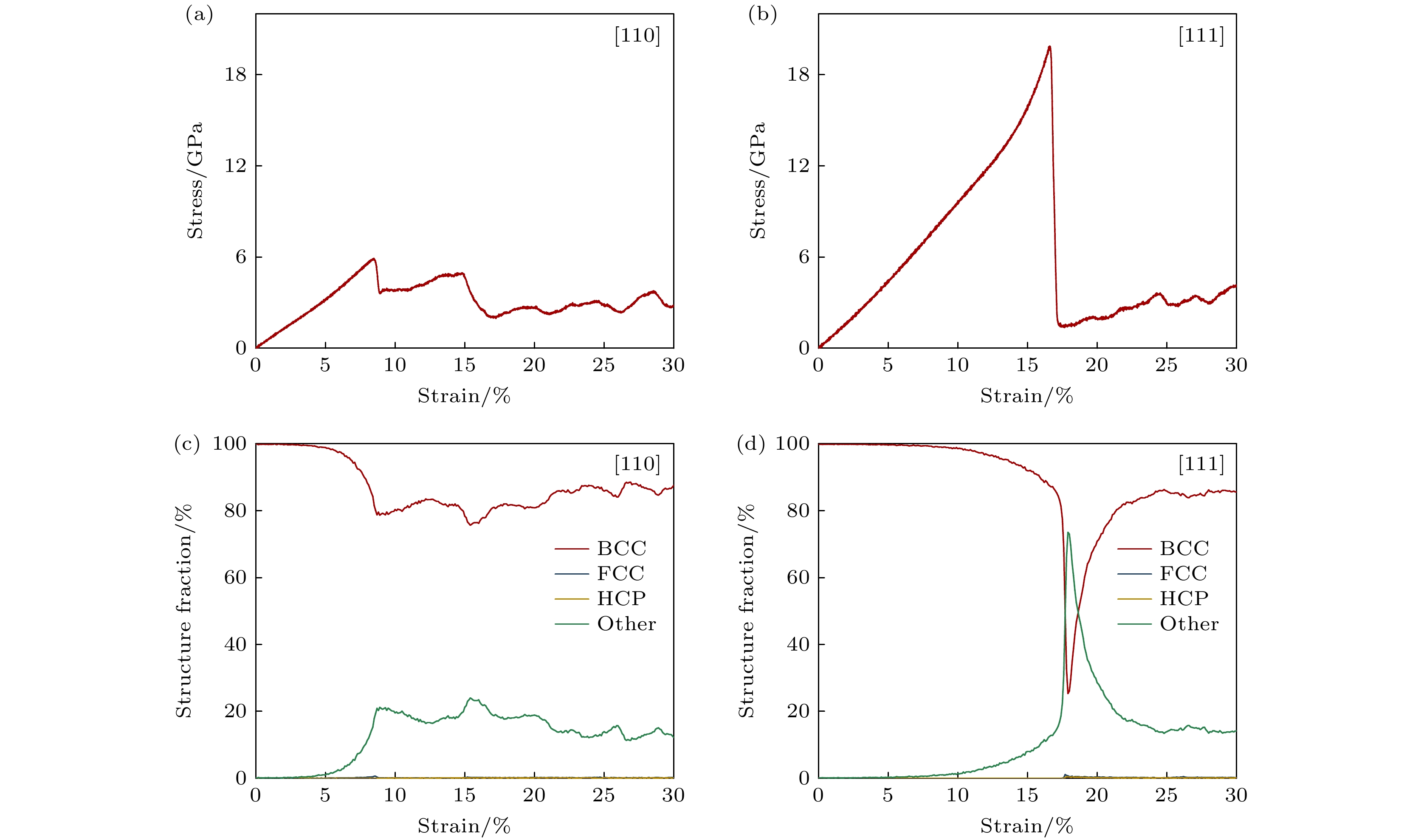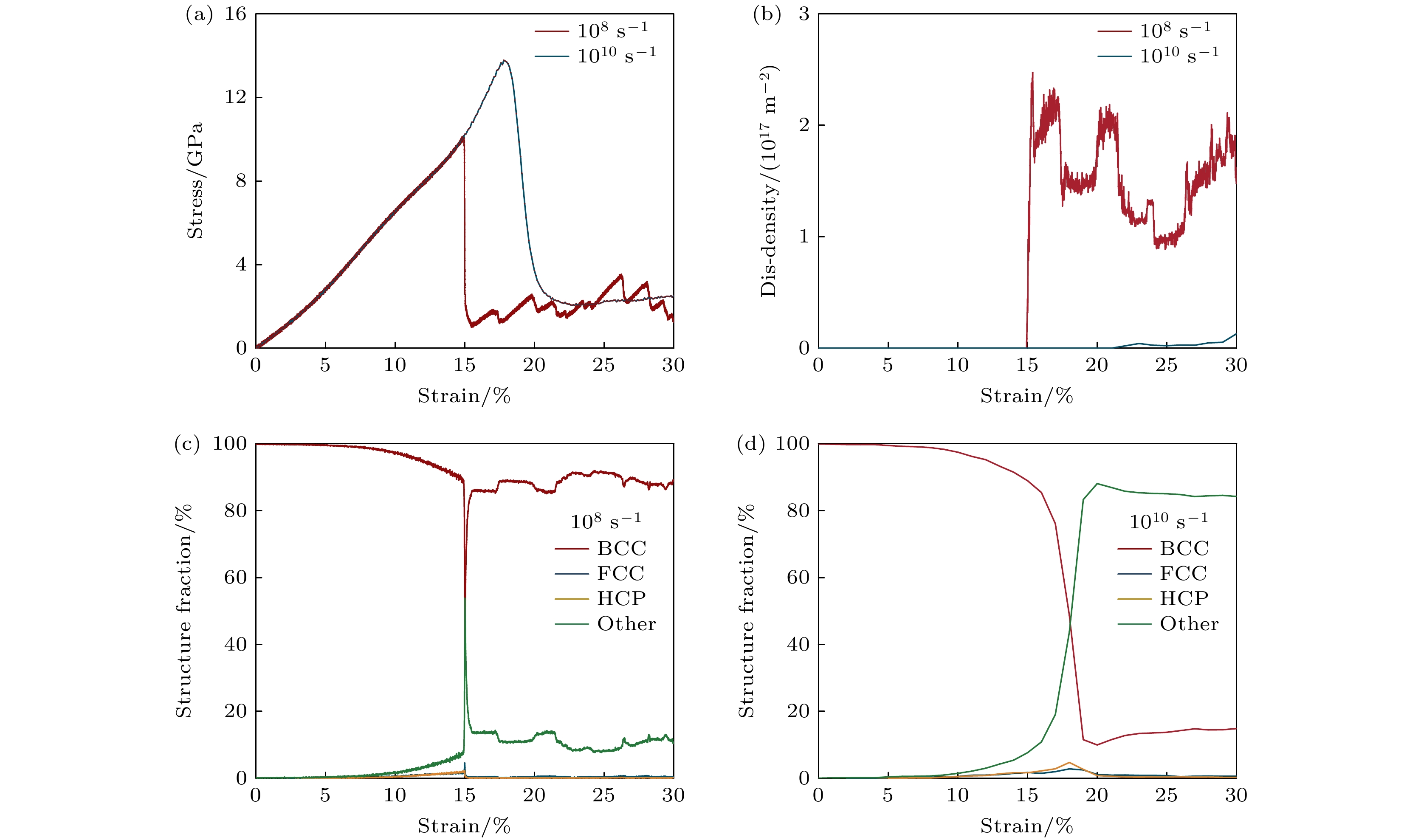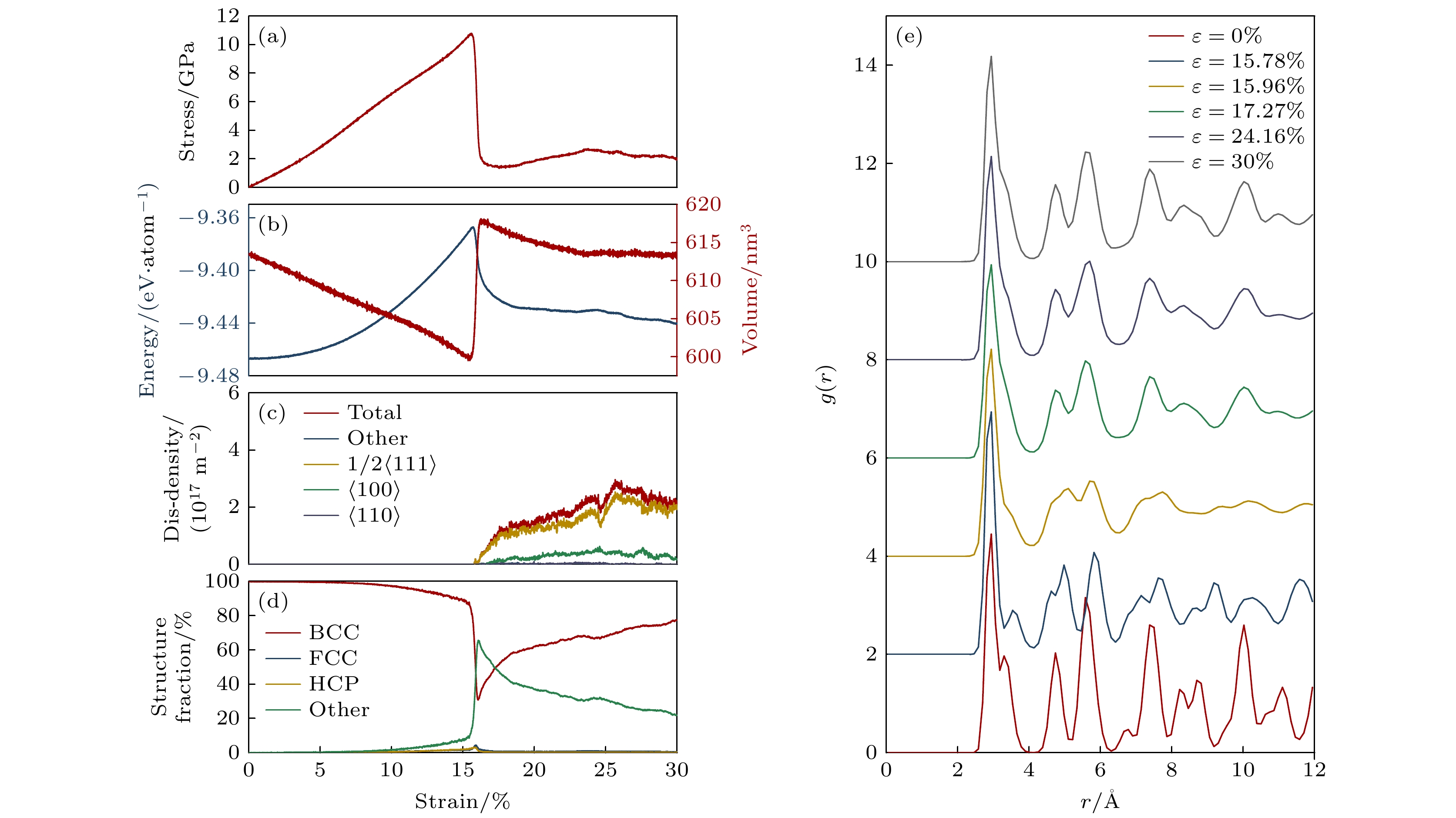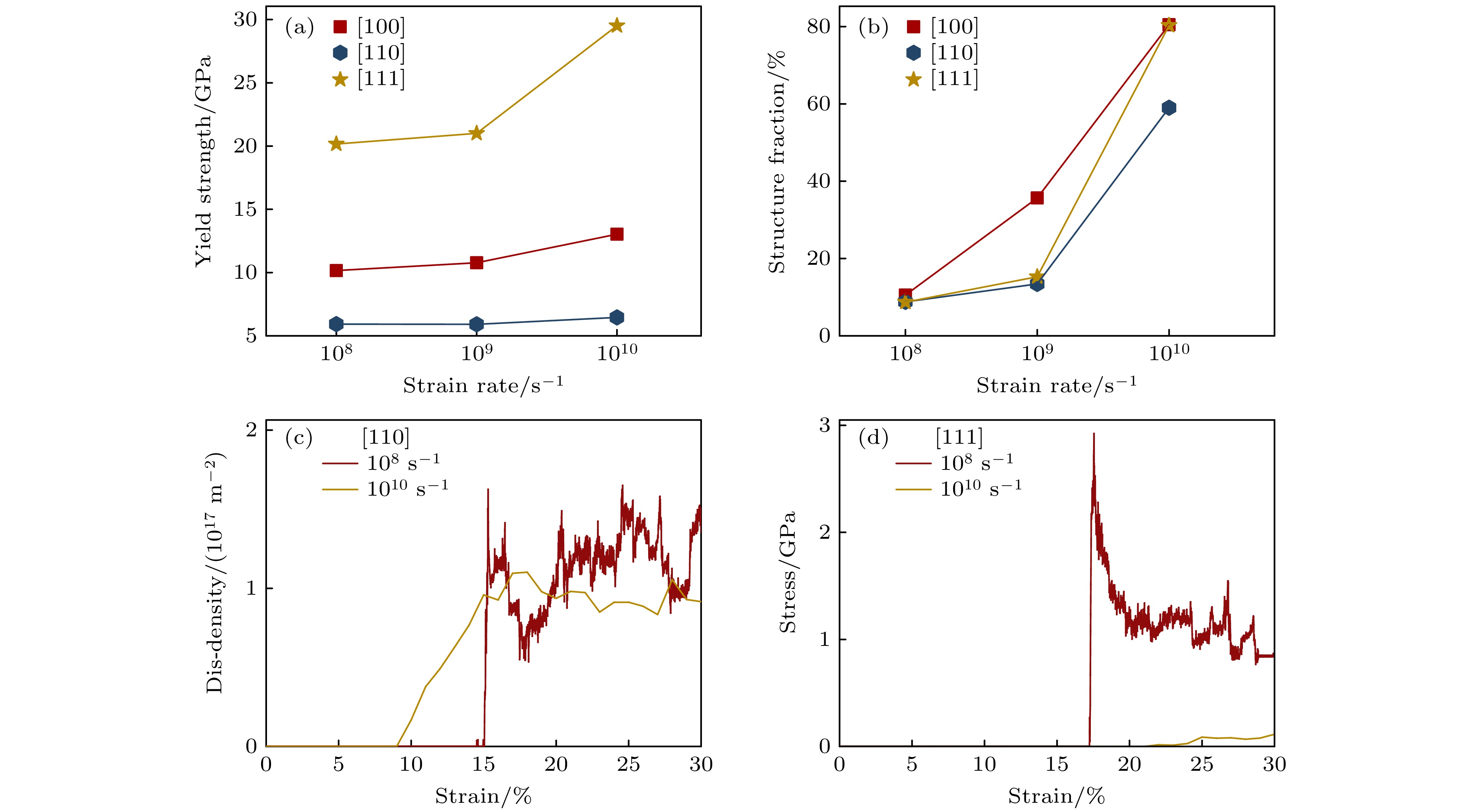 Refractory multi-principal element alloys (RMPEAs)have become a hotspot in materials science research in recent years due to their excellent high-temperature mechanical properties and broad application prospects. However, the unique deformation mechanisms and mechanical behaviors of the NbTaTiZr quaternary RMPEA under extreme conditions such as high temperature and high strain rate are still unclear, limiting its further design and engineering applications. In order to reveal in depth the dynamic response of this alloy on an atomic scale, this study develops a high-accuracy machine learning potential (MLP) for the NbTaTiZr quaternary alloy and combines it with large-scale molecular dynamics (MD) simulations to systematically investigate the effects of crystallographic orientation, strain rate, temperature, and chemical composition on the mechanical properties and microstructural evolution mechanisms of the alloy under compressive loading. The results show that the NbTaTiZr alloy exhibits significant mechanical and structural anisotropy during uniaxial compression. The alloy exhibits the highest yield strength when loaded along the [111] crystallographic direction, while it shows the lowest yield strength when compressed along the [110] direction, where twinning is more likely to occur. Under compression along the [100] direction, the primary deformation mechanisms include local disordering transitions and dislocation slip, with 1/2$ \left\langle{111}\right\rangle $ dislocations being the dominant type. When the strain rate increases to 1010 s–1, the yield strength of the alloy is significantly enhanced, accompanied by a notable increase in the proportion of amorphous or disordered structures, indicating that high strain rate loading suppresses dislocation nucleation and motion while promoting disordering transitions. Simulations at varying temperatures indicate that the alloy maintains a high strength level even at temperatures as high as 2100 K. Compositional analysis further indicates that increasing the atomic percentage of Nb or Ta effectively enhances the yield strength of the alloy, whereas an increase in Ti or Zr content adversely affects the strength. By combining MLP with MD methods, this study elucidates the anisotropic characteristics of the mechanical behavior and the strain rate dependence of disordering transitions in the NbTaTiZr RMPEA under combination of high strain rate and high temperature, providing an important theoretical basis and simulation foundation for optimizing and designing novel material under extreme environments.
