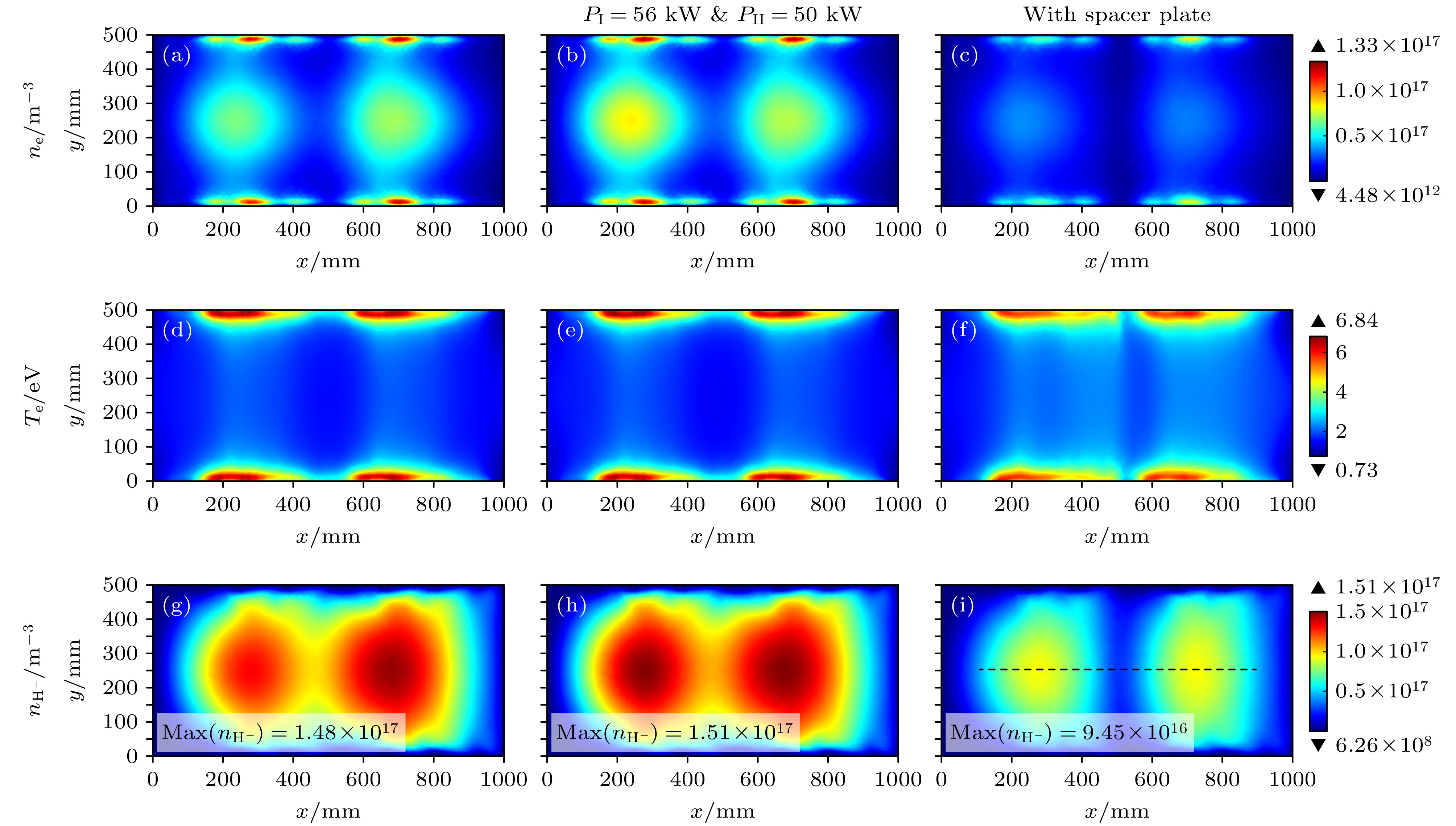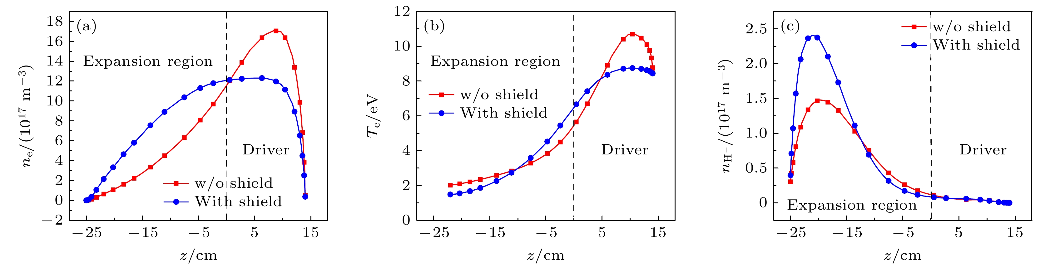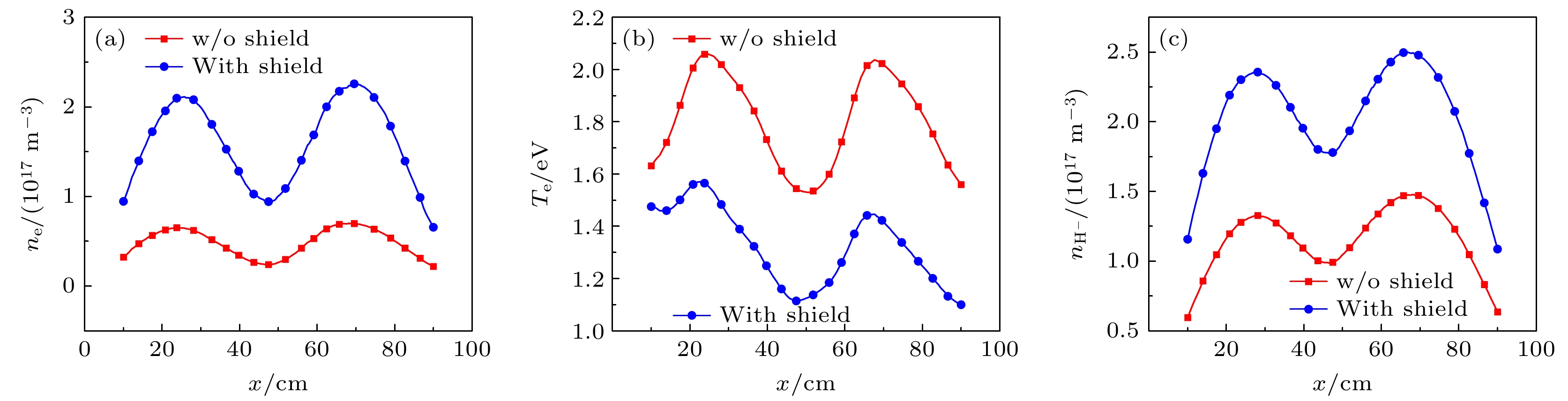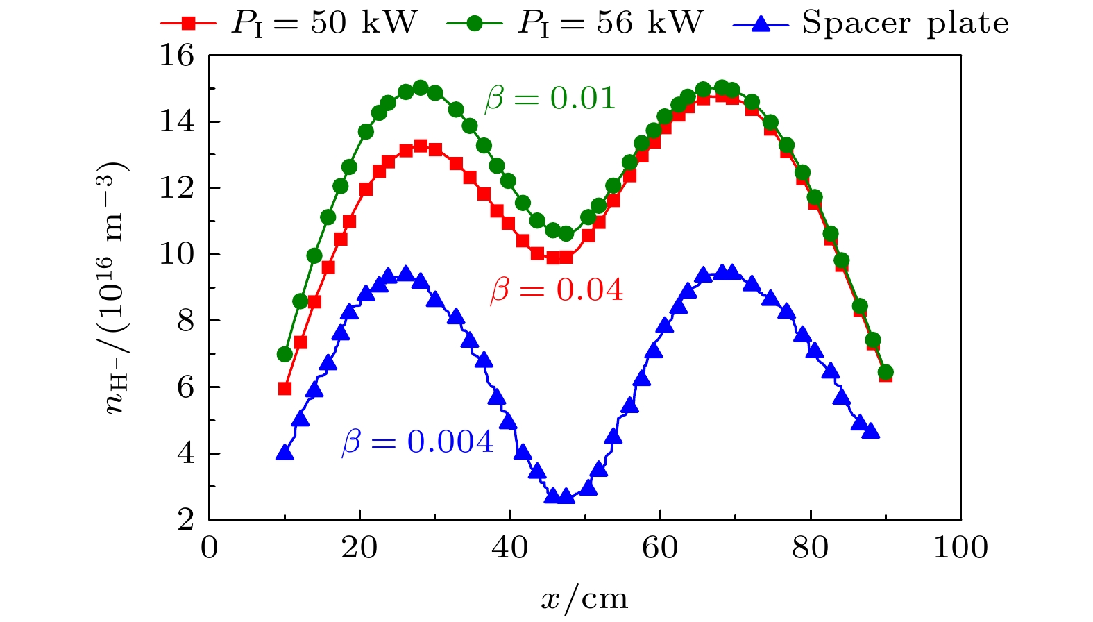 中性束注入是托卡马克装置中加热等离子体的主流辅助手段. 射频负氢离子源作为中性束注入系统的关键前端部件, 其性能直接影响中性束的质量. 目前, 提升负氢离子源性能仍是亟待深入研究的课题. 为此, 本文针对双驱动负氢离子源, 建立了一个三维流体模型, 用于模拟和优化表面产生机制下的负离子密度分布. 首先, 对比分析了体产生与表面产生两种机制下的等离子体参数, 结果表明表面产生机制获得的负离子密度比体产生机制高出1个数量级. 然而, 受过滤磁场影响, 引出区附近的负离子密度分布呈现不对称性. 为改善该不对称性, 在表面产生机制的基础上, 提出了两种优化方案: 1)在低密度侧增加射频源功率; 2)在扩散区引入隔板结构. 模拟结果显示, 两种方案均显著改善了负离子密度分布的对称性. 最后还提出了在扩散区背板添加磁屏蔽的方式来进一步优化负氢离子密度数值, 可以将扩散区下游的负离子密度提高69%.In neutral beam injection (NBI), which is a primary auxiliary heating method for tokamak plasmas, the negative hydrogen ion source (NHIS) functions as a critical front-end component governing neutral beam quality. The performance of NHIS remains a key challenge. This work presents a three-dimensional (3D) fluid model, which is developed for a double-driver NHIS to simulate and optimize surface-generated negative hydrogen ion density. A comparison of plasma parameters between the NHIS with Cs and without Cs shows that surface generation yields negative ion density one order of magnitude higher than volume generation. However, the presence of the magnetic filter field induces asymmetry in negative ion density within the extraction region. To improve this asymmetry, two approaches are proposed: 1) increasing the power of one of the drivers and 2) adding a spacer plate to the expansion region. After increasing the power of Driver I from 50 to 56 kW, the H– density asymmetry at the y = 25 cm intercept on the xy-plane (z = –22 cm) decreases from 0.04 to 0.01, and the value of H– density increases. Following the addition of a spacer plate, the H– density asymmetry further decreases to 0.004, but the value of H– density also shows a significant reduction. Finally, adding a magnetic shield to the back plate of the expansion region further optimizes H– density from 1.48×1017 m–3 to 2.50×1017 m–3, yielding a 69% increase downstream. This is because increased plasma transport into the expansion region enhances the dissociation rate of H2 molecules, thereby yielding more H atoms. The attenuation of the magnetic filter field in the driver region after adding a magnetic shield also enhances the symmetry of the H– density.