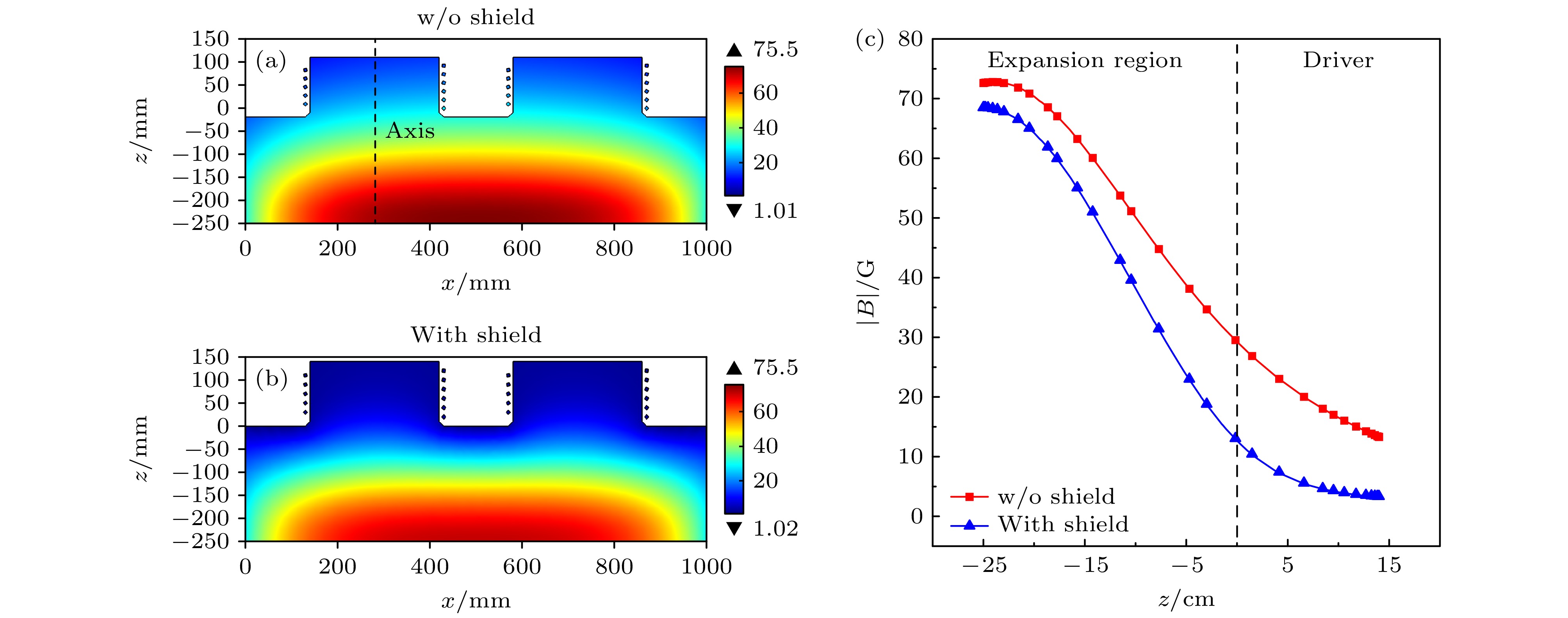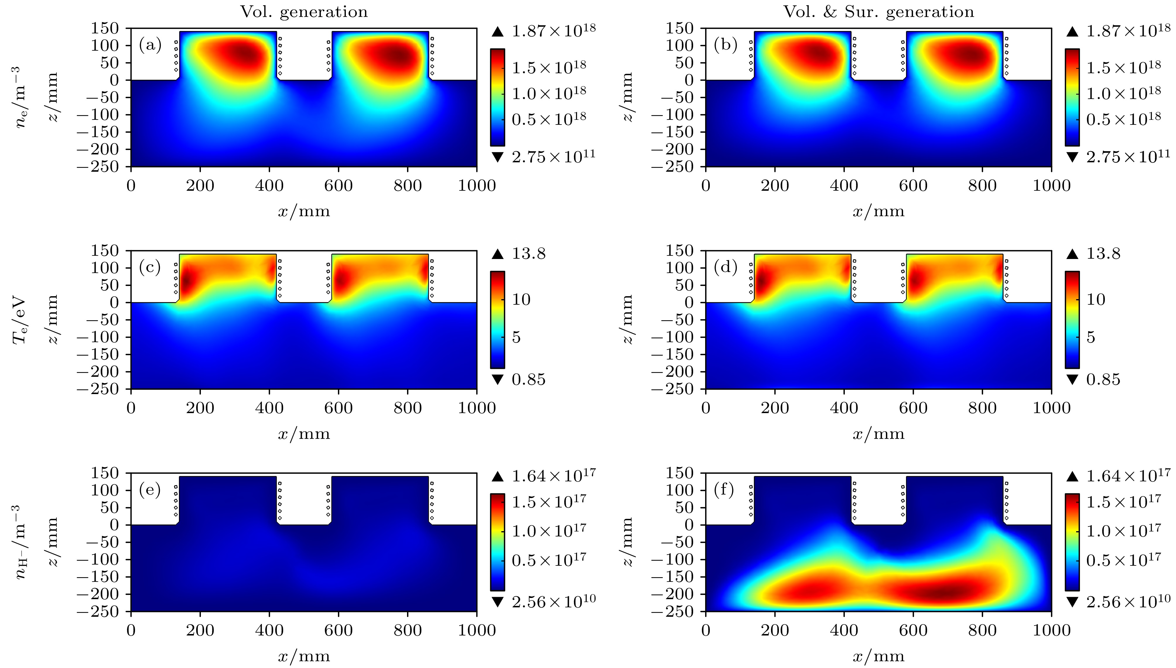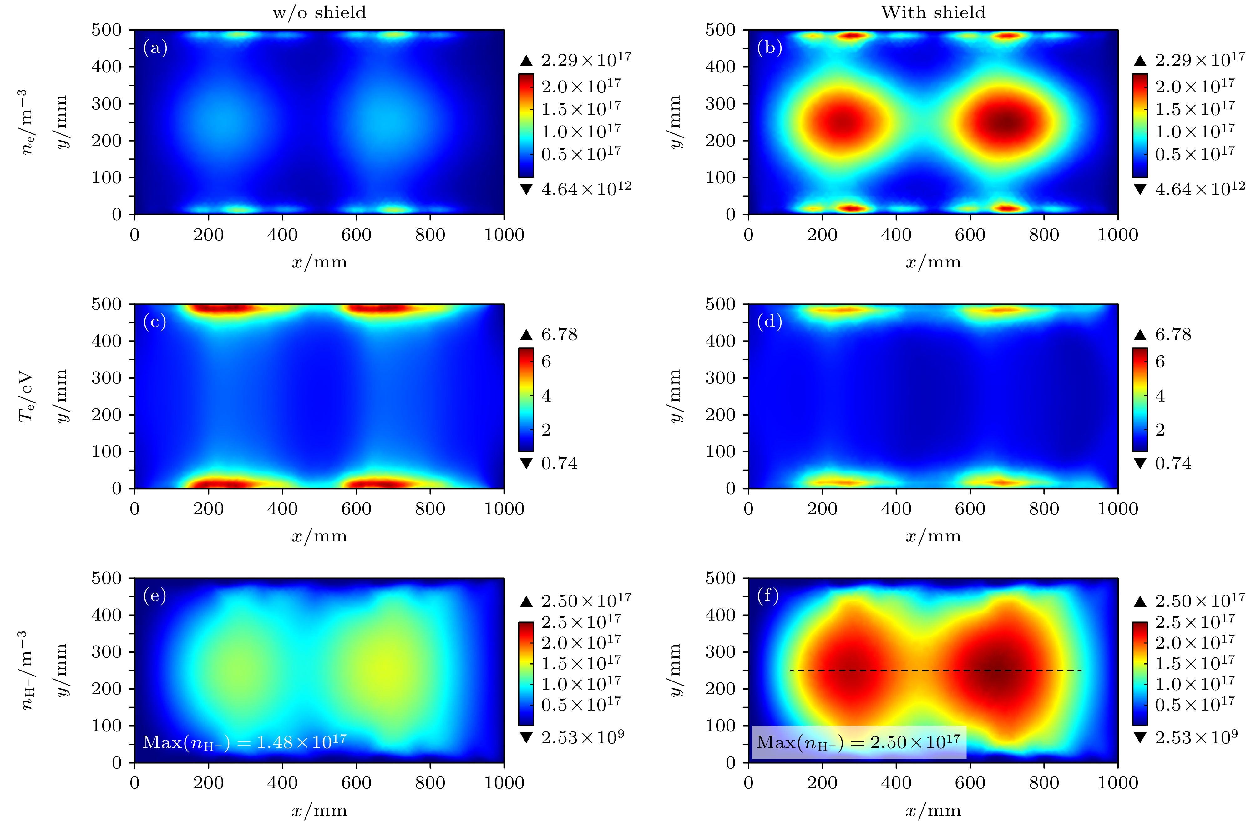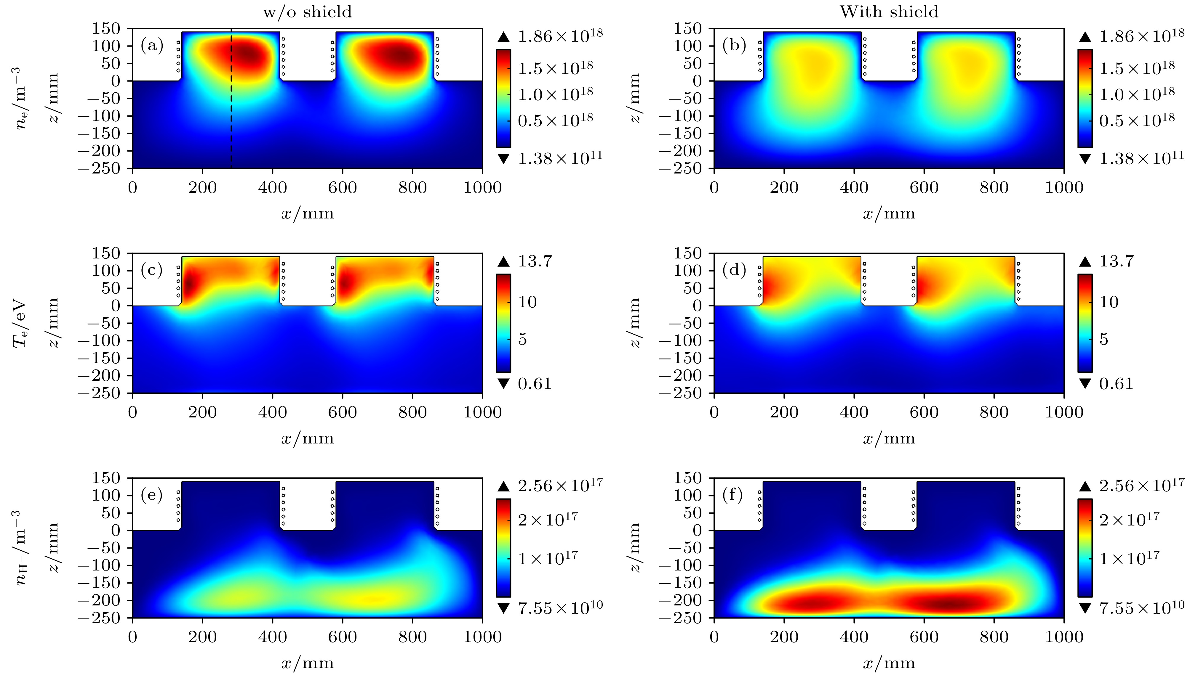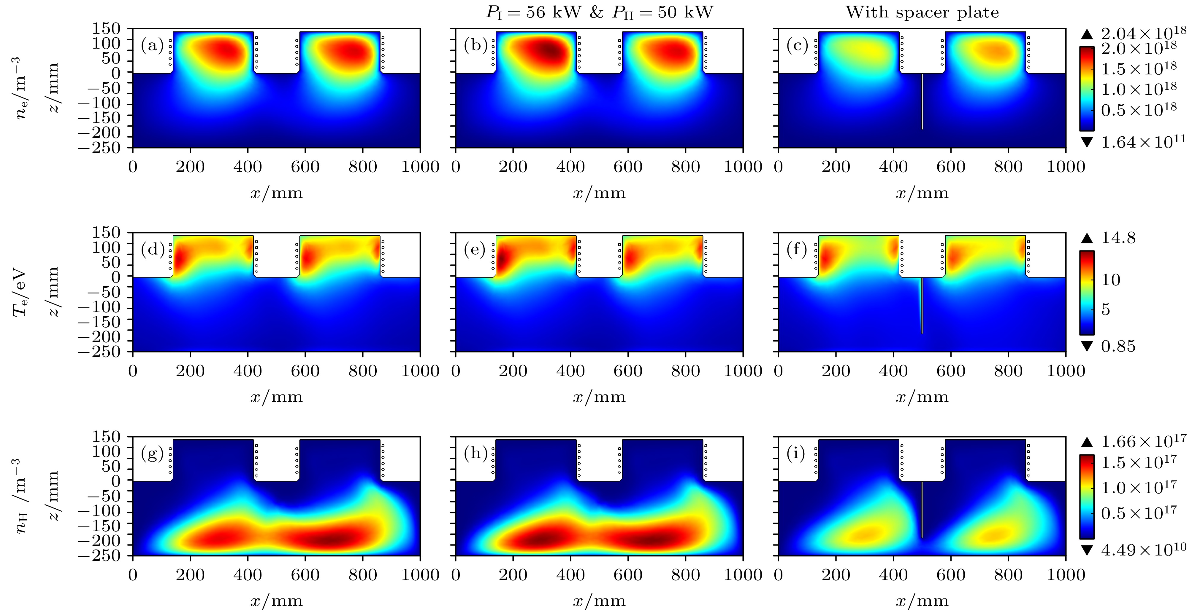 中性束注入是托卡马克装置中加热等离子体的主流辅助手段. 射频负氢离子源作为中性束注入系统的关键前端部件, 其性能直接影响中性束的质量. 目前, 提升负氢离子源性能仍是亟待深入研究的课题. 为此, 本文针对双驱动负氢离子源, 建立了一个三维流体模型, 用于模拟和优化表面产生机制下的负离子密度分布. 首先, 对比分析了体产生与表面产生两种机制下的等离子体参数, 结果表明表面产生机制获得的负离子密度比体产生机制高出1个数量级. 然而, 受过滤磁场影响, 引出区附近的负离子密度分布呈现不对称性. 为改善该不对称性, 在表面产生机制的基础上, 提出了两种优化方案: 1)在低密度侧增加射频源功率; 2)在扩散区引入隔板结构. 模拟结果显示, 两种方案均显著改善了负离子密度分布的对称性. 最后还提出了在扩散区背板添加磁屏蔽的方式来进一步优化负氢离子密度数值, 可以将扩散区下游的负离子密度提高69%.In neutral beam injection (NBI), which is a primary auxiliary heating method for tokamak plasmas, the negative hydrogen ion source (NHIS) functions as a critical front-end component governing neutral beam quality. The performance of NHIS remains a key challenge. This work presents a three-dimensional (3D) fluid model, which is developed for a double-driver NHIS to simulate and optimize surface-generated negative hydrogen ion density. A comparison of plasma parameters between the NHIS with Cs and without Cs shows that surface generation yields negative ion density one order of magnitude higher than volume generation. However, the presence of the magnetic filter field induces asymmetry in negative ion density within the extraction region. To improve this asymmetry, two approaches are proposed: 1) increasing the power of one of the drivers and 2) adding a spacer plate to the expansion region. After increasing the power of Driver I from 50 to 56 kW, the H– density asymmetry at the y = 25 cm intercept on the xy-plane (z = –22 cm) decreases from 0.04 to 0.01, and the value of H– density increases. Following the addition of a spacer plate, the H– density asymmetry further decreases to 0.004, but the value of H– density also shows a significant reduction. Finally, adding a magnetic shield to the back plate of the expansion region further optimizes H– density from 1.48×1017 m–3 to 2.50×1017 m–3, yielding a 69% increase downstream. This is because increased plasma transport into the expansion region enhances the dissociation rate of H2 molecules, thereby yielding more H atoms. The attenuation of the magnetic filter field in the driver region after adding a magnetic shield also enhances the symmetry of the H– density.