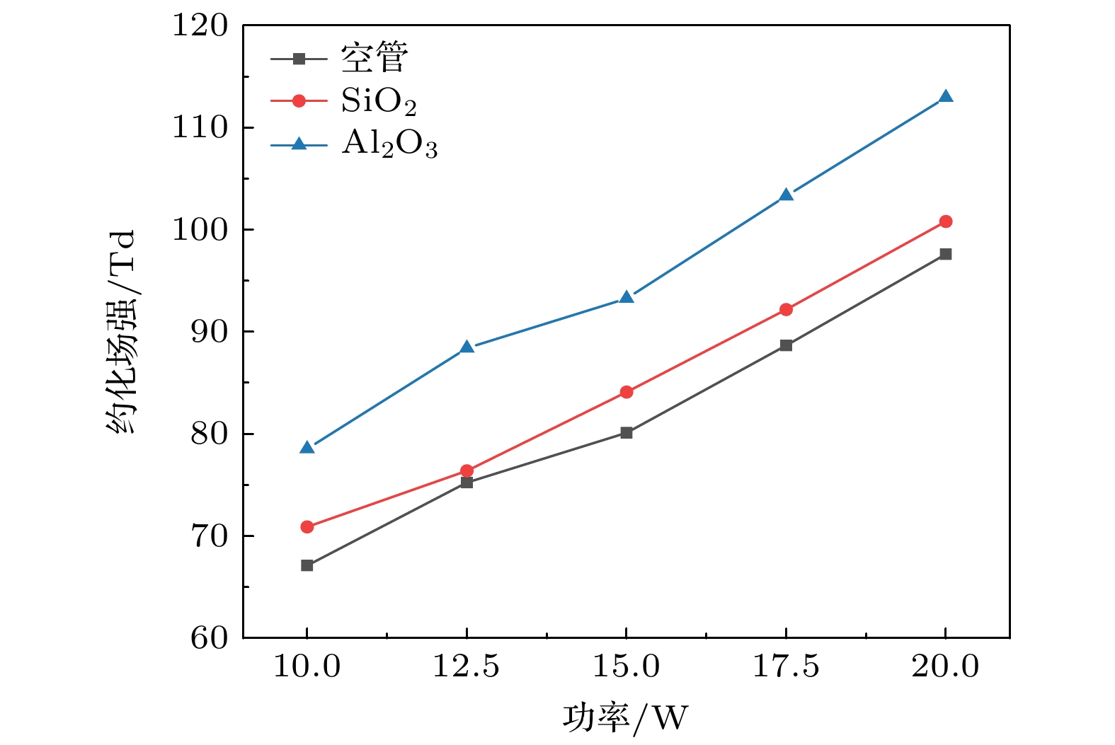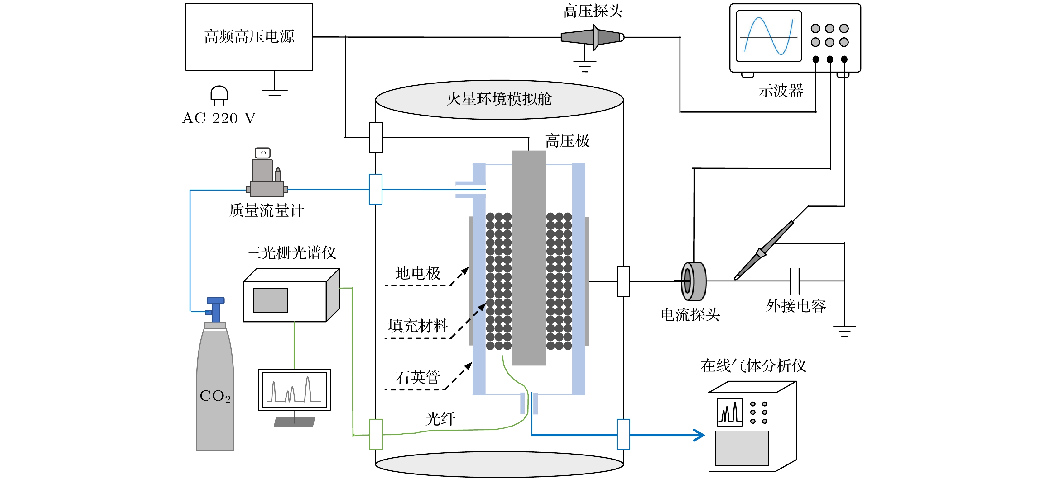The utilization of in-situ resource on Mars is currently one of the key research focuses in deep space exploration. Non-thermal plasma technology provides a promising approach for in-situ conversion of high-concentration CO2 in the Martian atmosphere, with advantages such as strong environmental adaptability and high system efficiency. In this study, a coaxial packed-bed dielectric barrier discharge reactor is employed to investigate the discharge characteristics of simulated Martian atmospheric CO2, with particular emphasis on the effects of SiO2 and Al2O3 packing materials on CO2 conversion performance and energy consumption. Through in-situ spectral diagnostics, the variation patterns of characteristic spectral lines of excited-state CO2 and O2 under different operating conditions are investigated in this work. It is found that increasing the discharge power promotes the generation of excited-state reactive species, which facilitates the activation and conversion of carbon dioxide. Furthermore, increasing the discharge power effectively enhances the electric field strength in CO2 discharge. Compared with plasma only and the use of SiO2 packing material, the system exhibits a more significant electric field enhancement effect when packed with Al2O3 beads. Based on numerical simulations, the electron impact reaction rate constant and electron energy distribution function of CO2 discharge are obtained. The results reveal that packing the discharge gap with Al2O3 material significantly changes the physical characteristics of CO2 discharge, enhances both the electric field strength and the mean electron energy, thereby generating more high-energy electrons and asymmetric vibrational excited states of CO2. This ultimately promotes the CO2 decomposition reaction for oxygen production. Finally, the study examines the effectiveness of CO2 decomposition for oxygen production under various typical operating conditions. It is demonstrated that increasing the discharge power and packing with Al2O3 both contribute to improving the CO2 conversion rate and oxygen production rate, while reducing the energy consumption of the reaction. The introduction of Al2O3 packing enhances the electric field strength, thereby improving CO2 conversion and O2 production, achieving a CO2 conversion rate of 12.18% and a minimum energy consumption of 0.36 kWh/g. This study provides theoretical and experimental support for the future applications of non-thermal plasma technology in the in-situ resource utilization of Martian atmosphere, offering insights into sustainable resource utilization in deep space exploration.