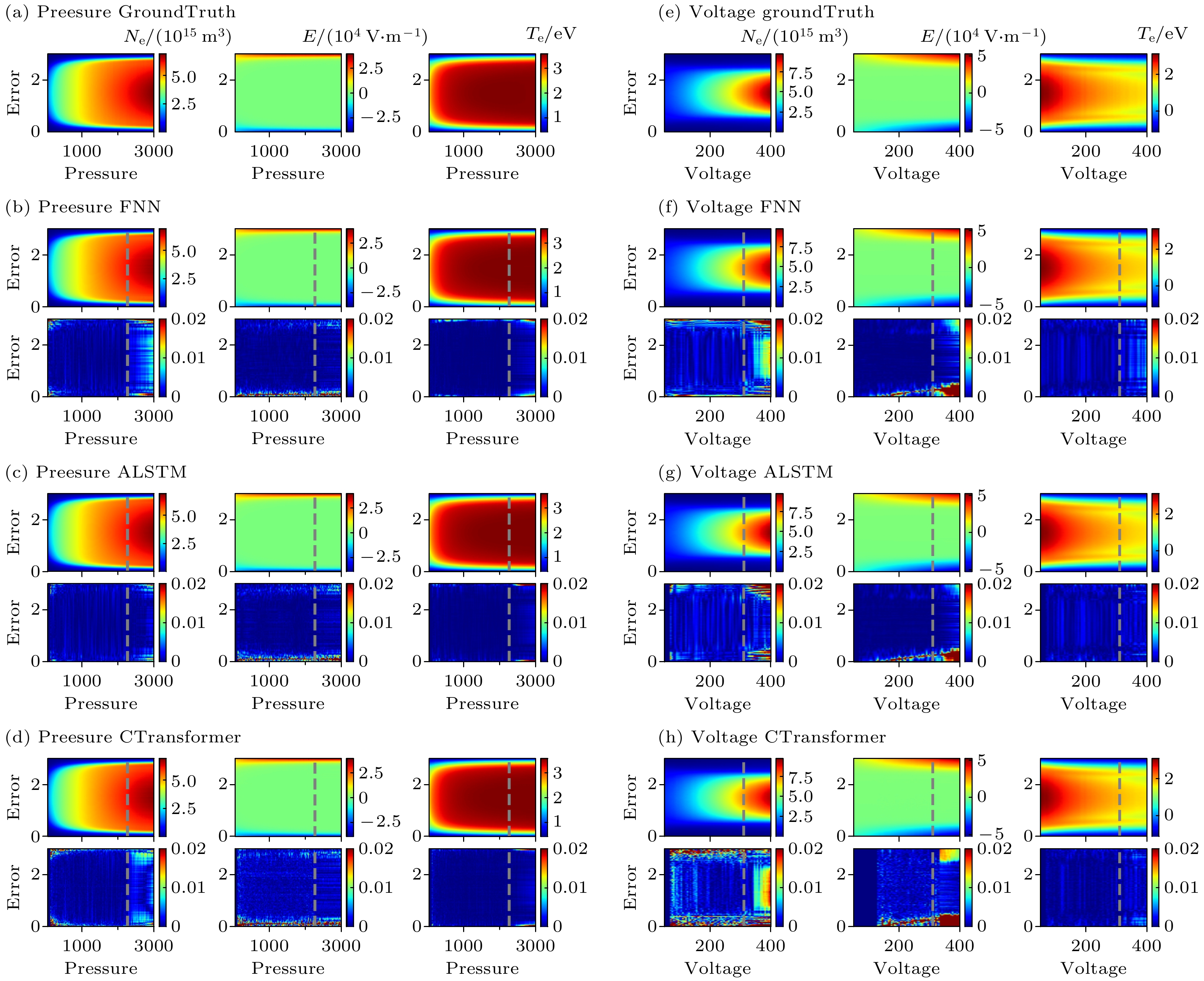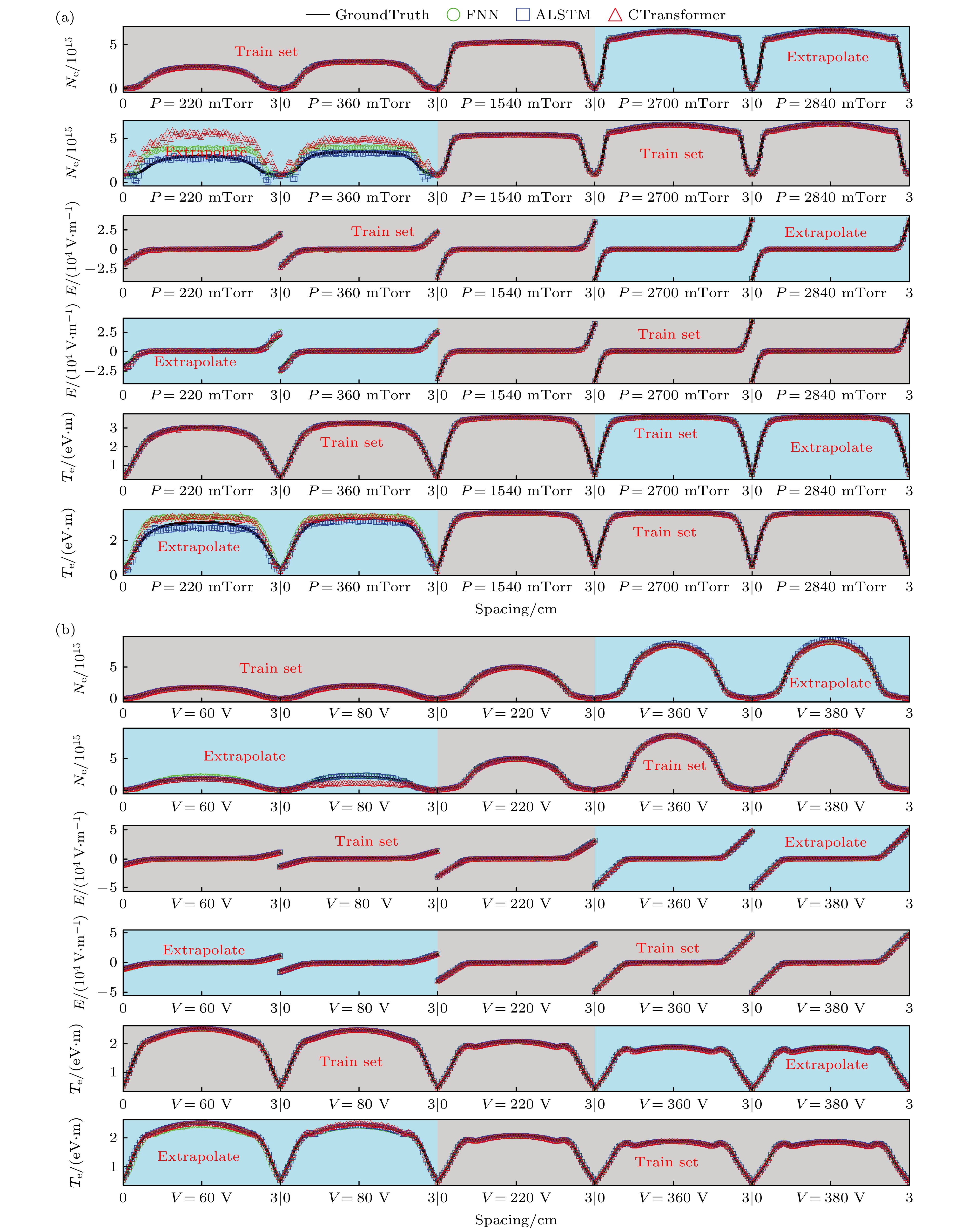 Fluid simulations of capacitively coupled plasmas (CCPs) are crucial for understanding their discharge physics, yet the high computational cost results in a major bottleneck. To overcome this limitation, we develop a deep learning-based surrogate model to replicate the output of a one-dimensional CCP fluid model with near-instantaneous inference speed. Through a systematic evaluation of three architectures, i.e. feedforward neural network (FNN), attention-enhanced long short-term memory network (ALSTM), and convolutional-transformer hybrid network (CTransformer) it is found that the sequence-structured ALSTM model can achieve the optimal balance between speed and accuracy, with an overall prediction error of only 1.73% for electron density, electric field, and electron temperature in argon discharge. This study not only achieves significant simulation acceleration but also reveals that the model can accurately extrapolate from low-pressure conditions dominated by complex non-local effects to high-pressure conditions governed by simple local behavior, whereas the reverse extrapolation fails. This finding suggests that training under low-pressure conditions enables the model to capture more comprehensive physical features. From the perspective of model weights, both low-pressure and high-pressure models assign important weights to the sheath region. However, the low-pressure model exhibits higher weight peaks in the sheath, indicating stronger ability to capture the essential physics of sheath dynamics. In contrast, the high-pressure model, because of its lower weighting in the sheath region, may fail to adequately resolve complex sheath dynamics when predicting under new operating conditions, thereby limiting its extrapolation capability with high fidelity. To ensure the reliability of this data-driven model in practical applications, we establish a trust boundary with a normalized mean absolute spatial error of 5% for model performance through systematic extrapolation experiments. When the model's extrapolation error falls below this threshold, the spatial distribution curves of predicted parameters such as electron density and electron temperature closely match the true physical distributions. However, once the error exceeds this critical point, systematic deviations such as morphological distortion and amplitude discrepancies begin to appear in the predicted spatial distributions, significantly deviating from the true physical laws. In the future, we will develop neural network models capable of processing high-dimensional spatial data and combining multi-dimensional input features such as various discharge gases, ultimately realizing a dedicated AI model for the field of capacitively coupled plasmas.