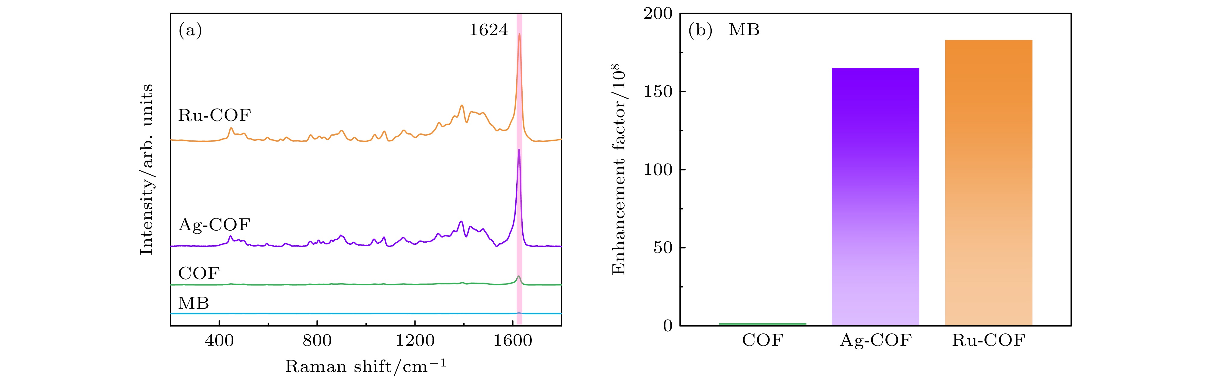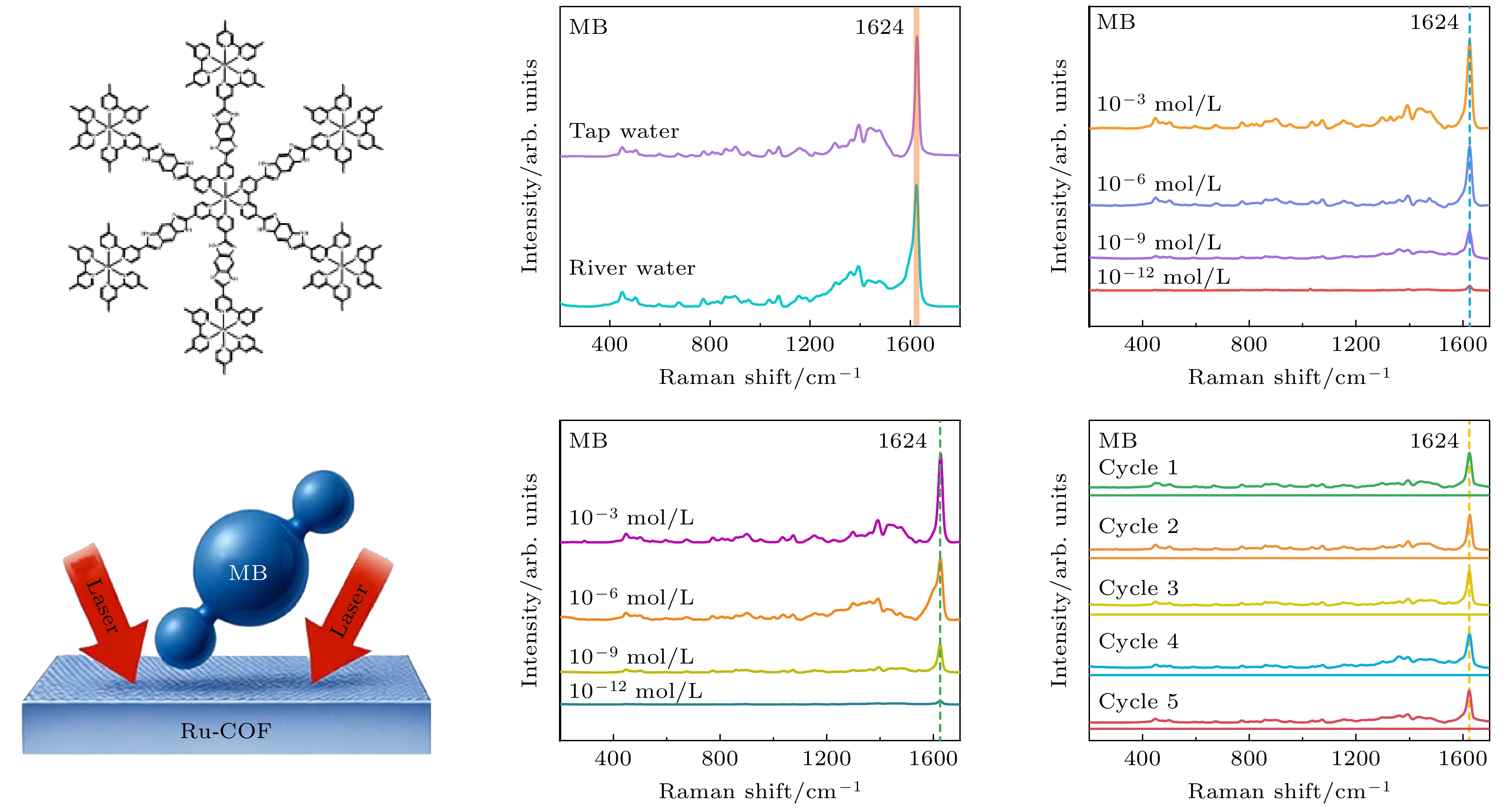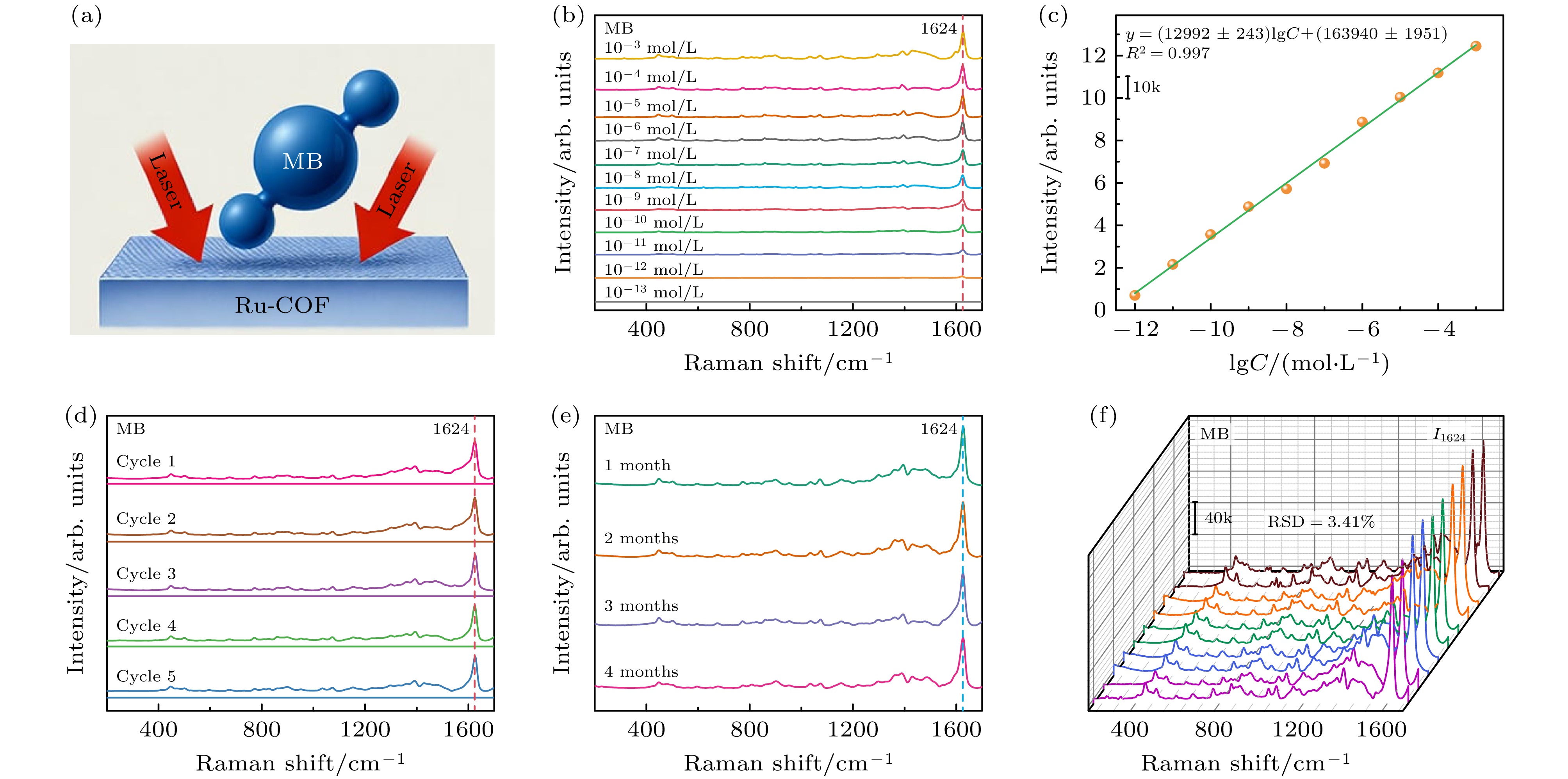 Covalent organic frameworks (COFs) have emerged as promising substrates for surface-enhanced Raman scattering (SERS) due to their highly ordered crystalline porous architecture, superior molecular adsorption and enrichment capabilities, and excellent thermal and chemical stability. However, pure COFs inherently lack plasmonic resonance and free electron density, resulting in limited electromagnetic enhancement and overall weak SERS signal, which hinders their practicality in ultrasensitive molecular detection applications. To overcome these limitations, this study aims to design and synthesize a novel ruthenium-based covalent organic framework composite (Ru-COF) by integrating ruthenium complexes directly into the COF skeleton, thereby creating a metal-organic, synergy-enhanced SERS substrate suited for trace analysis in real water. A Ru-COF is synthesized by solvothermal condensation of 1, 2, 4, 5-benzenetetramine (BTA·4HCl) with tris (4, 4'-dicarboxy-2, 2'-bipyridyl) ruthenium, forming Ru-N/O coordinated nodes within the framework. The material is characterizedusing X-ray diffraction (XRD) to confirm enhanced π-π stacking and new crystalline peaks at 10.2° and 16° in Ru-COF, Fourier-transform infrared spectroscopy (FT-IR) to verify amide and benzimidazole bond formations with shifts indicating Ru integration, Brunauer-Emmett-Teller (BET) analysis to reveal the increased specific surface areas (22.5 m2/g for Ru-COF vs. 17.2 m2/g for COF), and scanning electron microscopy (SEM) with energy-dispersive X-ray spectroscopy (EDS) mapping to show uniform distribution of C, N, O, and Ru elements in a dense layered morphology. SERS performance is evaluated using methylene blue (MB) as a probe molecule on a Renishaw InVia Raman spectrometer (514.5 nm excitation, 40 mW power, 10 s exposure), with additional tests on 4-mercaptobenzoic acid (4-MBA) for universality assessment. Enhancement mechanisms are analyzed through energy level alignments, with Ru-COF’s HOMO/LUMO at –0.95 eV/–1.12 eV (vs. vacuum) facilitating hole-injection charge transfer to MB’s levels (–2.34 eV/–4.15 eV), enhancing polarizability derivatives and Raman cross-sections via Herzberg-Teller coupling. The results demonstrate that Ru-COF exhibits superior SERS activity compared with pure COF and Ag-COF. For MB detection, the characteristic peak at 1624 cm–1 shows an analytical enhancement factor (EF) of 1.83 × 1010, calculated from normalized intensities and molecular densities, which far exceeds COF’s performance. Concentration-dependent spectra reveal a linear response from 10–3 to 10–13 mol/L (R2 = 0.997), with a limit of detection (LOD, S/N = 3) of 4.16 × 10–12 mol/L. Signal reproducibility is excellent, with a relative standard deviation (RSD) of 3.41% across 10 random spots. Cycling tests (5 repetitions) retain 90.2% of initial intensity, and long-term stability assessment shows 85.7% signal retention after four-months of air exposure. For 4-MBA, non-resonant enhancement yields an LOD of 10–12 mol/L, dominated by CM via interfacial coordination and π-π interactions. In complex matrices such as tap and river water, Ru-COF maintains LODs of 5.2 × 10–12 mol/L and 6.8 × 10–12 mol/L, respectively, with 91% signal retention after five cycles, demonstrating robust anti-interference against ions (e.g., Cl–, ${\rm SO}^{2-}_4 $) and organic impurities, attributed to the hydrophobic porous structure and stable Ru coordination. In conclusion, the Ru-COF composite represents a breakthrough in SERS substrate design by achieving ultrasensitive detection through EM-CM synergy, with key physical outcomes including high EF, sub-picomolar LODs, and exceptional spatiotemporal stability. This work provides a novel paradigm for metal-embedded COFs in plasmonic sensing and lays the groundwork for practical applications in environmental monitoring, food safety, and biomedical diagnostics.
