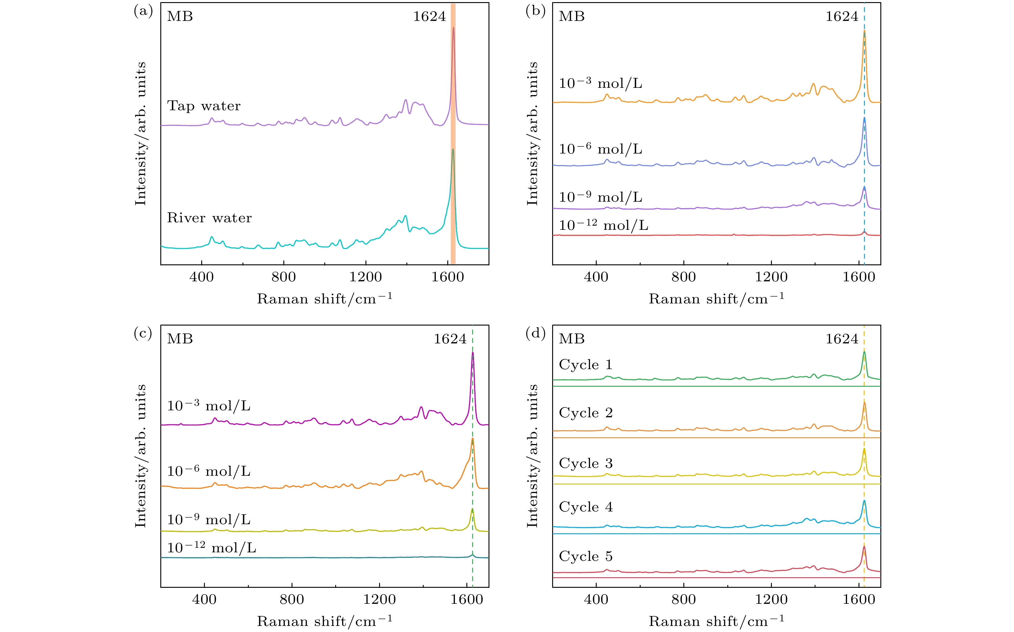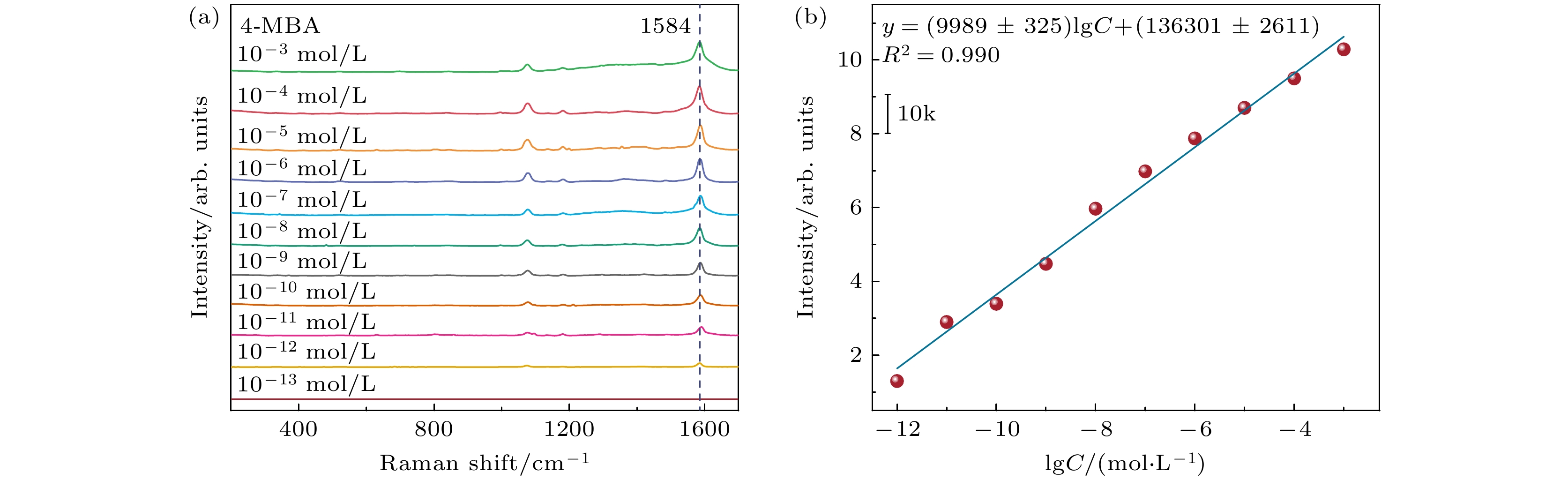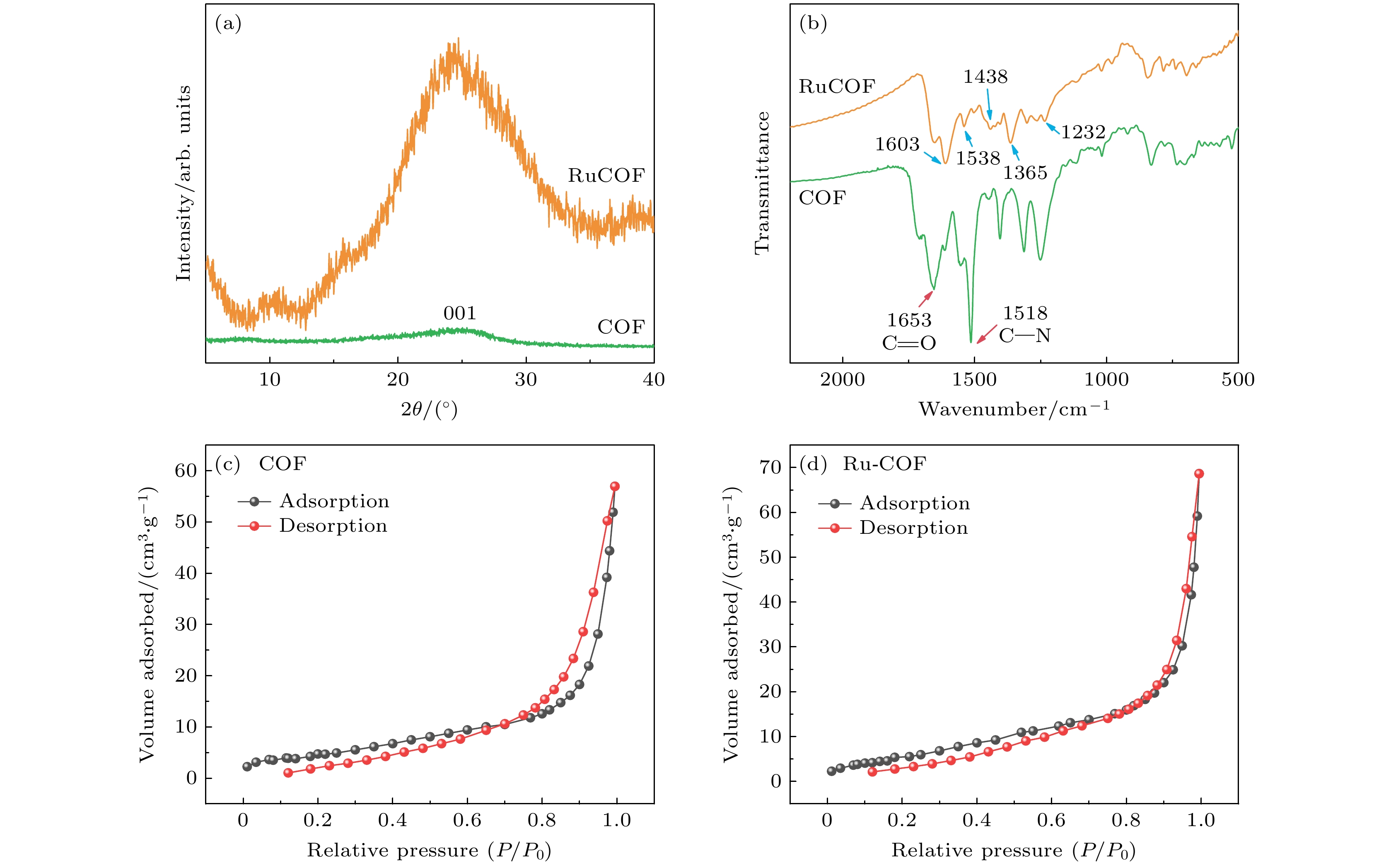 Covalent organic frameworks (COFs) have emerged as promising substrates for surface-enhanced Raman scattering (SERS) due to their highly ordered crystalline porous architecture, superior molecular adsorption and enrichment capabilities, and excellent thermal and chemical stability. However, pure COFs inherently lack plasmonic resonance and free electron density, resulting in limited electromagnetic enhancement and overall weak SERS signal, which hinders their practicality in ultrasensitive molecular detection applications. To overcome these limitations, this study aims to design and synthesize a novel ruthenium-based covalent organic framework composite (Ru-COF) by integrating ruthenium complexes directly into the COF skeleton, thereby creating a metal-organic, synergy-enhanced SERS substrate suited for trace analysis in real water. A Ru-COF is synthesized by solvothermal condensation of 1, 2, 4, 5-benzenetetramine (BTA·4HCl) with tris (4, 4'-dicarboxy-2, 2'-bipyridyl) ruthenium, forming Ru-N/O coordinated nodes within the framework. The material is characterizedusing X-ray diffraction (XRD) to confirm enhanced π-π stacking and new crystalline peaks at 10.2° and 16° in Ru-COF, Fourier-transform infrared spectroscopy (FT-IR) to verify amide and benzimidazole bond formations with shifts indicating Ru integration, Brunauer-Emmett-Teller (BET) analysis to reveal the increased specific surface areas (22.5 m2/g for Ru-COF vs. 17.2 m2/g for COF), and scanning electron microscopy (SEM) with energy-dispersive X-ray spectroscopy (EDS) mapping to show uniform distribution of C, N, O, and Ru elements in a dense layered morphology. SERS performance is evaluated using methylene blue (MB) as a probe molecule on a Renishaw InVia Raman spectrometer (514.5 nm excitation, 40 mW power, 10 s exposure), with additional tests on 4-mercaptobenzoic acid (4-MBA) for universality assessment. Enhancement mechanisms are analyzed through energy level alignments, with Ru-COF’s HOMO/LUMO at –0.95 eV/–1.12 eV (vs. vacuum) facilitating hole-injection charge transfer to MB’s levels (–2.34 eV/–4.15 eV), enhancing polarizability derivatives and Raman cross-sections via Herzberg-Teller coupling. The results demonstrate that Ru-COF exhibits superior SERS activity compared with pure COF and Ag-COF. For MB detection, the characteristic peak at 1624 cm–1 shows an analytical enhancement factor (EF) of 1.83 × 1010, calculated from normalized intensities and molecular densities, which far exceeds COF’s performance. Concentration-dependent spectra reveal a linear response from 10–3 to 10–13 mol/L (R2 = 0.997), with a limit of detection (LOD, S/N = 3) of 4.16 × 10–12 mol/L. Signal reproducibility is excellent, with a relative standard deviation (RSD) of 3.41% across 10 random spots. Cycling tests (5 repetitions) retain 90.2% of initial intensity, and long-term stability assessment shows 85.7% signal retention after four-months of air exposure. For 4-MBA, non-resonant enhancement yields an LOD of 10–12 mol/L, dominated by CM via interfacial coordination and π-π interactions. In complex matrices such as tap and river water, Ru-COF maintains LODs of 5.2 × 10–12 mol/L and 6.8 × 10–12 mol/L, respectively, with 91% signal retention after five cycles, demonstrating robust anti-interference against ions (e.g., Cl–, ${\rm SO}^{2-}_4 $) and organic impurities, attributed to the hydrophobic porous structure and stable Ru coordination. In conclusion, the Ru-COF composite represents a breakthrough in SERS substrate design by achieving ultrasensitive detection through EM-CM synergy, with key physical outcomes including high EF, sub-picomolar LODs, and exceptional spatiotemporal stability. This work provides a novel paradigm for metal-embedded COFs in plasmonic sensing and lays the groundwork for practical applications in environmental monitoring, food safety, and biomedical diagnostics.