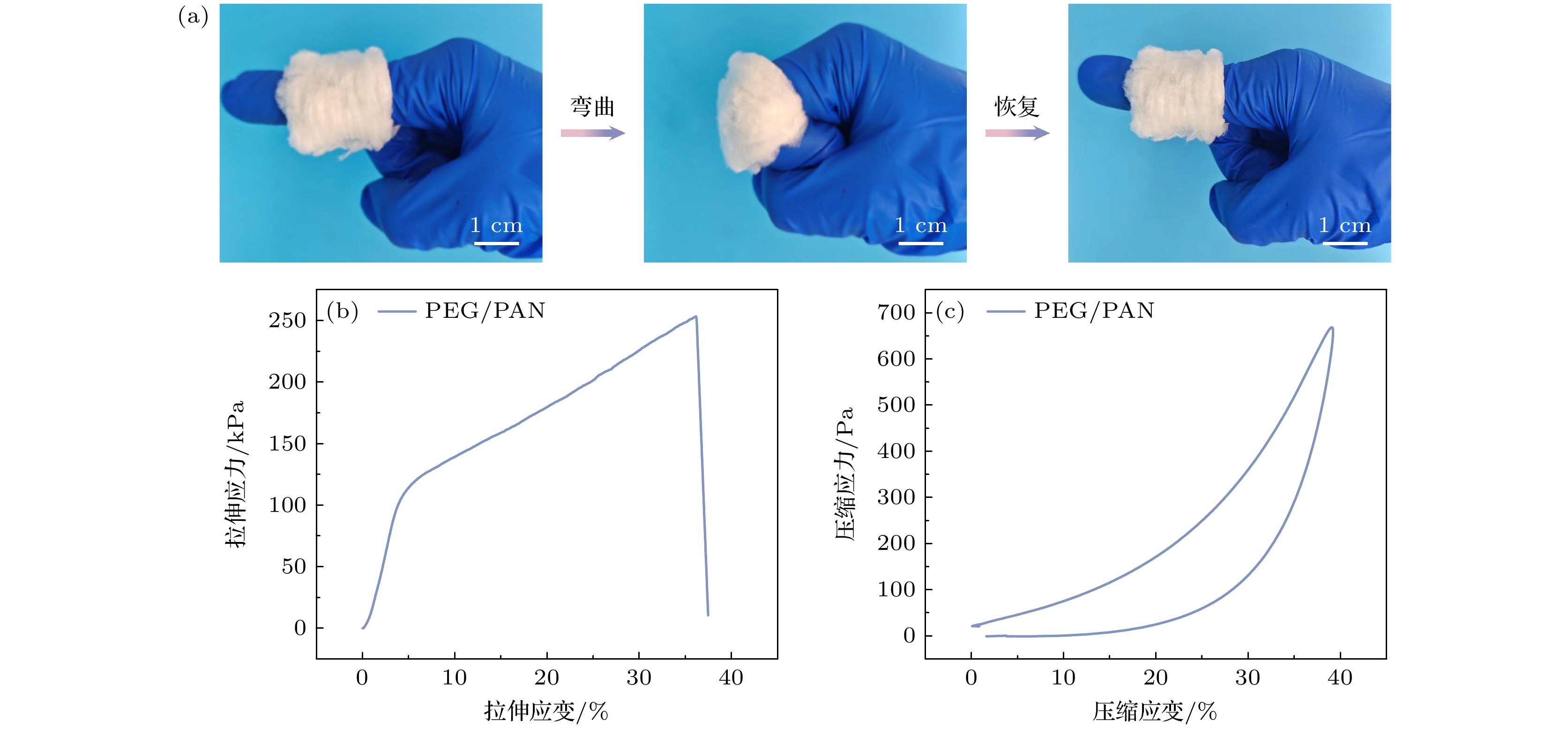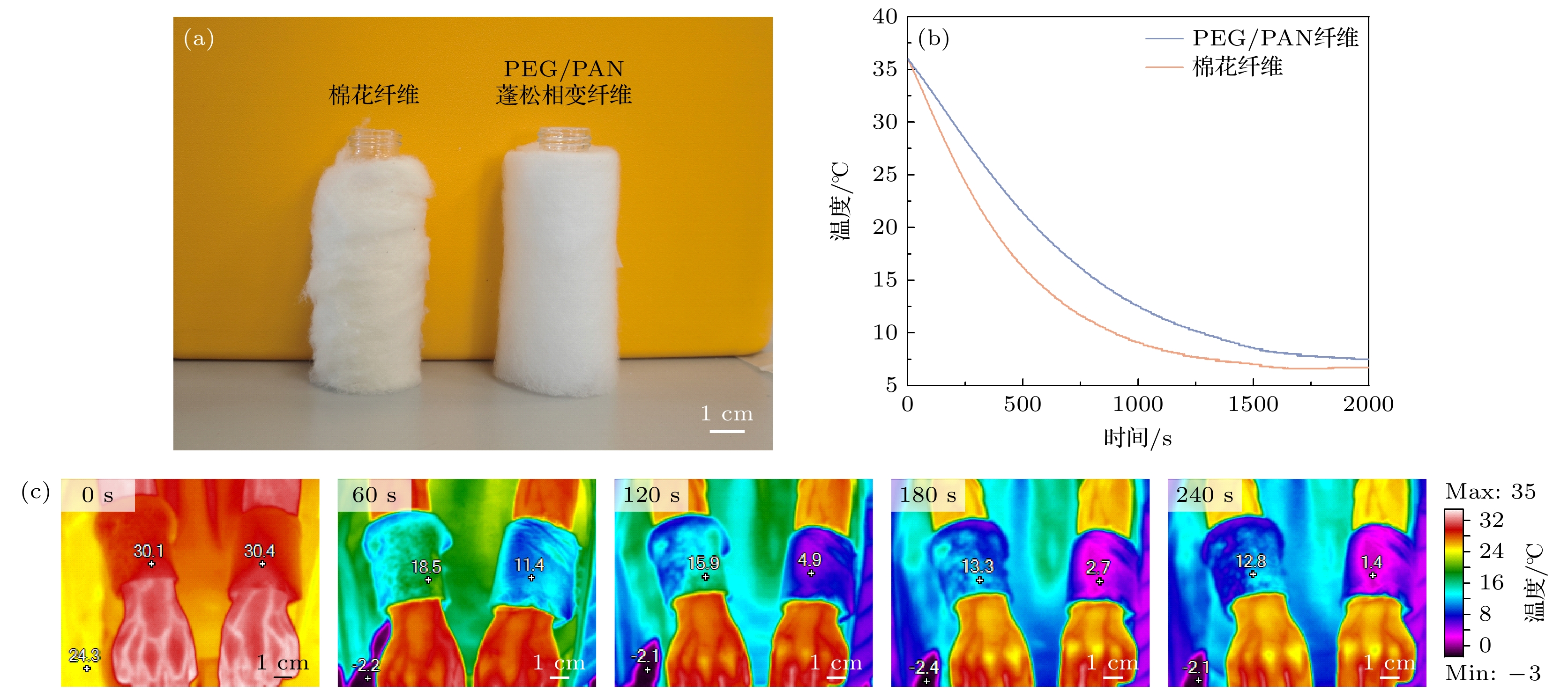 相变纤维作为人体热量管理领域的新型功能材料, 其应用价值日益凸显. 然而, 现有研究体系存在显著的局限性: 基于湿法纺丝工艺制备的单根相变纤维和静电纺丝技术构建的相变纤维薄膜, 因其结构致密性不足导致隔热性能欠佳, 难以有效阻遏寒冷环境下的体温散失. 针对这一技术瓶颈, 本研究突破传统材料体系限制, 创新性地采用静电纺丝技术将聚乙二醇引入聚丙烯腈纤维体系, 通过非溶剂诱导相分离过程, 成功制备出兼具相变温度调节特性和高效隔热性能的蓬松结构相变纤维. 蓬松纤维内部形成的多孔结构可构建高效冷屏蔽层, 其热导率低至0.0395 W/(m·K); 同时, 聚乙二醇相变组分赋予材料优异的相变潜热(80.6 J/g), 实现了温度调节与隔热保温的协同作用. 该材料表现出优异的结构与热稳定性, 在经历500次热循环后仍保持稳定的相变性能, 并在温度低于300 ℃时具备良好的热可靠性. 即使在相变熔点以上, 材料仍能有效防止相变组分泄漏. 同时, 其良好的机械性能可满足弯曲、压缩(668.7 Pa)及拉伸(253.5 kPa)等多种形变需求, 未发生结构塌陷. 人体热管理实验进一步证实, 其冷防护性能显著优于传统棉花材料. 本研究不仅提供了一种“储热-隔热”一体化纤维的创新制备方案, 更从原理上拓展了相变纤维在热管理中的设计维度, 为开发高性能可穿戴冷防护材料提供重要的解决方案和理论指导.Phase change fibers, as an advanced functional material for human body thermal management, have significant potential for practical applications. However, current research systems face critical limitations: traditional phase change fibers prepared via wet spinning and electrospun phase change fiber films encounter insufficient thermal insulation due to their structural compactness deficiencies, thereby failing to effectively prevent body heat loss in cold environments. To tackle this technical challenge, this work breaks through traditional material system limitations by innovatively employing electrospinning technology to integrate polyethylene glycol (PEG) into polyacrylonitrile (PAN) fiber systems. We successfully fabricate fluffy-tructured phase change fibers that integrate both phase change thermoregulation and thermal insulation functions using the principle of non-solvent-induced phase separation. The internal porous structure of the fluffy fibers constructs an effective cold protection layer, exhibiting an ultra-low thermal conductivity of 0.0395 W/m·K. At the same time, the PEG phase change componentprovides a high latent heat of 80.6 J/g, achieving a synergistic effect of temperature regulation and thermal insulation. The material exhibits excellent structural and thermal stability: maintaining stable phase change performance after 500 thermal cycles and exhibiting exceptional thermal reliability up to 300 ℃. Even above the phase change melting point, the material effectively prevents leakage of the phase change component. Furthermore, it possesses sufficient mechanical properties to withstand various deformations such as bending, compression (668.7 Pa), and stretching (253.5 kPa) without structural collapse. Practical application evaluations further demonstrate that the material’s cold protection performance significantly exceeds that of natural cotton. This study not only provides an innovative strategy for fabricating integrated “heat storage-thermal insulation” fibers, but also conceptually expands the design dimensions of phase change fibers in thermal management, offering important solutions and theoretical guidance for developing high performance wearable cold-protection materials.