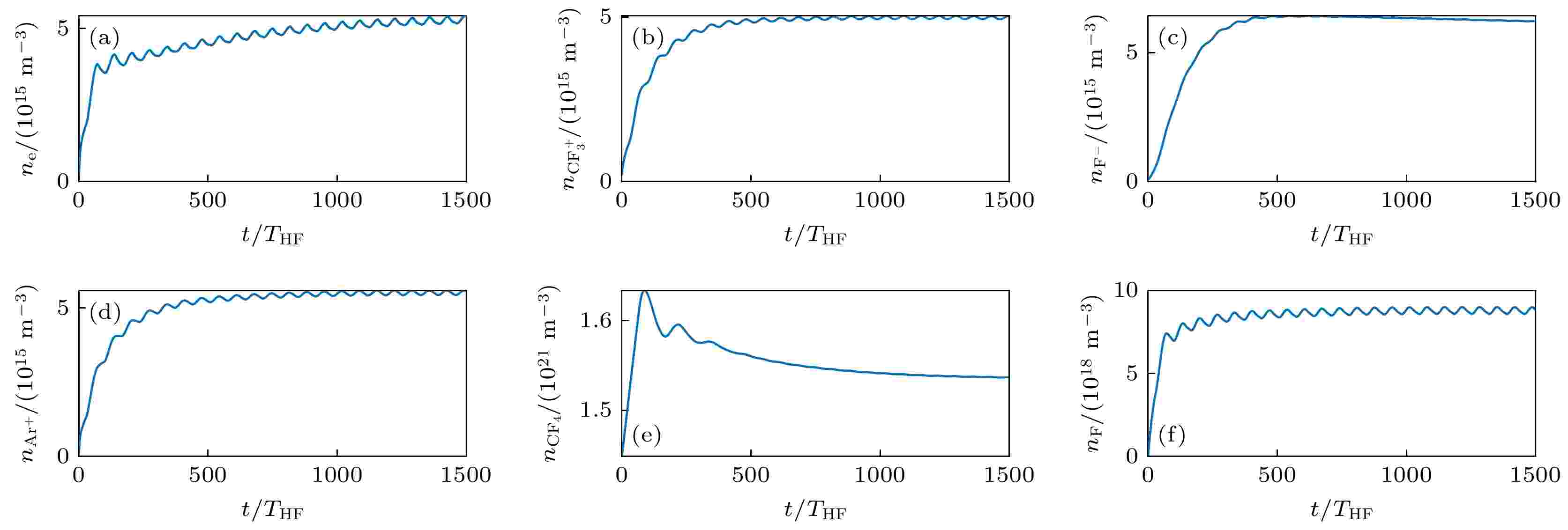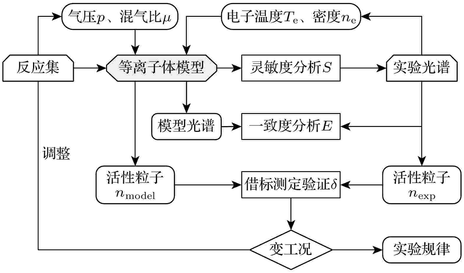 以C4F8为代表的碳氟等离子体因其可精细调控的F/C比、高活性自由基密度及优异的材料选择性, 已成为纳米级半导体刻蚀与沉积工艺的核心介质. 高深宽比刻蚀中, 发射光谱诊断将影响形貌的活性粒子密度与光谱特征关联实现原位监测, 为精度与良率协同优化提供有效途径. 其中, 兼具动力学模拟与光谱分析的等离子体模型是必不可少的. 本文建立了一种适用于发射光谱在线分析的C4F8/O2/Ar等离子体模型. 通过C4F8分解路径与碳氟自由基氧化机制分析, 精炼了化学反应全集. 在此基础上, 加入了F, CF, CF2, CO以及Ar与O的激发态能级的碰撞辐射过程, 与光谱特征建立了关联. 分析了典型感应耦合放电条件下活性粒子演化规律, 并与实验数据进行了验证. 结合动力学溯源, 阐明了碳氟自由基与离子的产生损失机制, 并讨论了可能存在的误差来源. 该模型具有在实际刻蚀工艺场景中发射光谱在线监测的应用前景.
