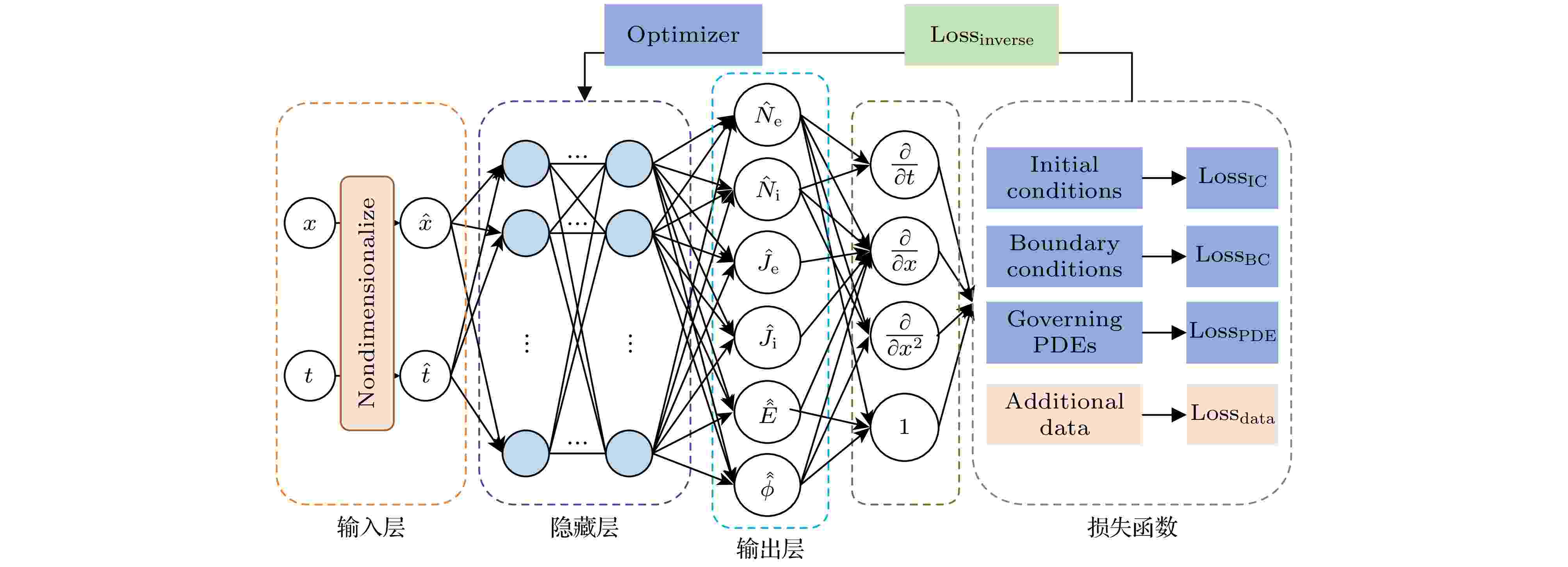 低温等离子体的反问题是指根据等离子体的密度、电场等物理特性来反演电压幅值、频率等放电参数, 反问题的求解是对等离子体进行智能控制的重要前提, 在流体描述的框架下, 基于传统的离散化方法来求解反问题往往是非常困难的. 本文引入物理信息神经网络(physics-informed neural networks, PINNs)对大气压射频等离子体的反问题进行求解, 把连续性方程、泊松方程及漂移扩散近似等主要控制方程与作为待求解放电参数的电压幅值与频率, 及额外的电场数据这3部分作为约束嵌入PINNs的损失函数中. 经过训练后, PINNs可以实现对电压幅值与频率等放电参数的精确反演, 且可以保证误差均在1%以内, 同时也可以完整地输出密度、电场、通量等物理量的时空演化. 为进一步优化额外数据对PINNs计算的影响, 本文还深入分析了电场数据的采样位置、采样数量以及噪声水平对反演电压幅值与频率的效果. 本研究表明, PINNs能够在给定实验或计算数据条件下, 实现射频等离子体放电参数的精准反演及等离子体物理特性的精确计算, 从而为推进对等离子体的智能控制打下基础.