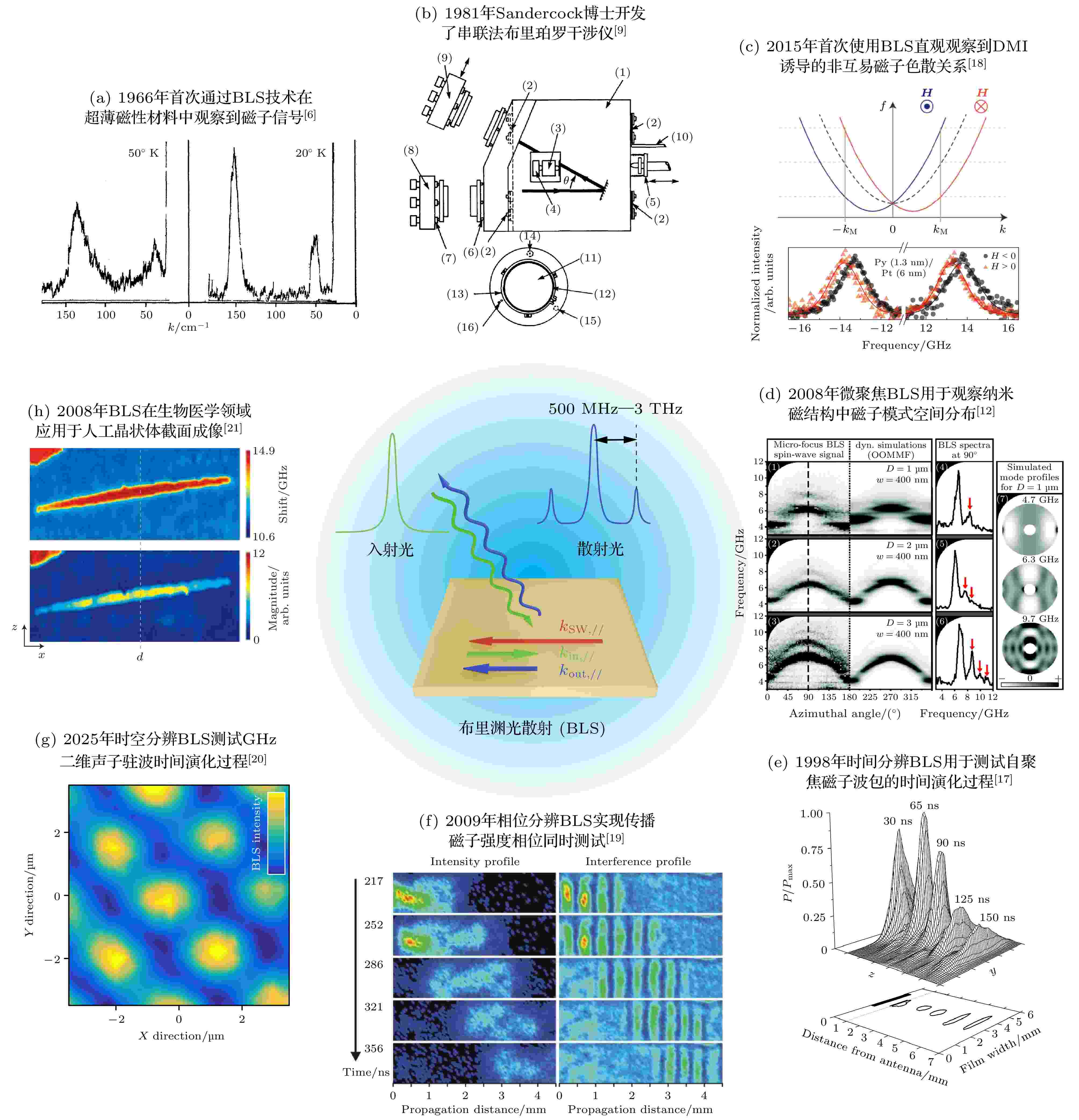 综述了布里渊光散射(Brillouin light scattering, BLS)技术的基本原理、发展历程及实验装置演化, 并深入探讨了其在现代科学研究中的多领域应用. BLS技术基于光子与材料中元激发(如磁子、声子)的非弹性散射过程, 通过精确测量散射光的频移, 可获取这些准粒子的能量、动量及相互作用等关键物理信息. 自1914年布里渊首次提出理论预测以来, BLS技术经历了显著的技术演进: 从早期仅能实现单一波矢的选择性测量, 逐步发展为兼具微米级空间分辨率、纳秒时间分辨率和相位测量能力的高精度表征手段. 这一技术演化过程不仅拓展了布里渊光散射在凝聚态物理研究中的应用范围, 更使其成为研究磁子动力学和声子输运现象的重要工具. 本文详细阐述了串联法布里-珀罗干涉仪的工作原理及其在BLS高精度光谱分析中的核心作用, 并结合近年来一系列前沿研究案例, 系统展示了BLS技术在自旋波色散关系测量、非互易传播特性研究、非线性动力学表征、磁声耦合效应, 以及生物力学分析等领域的独特优势. 随着BLS技术的持续优化及其与新兴表征方法的交叉融合, 布里渊光散射作为一种多维度、高灵敏度的光学无损探测平台, 将在材料科学、量子信息、生物医学等前沿领域发挥更加关键的作用.
