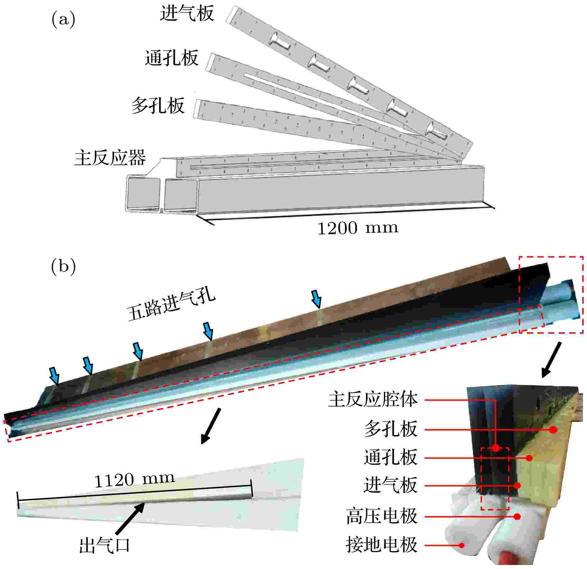 本文报道了一种新型米量级宽幅间接介质阻挡放电(DBD), 用于满足大尺度、形状复杂材料的处理需求. 通过模块化分级气路设计与仿真优化, 提高放电区域及被处理材料表面流场分布均匀性. 在此基础上, 以Ar作为工作气体, 以六甲基二硅烷(HMDSO)为反应媒质, 在纳秒脉冲电源激励下产生米量级宽幅等离子体. 通过电学、光谱、温度诊断方法来评估不同运行条件参数下的粒子活性、放电均匀性和稳定性, 并对环氧材料改性, 通过水接触角测量验证改性效果及其均匀性. 结果表明, 在合适的运行条件参数下, 可产生尺寸为1120 mm的宽幅均匀稳定等离子体. 增大电压幅值使放电强度和粒子活性提升, 但放电均匀性和稳定性会显著降低; 增大工作气体流速虽可同时提升粒子活性、放电均匀性和稳定性, 但提升幅度较小. 在电压幅值为12 kV、工作气体流速为10 L/min条件下处理10 min后, 环氧(EP)材料表面的水接触角从67°均匀提升至144°, 波动幅度低于6%. 本文所报道的米量级宽幅间接DBD电极可为大尺度等离子体材料改性技术工业应用提供参考和依据.