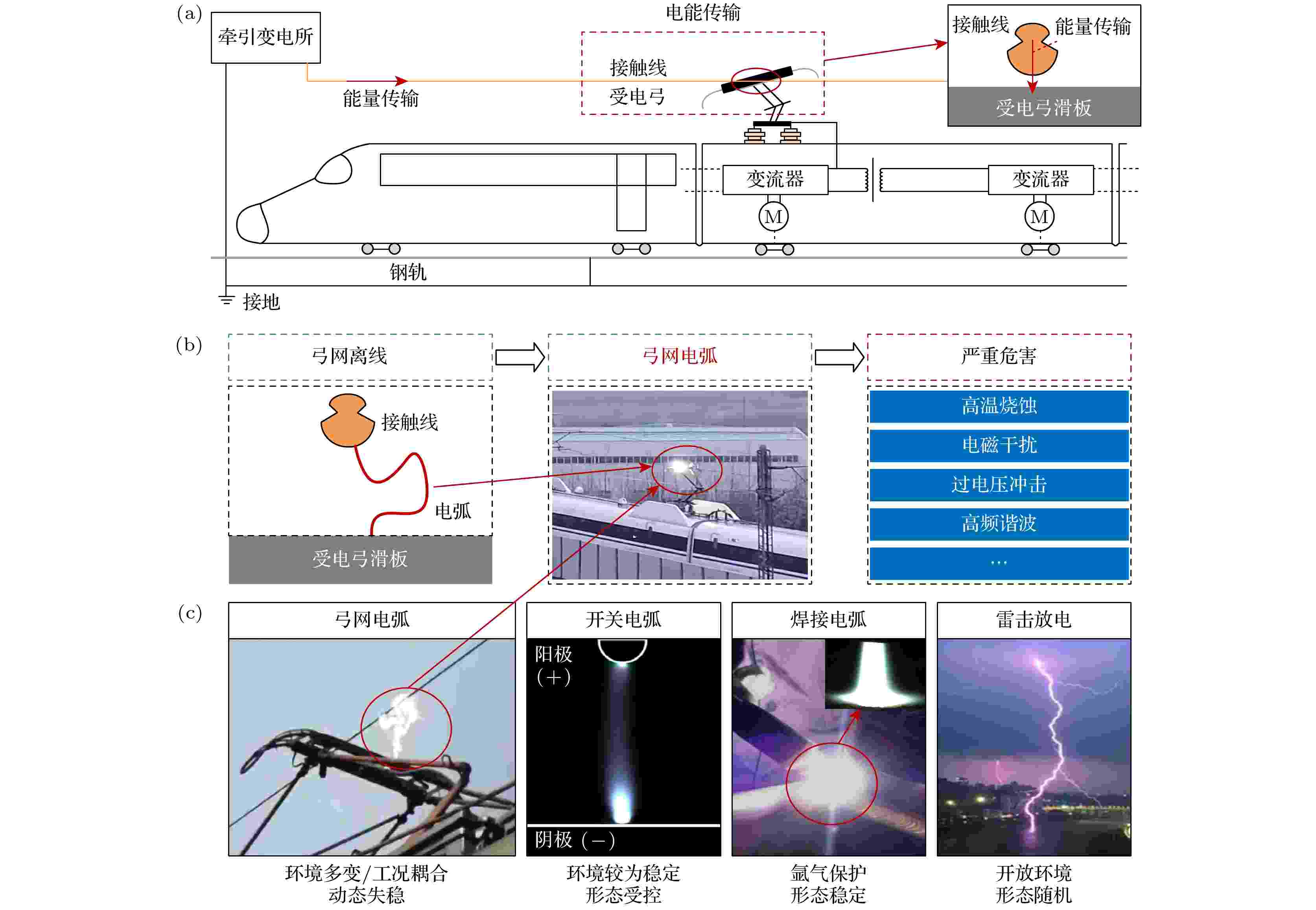 弓网滑动电接触是高速列车获取能量的唯一途径. 随列车速度、牵引功率提升以及在复杂多变环境中运行, 弓网电弧发生率提高、物性参数改变、危害增加, 严重威胁高铁安全. 本文系统综述了弓网电弧研究进展, 梳理了弓网电弧物理特性、仿真及试验研究方法, 重点分析了运行参数与环境条件对弓网电弧的影响机理及规律, 归纳了防治策略并探讨了电弧能量利用等新方向. 现有工作充分研究了运行参数对弓网电弧危害的影响, 但对弓网电弧物性参数及演化机理的研究较少, 缺乏对覆冰等特殊工况下弓网电弧特性的研究; 且现有弓网电弧防护手段需针对复杂环境工况进行改进, 以满足我国高铁大规模跨区域运行时的弓网电弧防护需求. 基于综述提出两点未来展望: 1)要厘清特殊环境弓网电弧物性参数, 探明“环境工况-物性参数-电弧行为”关联机制, 为精准预测提供基础; 2)要从“源头抑制-界面防护-过程干预”出发, 建立弓网电弧高效防治体系. 本文旨在为中国高速铁路弓网系统的可靠受流与电弧防治提供理论参考与工程借鉴.