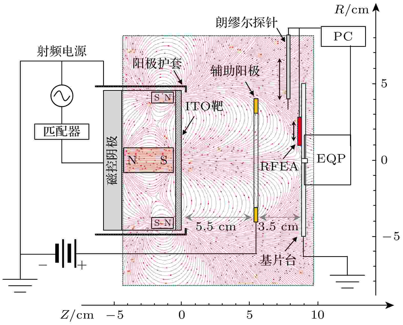 磁控溅射沉积透明导电氧化物薄膜过程中, 理解离子动力学过程是揭示“溅射损伤”机理并发展损伤抑制策略的关键. 本研究在纯Ar气氛下, 以氧化铟锡为阴极靶材, 系统探讨辅助阳极正偏压对射频磁控放电中基底入射离子能量分布的影响. 结果表明, 入射正离子包括O+, Ar+, In+, Sn+及多种金属氧化物分子离子和双电荷离子, 其能量由溅射原子的初始逸出能与等离子体电势共同决定, 并随辅助阳极偏压的升高而增强. 负离子源于阴极溅射, 其中O–和$\rm O_2^-$负离子能量分布宽广且呈多峰结构, 与阴极电压、等离子体电势的射频振荡及离子输运的弛豫效应密切相关. 金属氧化物负离子(InO–, $\rm InO_2^-$, SnO–和$\rm SnO_2^-$)对射频鞘响应滞后, 其高能峰向阴极偏置电压收敛. 高能负离子是导致“溅射损伤”的主要原因, 施加辅助阳极正偏压能有效降低其能量, 为透明导电氧化物薄膜损伤抑制提供潜在解决方案.