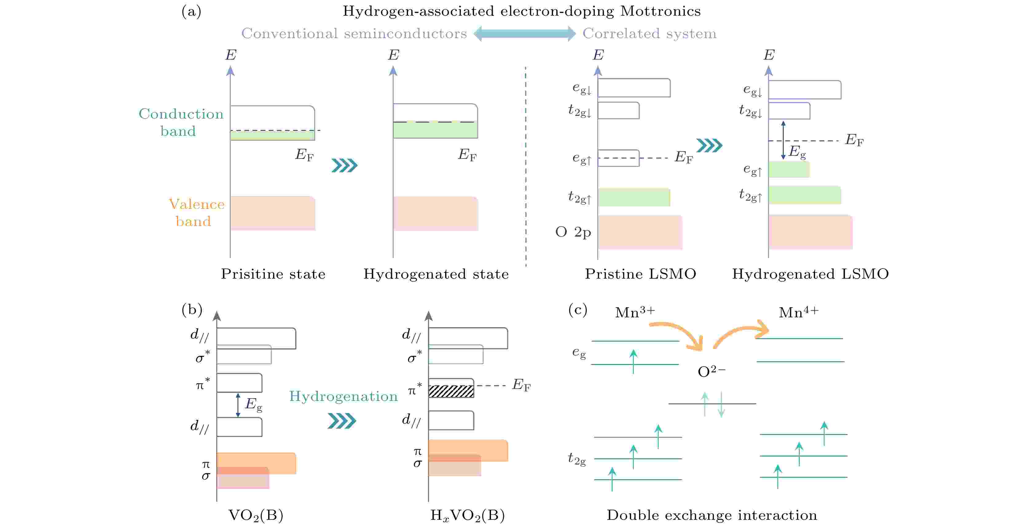 氢化或质子化通过引入离子功能调控自由度从而调控关联氧化物材料体系中多重自由度间的关联耦合效应, 突破固溶度极限的限制, 协同触发关联氧化物发生电子相变与磁转变, 为探索材料体系中的新奇物态提供了新途径, 在人工智能、关联电子器件及能量转换等领域展现出广阔的应用前景. 本文利用激光分子束外延法制备出亚稳态VO2(B)/La0.67Sr0.33MnO3(LSMO)异质结, 基于氢离子演化方法, 借助多功能氧化物异质结中关联电子与铁磁序间的关联、耦合与重构, 发现体系中弱铁磁绝缘相的新物态并涌现出丰富的结构演变与电子态重构等拓扑化学转变. 氢化触发VO2(B)/LSMO异质结体系的可逆磁电相变归因于氢化相关电子掺杂占据Mn元素eg (↑) 轨道而引发的电子局域化效应以及离子掺杂抑制Mn3+-Mn4+间的双交换相互作用. 本工作为探索关联氧化物材料体系中的新奇物态、莫特物理及其功能特性的器件化提供了可行的途径.
