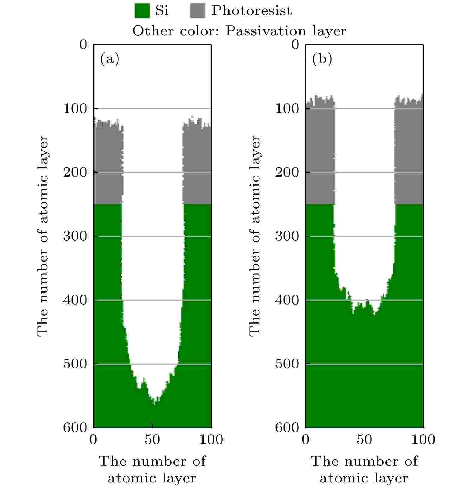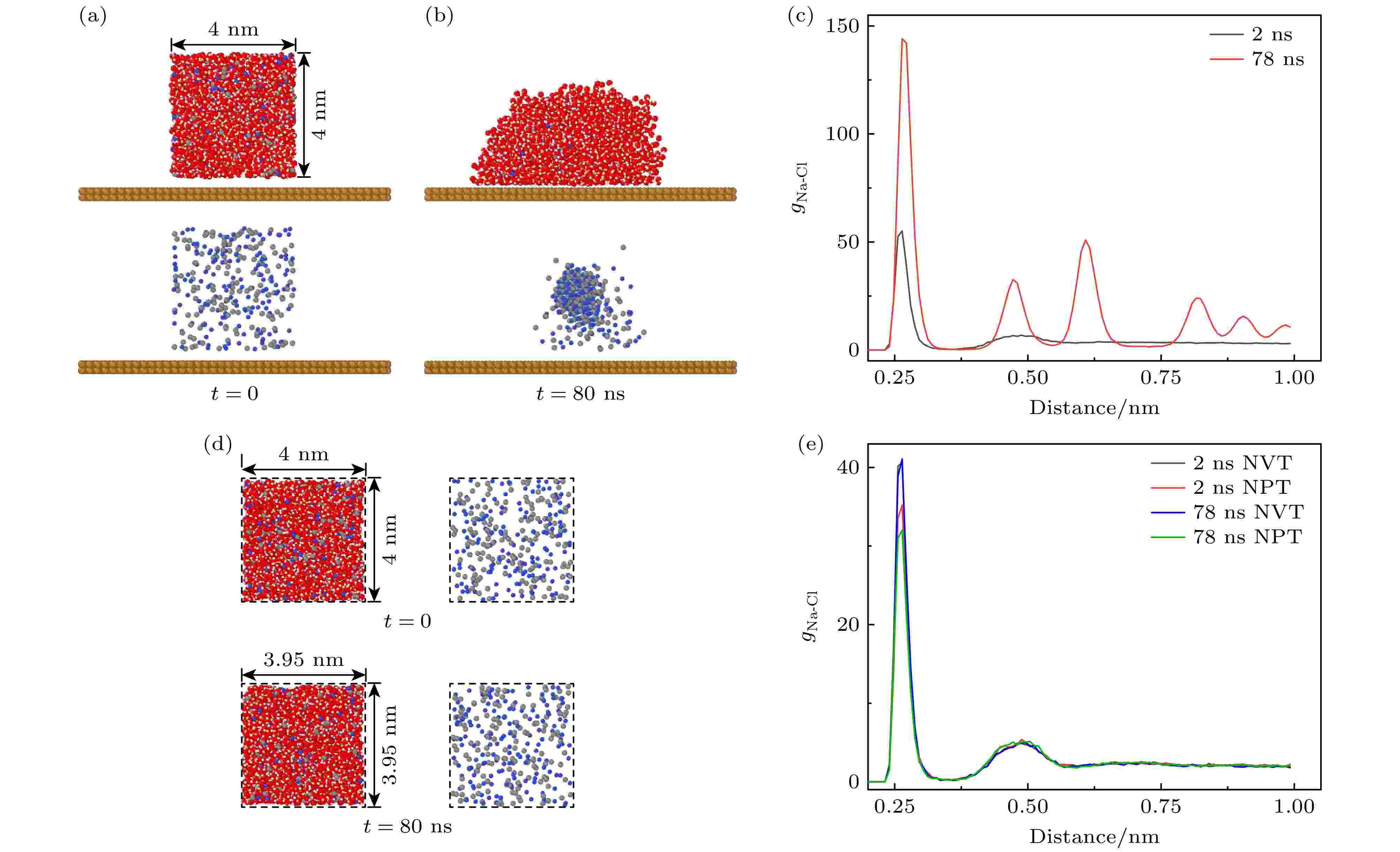 固体表面微纳米液滴中的结晶行为在工业与农业领域应用广泛, 如绿色打印、农药喷洒等. 这些应用涉及的固体基底通常是有机材料, 极性较弱或是非极性. 因此, 研究非极性固体上微纳米液滴内的结晶行为对于上述应用至关重要. 然而, 目前关于非极性固体表面微纳米液滴内离子结晶行为及其机理的研究相对匮乏, 尤其是原子尺度的机制尚不清楚. 本文采用分子动力学模拟方法研究了非极性固体表面氯化钠纳米液滴内离子的结晶行为及机理. 研究发现, 当浓度高于3.76 mol/kg时, 非极性固体表面的氯化钠纳米液滴内出现结晶现象. 结晶与固体的空间限制效应有关, 而与其物理性质无明显关联. 在非极性固体与溶液构成的界面处, 离子与固体表面之间形成水层, 离子被排斥到液滴内部, 从而提高了液滴内部的局域离子浓度, 促进结晶. 在相同条件下的氯化钾纳米液滴内也观察到结晶现象. 本文为理解非极性固体表面在固液界面中的作用、调控纳米液滴的结晶行为等提供了新的理论视角.