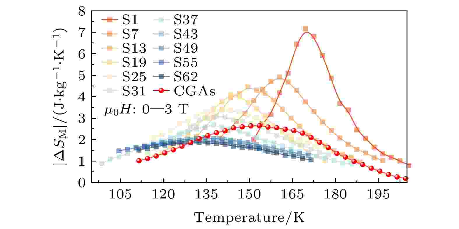 磁制冷技术具有绿色环保和节能高效等优点, 被认为是有望取代气体压缩制冷技术的新一代制冷技术. 但目前磁制冷材料往往相变温区过窄(≤10 K), 需多个成分的材料叠加才能满足实际的制冷温跨. 本研究选择典型的La(Fe, Si)13基磁制冷材料, 创新采用梯度激光粉末床熔融技术, 3D打印出水平成分梯度的La0.70Ce0.30Fe11.65–xMnxSi1.35 (Mn含量从0—0.64连续变化)合金. 系统表征其显微结构、磁学性能及磁热效应可知, 该技术可实现成分沿粉末床平面的可控梯度分布与高通量制备, 从而实现了该梯度合金居里温度从134—174 K宽温区的连续变化. 随Mn含量增加, 合金相变从弱一级相变逐渐变为二级相变, 磁熵变曲线峰型从“尖而高”变为“宽而平”, 半高宽温区扩大至83.3 K, 使得梯度合金始终保持较高的制冷能力RC (~130 J/kg, 3 T). 本研究通过梯度增材制造突破传统材料制备与性能瓶颈, 为磁制冷材料高通量制备与性能优化提供全新技术路径.