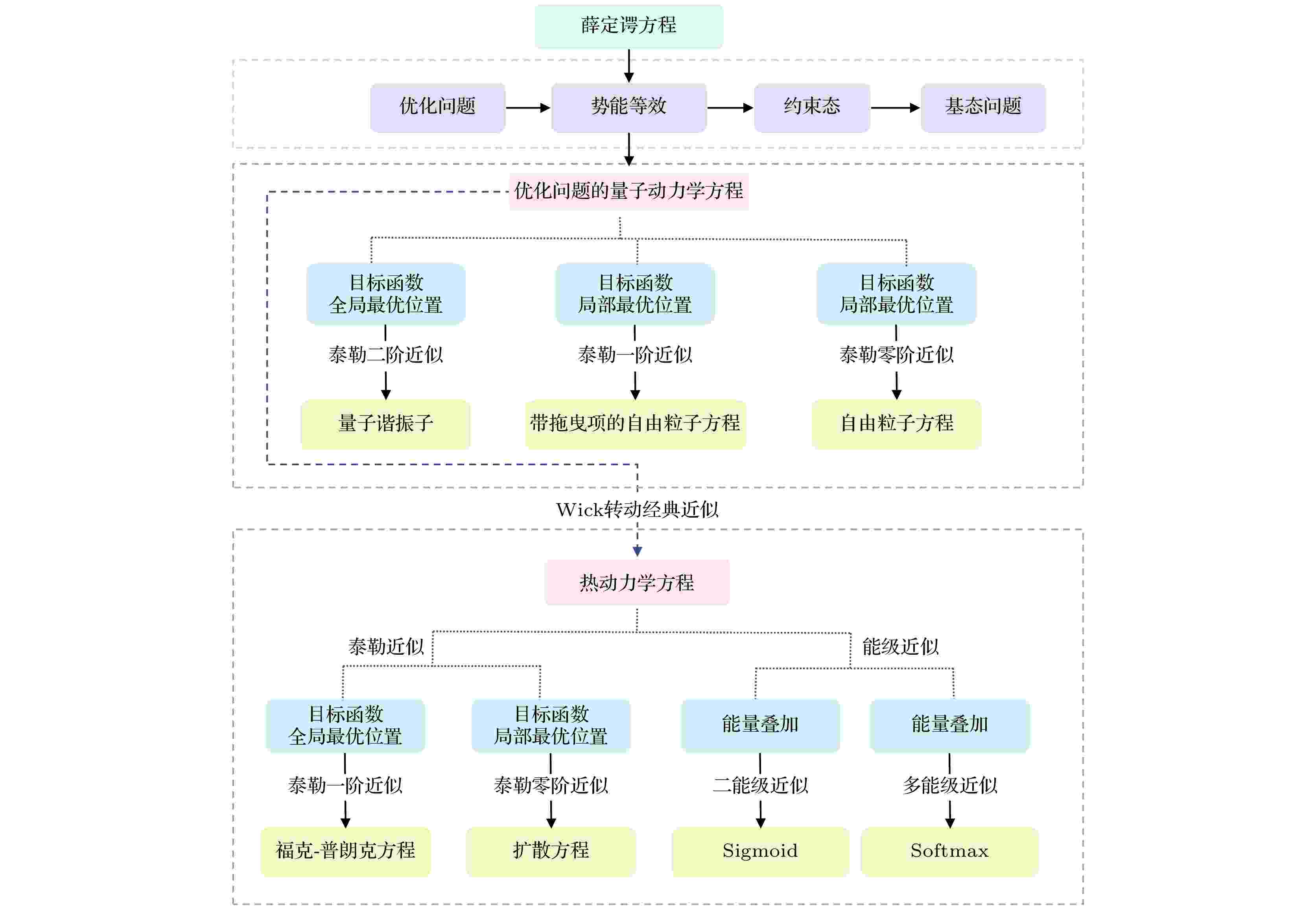 基于第一性原理思想, 采用量子动力学方法对机器学习的迭代运动过程进行建模. 在机器学习的参数空间定义广义目标函数, 利用Schrödinger方程和势能等效得到机器学习过程的量子动力学方程, 通过Wick转动进一步建立了量子动力学与热动力学的关系, 这为利用物理理论和数学理论对机器学习的迭代过程进行研究提供了可能. 本文工作将机器学习的迭代过程转化为含时偏微分方程来进行精确数学表述, 该方程表明机器学习过程可能存在多尺度的退火过程和同一尺度下的时间演化过程. 利用量子动力学方程证明了机器学习在时间演化时的收敛性, 解释了机器学习中的扩散模型是量子动力学方程在经典近似和低阶泰勒近似下的映射模型, 导出了人工智能中常用的Softmax和Sigmoid函数. 这些结果表明量子动力学方法在研究机器学习理论中是有效的.