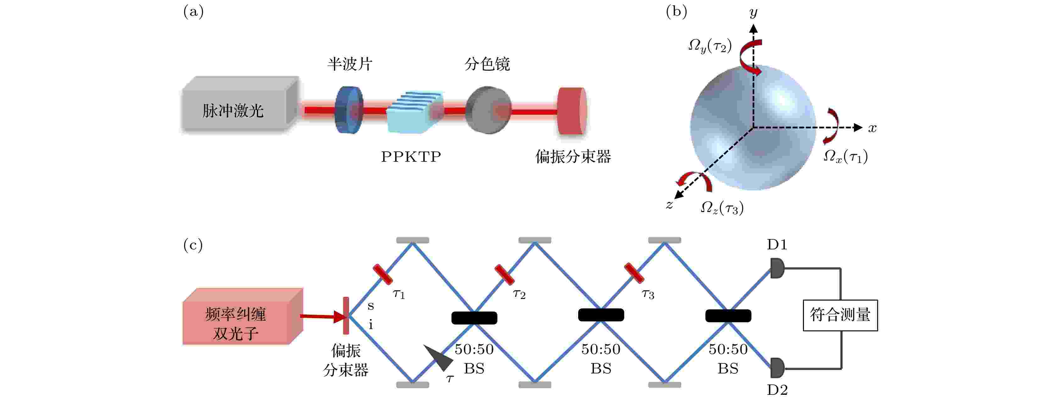 高时延分辨率的Hong-Ou-Mandel(HOM)干涉仪一直是量子精密测量领域的研究热点, 将其应用到量子陀螺仪中可以实现突破经典理论极限的角速度测量. 本文提出了基于频率纠缠双光子和级联HOM干涉仪的量子陀螺仪方案. 利用信号光和闲置光之间由于旋转存在的Sagnac效应, 将三轴角速度分别引入到级联HOM干涉仪中的对应测量臂, 利用级联HOM干涉图谱中凹陷位置与多个独立时延差之间的对应关系, 结合干涉可见度与量子Fisher信息理论, 得到3个独立时延差($ {\tau }_{1} $, $ {\tau }_{2} $, $ {\tau }_{3} $)的最大量子Fisher信息分别为(2, 0.1, 0.006). 通过引入测量不确定度, 得出时延值测量精度可以突破散粒噪声极限, 并结合时延差与旋转角速度的关系, 可实现三轴角速度的测量, 且测量精度可以超越经典光学陀螺仪, 方案可为后续量子陀螺仪在全球导航传感领域的进一步应用提供理论支持.