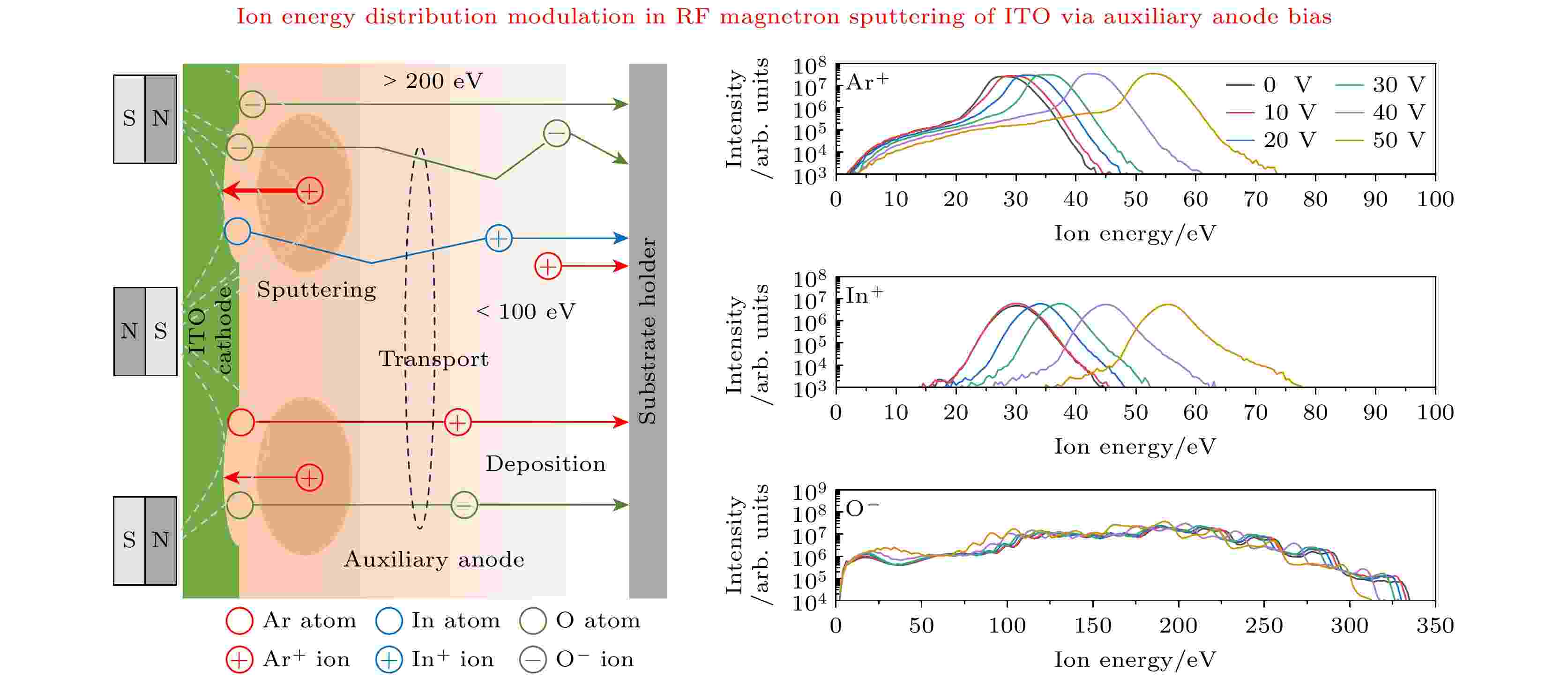 磁控溅射沉积透明导电氧化物薄膜过程中, 理解离子动力学过程是揭示“溅射损伤”机理并发展损伤抑制策略的关键. 本研究在纯Ar气氛下, 以氧化铟锡为阴极靶材, 系统探讨辅助阳极正偏压对射频磁控放电中基底入射离子能量分布的影响. 结果表明, 入射正离子包括O+, Ar+, In+, Sn+及多种金属氧化物分子离子和双电荷离子, 其能量由溅射原子的初始逸出能与等离子体电势共同决定, 并随辅助阳极偏压的升高而增强. 负离子源于阴极溅射, 其中O和$\rm O_2^-$负离子能量分布宽广且呈多峰结构, 与阴极电压、等离子体电势的射频振荡及离子输运的弛豫效应密切相关. 金属氧化物负离子(InO, $\rm InO_2^-$, SnO和$\rm SnO_2^-$)对射频鞘响应滞后, 其高能峰向阴极偏置电压收敛. 高能负离子是导致“溅射损伤”的主要原因, 施加辅助阳极正偏压能有效降低其能量, 为透明导电氧化物薄膜损伤抑制提供潜在解决方案.