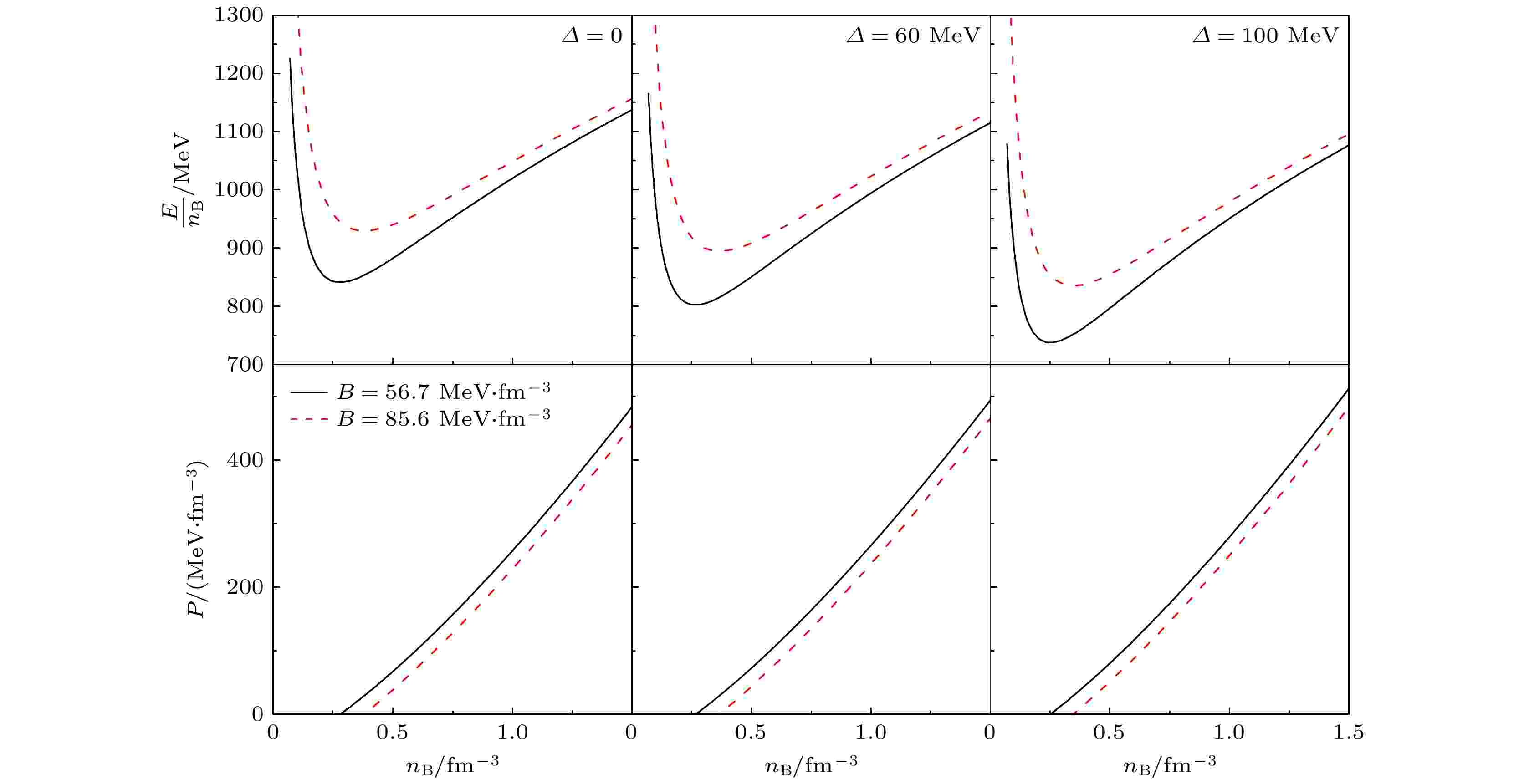 基于MIT袋模型计算了零温与强磁场下奇异夸克物质与色味锁夸克物质的热力学性质. 发现色味锁态下夸克物质的热力学性质受色味锁夸克物质的能隙常数、磁场强度影响很大, 特别是物态方程会随着能隙常数的增加而变硬, 压强随着磁场强度的增加而呈现明显的各向异性. 结果表明色味锁态下基于MIT袋模型的夸克星质量半径曲线可以通过多个目前实验估测的脉冲星质量-半径区域, 色味锁夸克星的最大质量会随着能隙常数的增加而增大. 强磁场下色味锁磁星的质量与磁星内部磁场强度与方向的分布关系紧密, 星体物质的多方指数会随着星体质量的增加而减小.