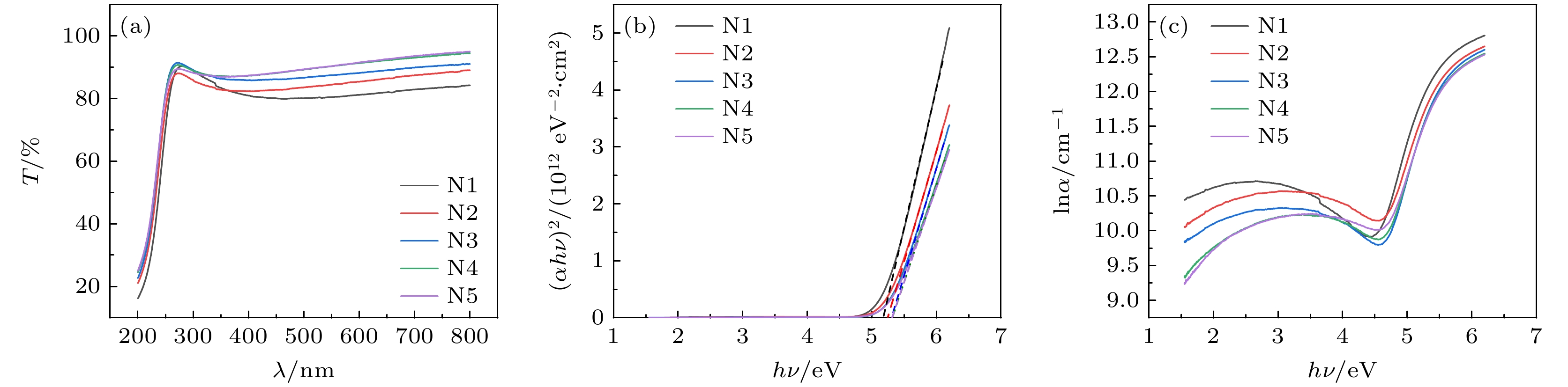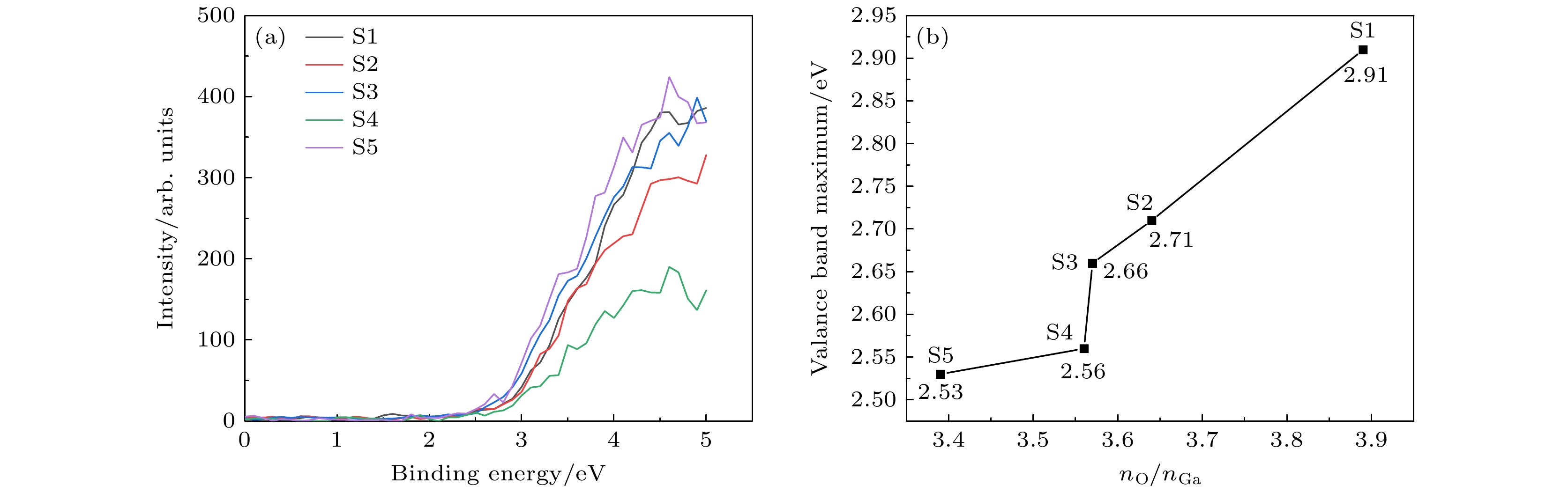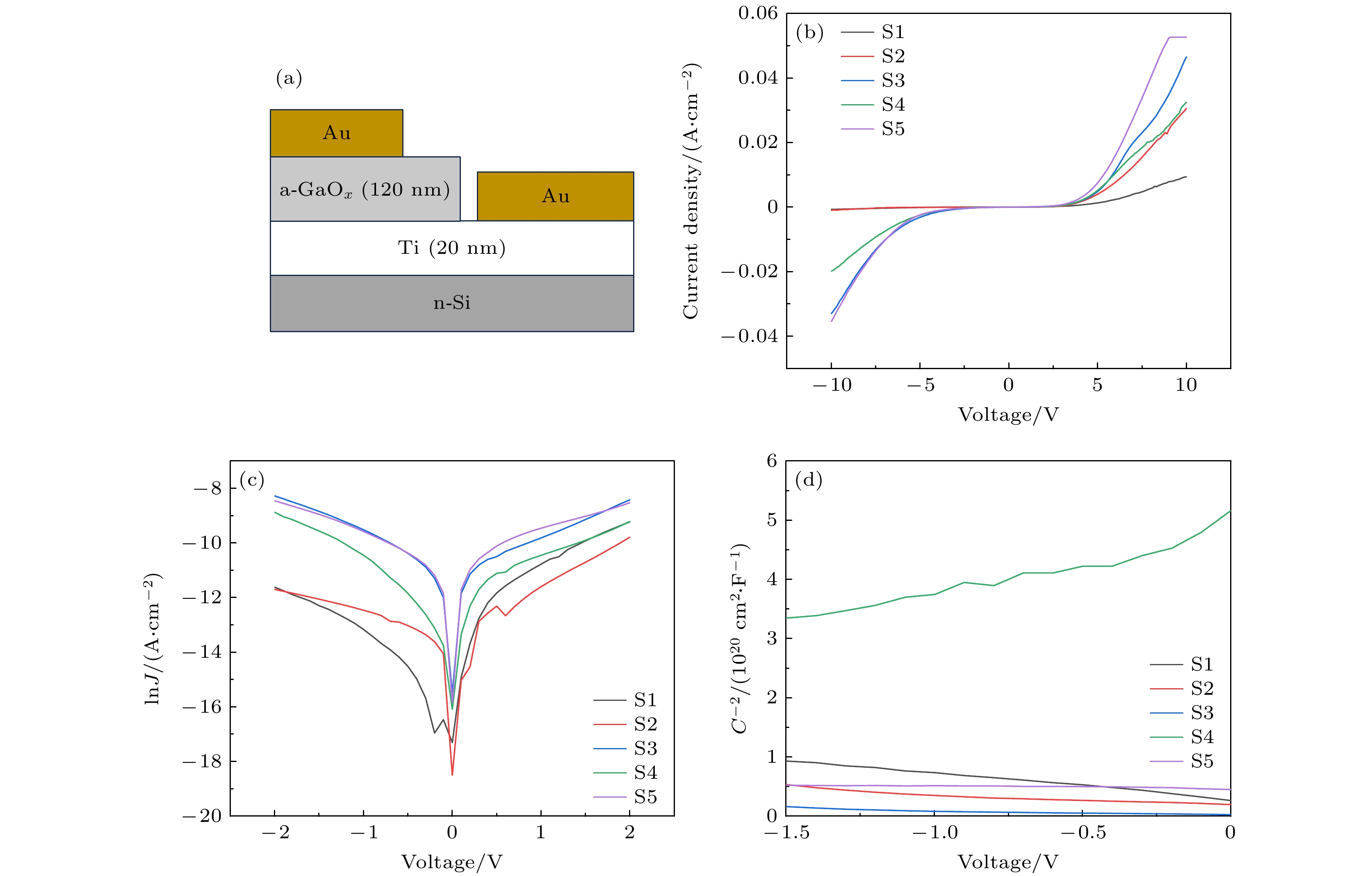 Amorphous gallium oxide (a-GaOx) exhibits excellent electrical conductivity, a wide bandgap, high breakdown field strength, high visible light transmittance, high sensitivity to specific ultraviolet wavelengths, low preparation temperatures, relatively simple processing, wide substrate applicability, and ease of obtaining high-quality thin films. These attributes make it a suitable candidate for applications in transparent electronic devices, ultraviolet detectors, high-power devices, and gas sensors. Presently, the research on a-GaOx remains limited, focusing primarily on films with an O/Ga ratio less than or equal to 1.5. Increasing the concentration of oxygen vacancies to enhance the conductivity of the material often leads to a reduction in its bandgap, which is undesirable for high-power applications. Variations in O/Ga in the films can affect the formation of chemical bonds and significantly influence the band structure. In this study, five groups of a-GaOx thin films with high oxygen-to-gallium ratios are successfully fabricated by increasing the gas flow rate at low sputtering power. The elemental compositions of the films are analyzed using energy dispersive spectroscopy (EDS), revealing the O/Ga ratio gradually decreasing from 3.89 to 3.39. Phase analysis by using X-ray diffraction (XRD) confirms the amorphous nature of the films. Optical properties are characterized using an ultraviolet-visible spectrophotometer (UV-Vis), indicating that the optical bandgap and the density of localized states gradually increase. X-ray photoelectron spectroscopy (XPS) is utilized to analyze the elemental compositions, chemical states, and valence band structures of the films, showing that the valence band maximum decreases and the content of Ga2O within the material increases. Subsequently, Au/a-GaOx/Ti/Au Schottky devices are fabricated under the same processing conditions. The I-V characteristics of these devices are measured using a Keithley 4200, revealing changes in the electron transport mechanism at the metal-semiconductor (MS) interface, with the gradual increase in electron affinity calculated. C-V characteristics are measured using a Keithley 590, and the donor concentration (density of localized states) at the interface is calculated to gradually increase. In summary, by controlling appropriate process parameters, it is possible to improve the conductivity of electronic devices while increasing the bandgap of a-GaOx, which is significant for high-power applications.