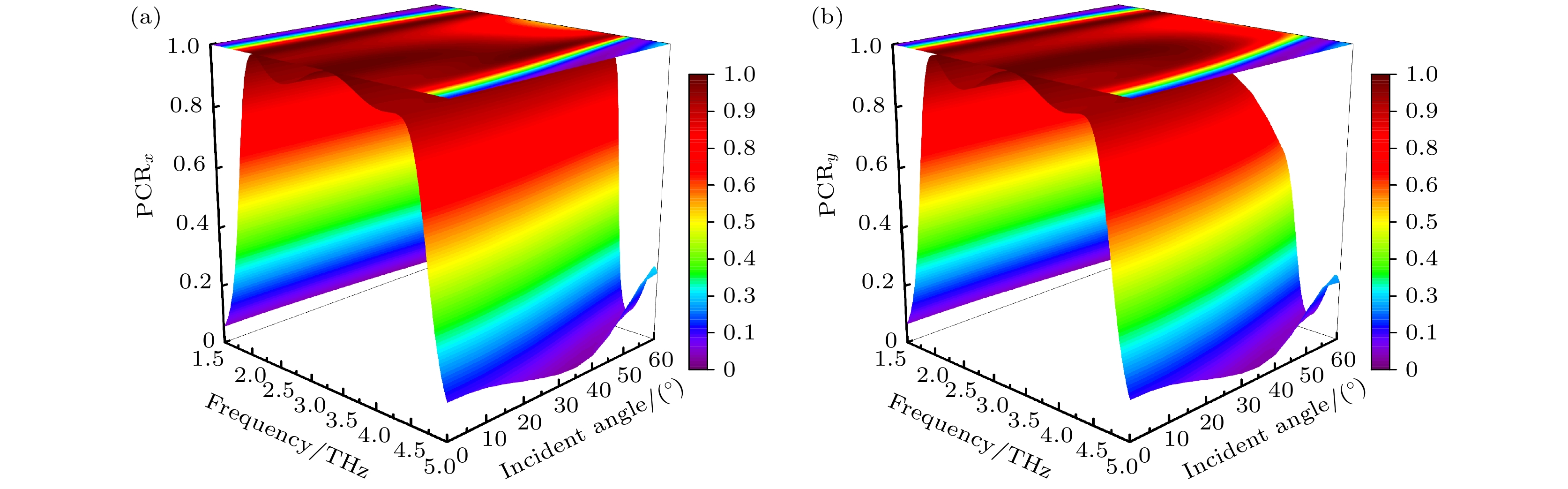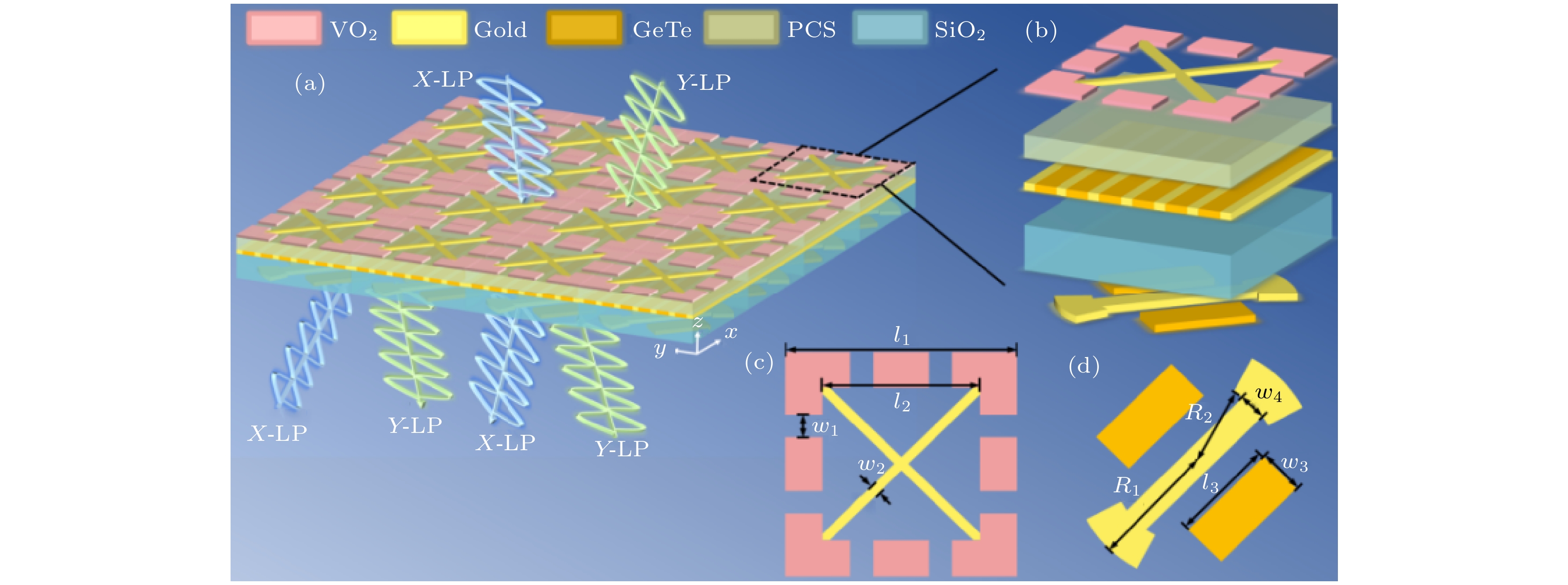 In this paper, we propose a vanadium dioxide and germanium telluride composite metasurface. The conductivity of vanadium dioxide and germanium telluride is varied by changing the temperature, which enables the switching of functions such as ultra-broadband absorption, reflective-type polarization, and transmissive-type polarization. When vanadium dioxide is metallic and germanium telluride is crystalline, the terahertz wave is incident along the –z direction, and the metasurface can be used as a broadband absorber, with an absorption rate greater than 90% in a frequency range of 7.96–17.76 THz, and the absorption bandwidth reaches 9.8 THz, with a relative bandwidth of 76.2%. In addition, the designed metasurface absorber is polarization-insensitive and exhibits good absorption performance at large incidence angles. Terahertz waves are incident along the +z direction, and this metasurface can be used as a reflective polarization converter with a polarization conversion ratio greater than 0.9 for x– and y–polarized waves in the frequency band from 2.04 to 4.44 THz. The effects of incidence angle and structural parameters on polarization conversion performance are also investigated. When vanadium dioxide is in the dielectric state and germanium telluride is in the amorphous state, the metasurface can be used as a transmissive polarization converter, with a polarization conversion rate of greater than 0.9 in a frequency band of 0.65–5.07 THz. And the high polarization conversion performance can be maintained in a wide range of incidence angles. Finally, the physical mechanism of polarization conversion is analyzed using surface currents. The results show that the metasurface structure has bi-directional, switchable and multi-functional characteristics for terahertz wave manipulation, and has broad application prospects in terahertz wave sensing, imaging and communication.