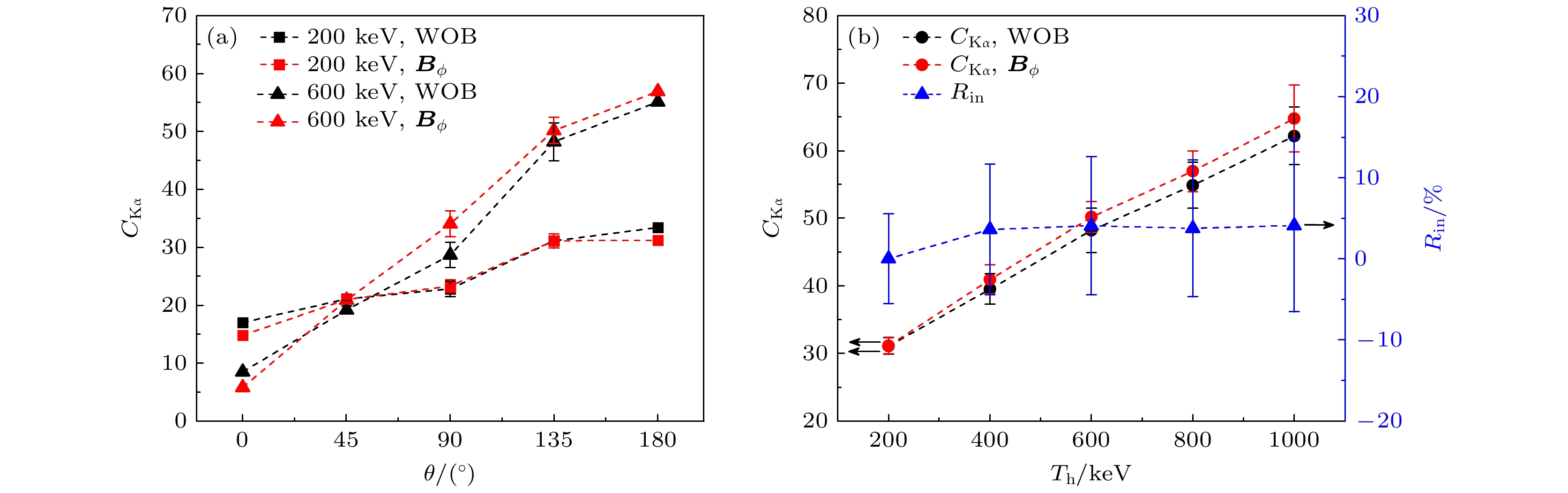 The interaction of a high-intensity laser with a solid target generates a large number of hot electrons. When these hot electrons are transported in the target material, X-rays, including Kα line and bremsstrahlung emissions are produced. The contrast of Kα line emission, i.e. the intensity of Kα line relative to the intensity of bremsstrahlung continua around the Kα line, depends on the anisotropy of the bremsstrahlung emission and is related to the energy and transportation of the hot electrons. In the past, some researchers used axial or annular magnetic fields to collimate hot electrons, but whether these magnetic fields can enhance the contrast of Kα emission has not been studied. In the present work, the effect of an axially uniform magnetic field or an annular magnetic field with a Gaussian distribution on the contrast of Cu Kα emission is investigated by Monte Carlo simulations. The simulation results and analysis show that the axially uniform magnetic field cannot strengthen the anisotropy of bremsstrahlung emission, so it cannot enhance the contrast of Kα emission efficiently. For the annular magnetic field with a Gaussian distribution, when an electron beam with a Boltzmann energy distribution is incident, due to the weak anisotropy of bremsstrahlung emission by low-energy electrons in the electron beam, the increase of Kα emission contrast is small. When an electron beam with a Boltzmann energy distribution, in which the low-energy part is cut off, or a mono-energetic electron beam is incident, the annular magnetic field with a Gaussian distribution significantly enhances the contrast of Kα emission in the back direction of the electron beam incidence. For an incident electron beam with an energy value in a range of 200–1000 keV, an annular magnetic field with a Gaussian distribution and a peak value of approximately 100 T is optimal for enhancing the contrast of Kα emission. Considering the existing experiments on generating annular magnetic fields and non-Boltzmann energy distribution hot electrons, it is possible to generate higher contrast Kα emissions with the enhancement of magnetic field in future experiments.