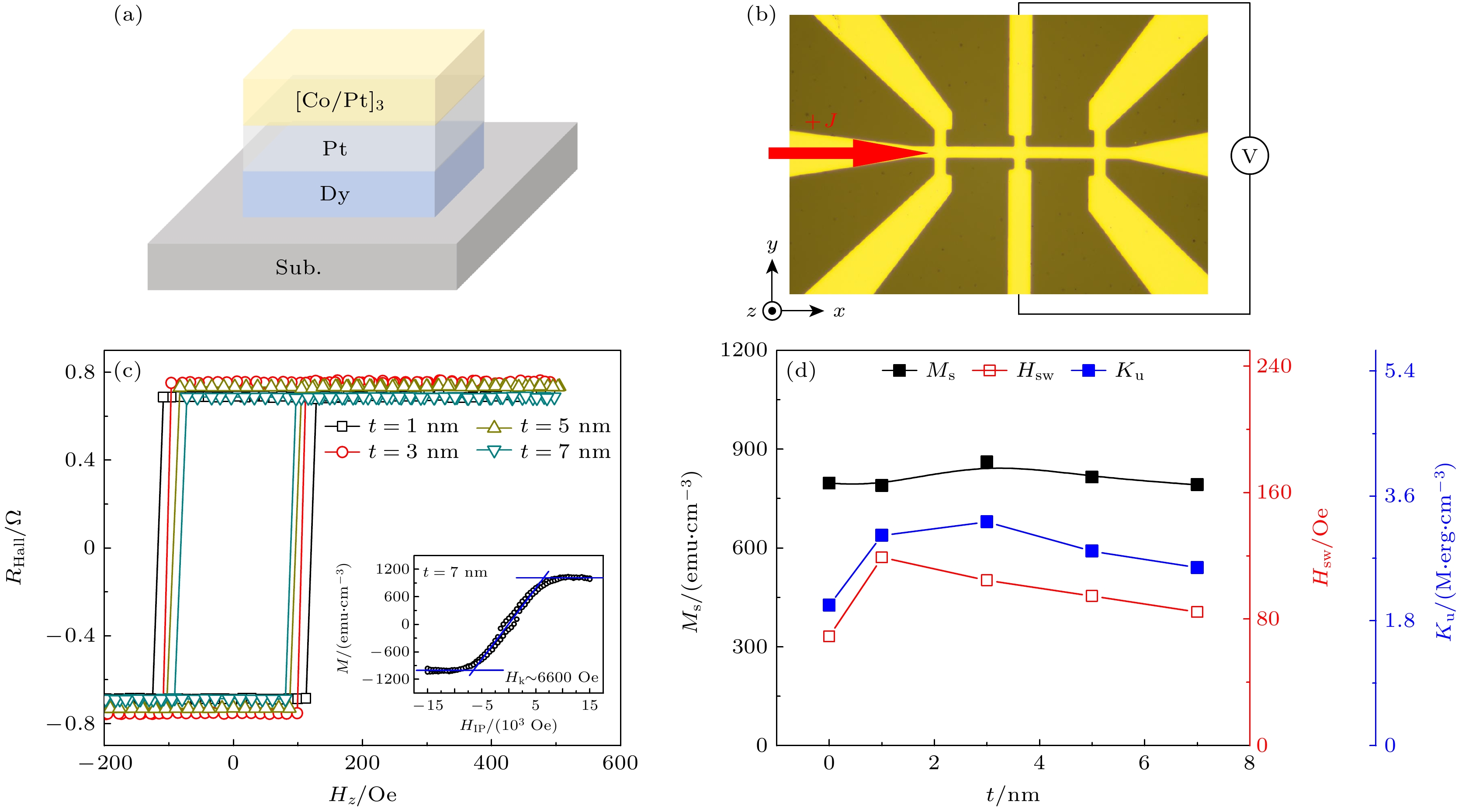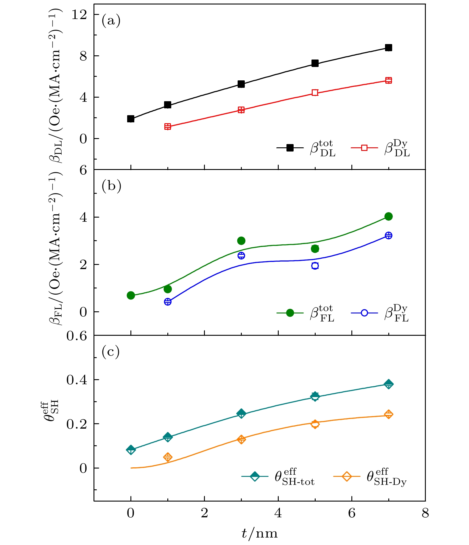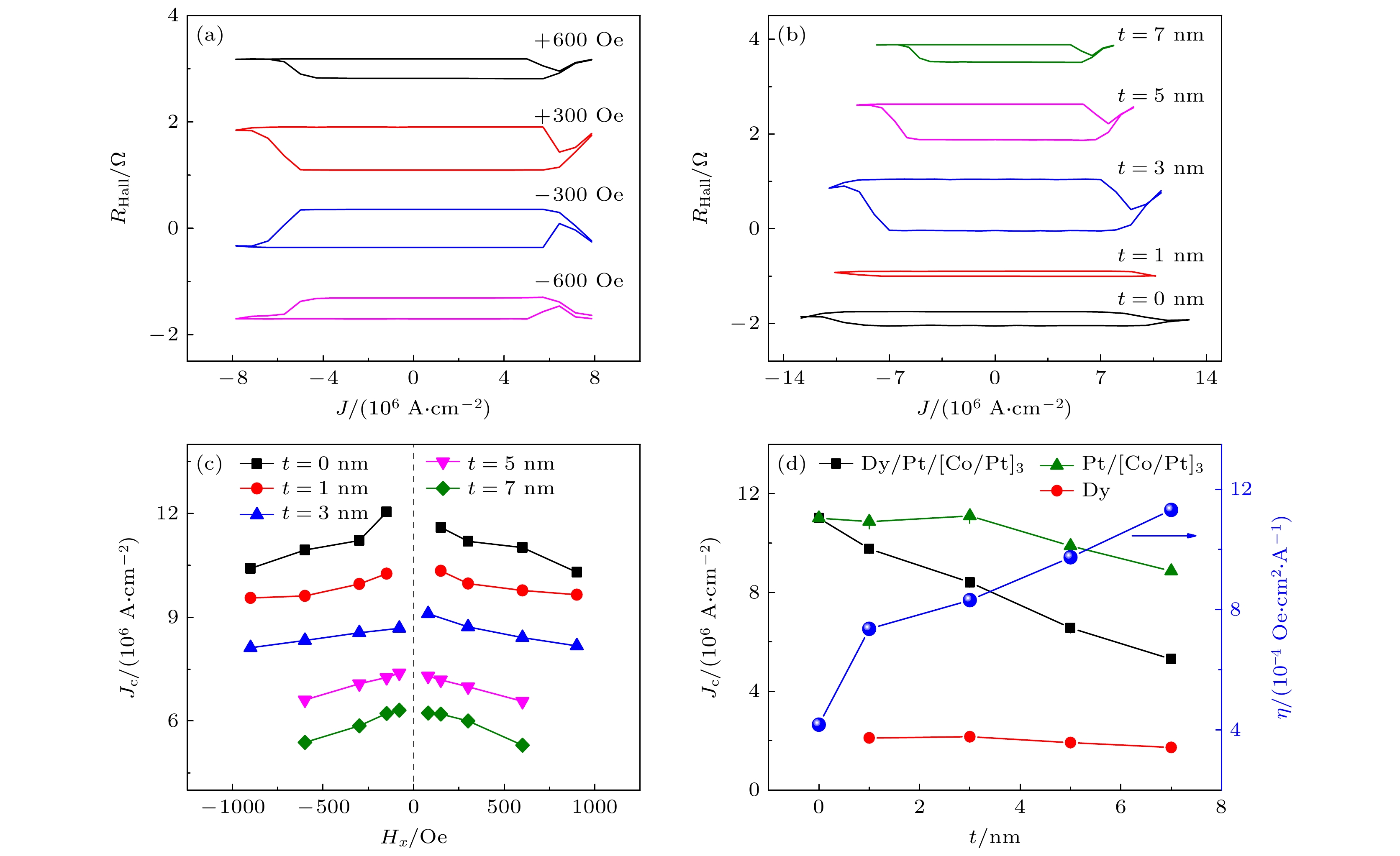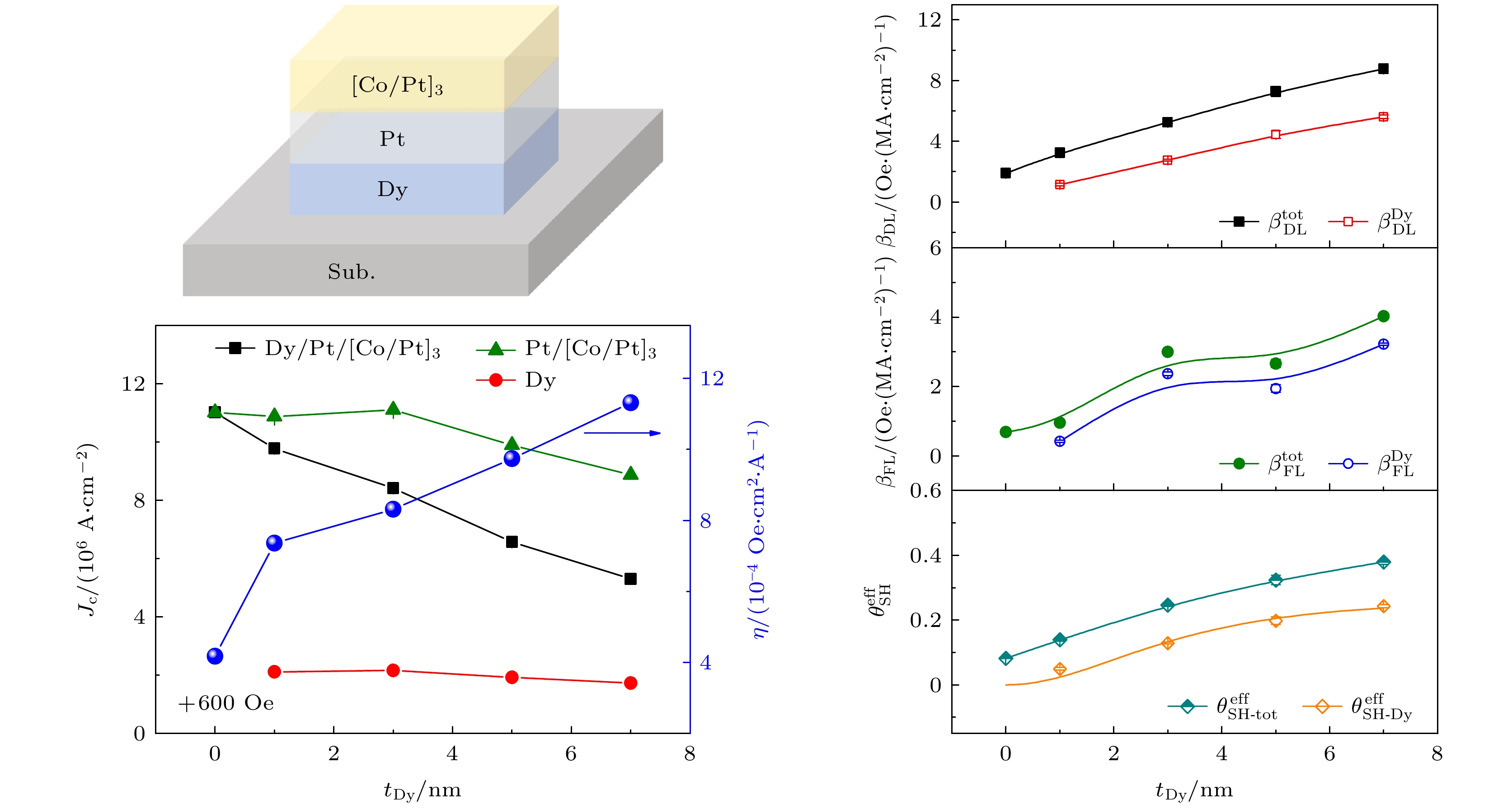 Spin-orbit torque (SOT) based on the spin-orbit coupling (SOC) effect has received increasing attention in magnetic information storage, logical operation and neuron simulation devices because it can effectively manipulate magnetization switching, chiral magnetic domain walls, and magnetic skyrmion motions. Further improvement of the SOT efficiency and reduction of the driving current density are crucial scientific problems to be solved for high-density and low-power applications of SOT-based spintronic devices. The heavy rare-earth metal dysprosium (Dy) possesses a relatively strong SOC due to the partially filled f orbital electrons (4f10), which is expected to generate spin Hall torques. In this work, the influences of Dy thickness on the SOT efficiency and SOT-driven magnetic reversal are explored in the Dy/Pt/[Co/Pt]3 magnetic multilayers, where the rare-earth Dy and [Co/Pt]3 are used as a spin-source layer and a perpendicularly magnetized ferromagnetic layer, respectively. A series of Dy/Pt/[Co/Pt]3 heterostructures with the values of Dy layer thickness (tDy) of 1, 3, 5 and 7 nm is fabricated by ultrahigh-vacuum magnetron sputtering. The perpendicular magnetic anisotropy, SOT efficiency, spin Hall angle and current-induced magnetization switching are characterized using the magnetic property and electrical transport measurements. The results show that the switching field and magnetic anisotropic field decrease with the increase of tDy, revealing that the magnetic parameters can be regulated by the bottom Dy layer due to their structural sensitivity. However, both damping-like SOT efficiency and effective spin Hall angle (\begin{document}$\theta _{{\text{SH}}}^{{\text{eff}}} $\end{document} ) gradually increase with the increase of tDy, indicating that the rare-earth Dy can provide additional spin current to enhance the SOT efficiency apart from the contribution of Pt/[Co/Pt]3. Particularly, the maximum value of \begin{document}$\theta _{{\text{SH}}}^{{\text{eff}}} $\end{document} of 0.379±0.008 is achieved when tDy is 7 nm. According to the fitting analysis of the drift-diffusion model, the intrinsic spin Hall angle and spin diffusion length of the rare-earth Dy are extracted to be 0.260±0.039 and (2.234±0.383) nm, respectively, suggesting that Dy can be used as an ideal spin-source material. In addition, the critical switching current density (Jc) gradually decreases with the increase of tDy, and Jc reaches a minimum value of approximately 5.3×106 A/cm2 at tDy = 7 nm, which is mainly attributed to the increase of the damping-like SOT and slight decrease of the switching field. These results experimentally demonstrate a strong spin Hall effect of the rare-earth Dy, and provide a feasible route for designing SOT-based spintronic devices with low-power dissipation.