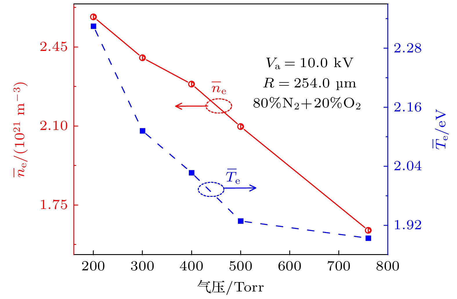 Packed bed dielectric barrier discharge (PB-DBD) is extremely popular in plasma catalysis applications, which can significantly improve the selectivity and energy efficiency of the catalytic processes. In order to achieve some complex chemical reactions, it is necessary to mix different materials in practical applications. In this work, by using the two-dimensional particle-in-cell/Monte Carlo collision (PIC/MCC) method, the discharge evolution in PB-DBD packed with two mixed dielectrics is numerically simulated to reveal the discharge characteristics. Due to the polarization of dielectric columns, the enhancement of electric field induces streamers at the bottom of the dielectric columns with high electrical permittivity (εr). The streamers propagate downward in the voids between the dielectric columns with low εr, which finally converts into volume discharges. Then, a new streamer forms near the upper dielectric plate and propagates downward along the void of the dielectric columns with high εr. Moreover, electron density between the columns with high εr is lower than that between the dielectric columns with low εr. In addition, the numbers of e,\begin{document}$ {\text{N}}_{2}^{+} $\end{document} , \begin{document}$ {\text{O}}_{2}^{+} $\end{document} and \begin{document}$ {\text{O}}_{2}^{-} $\end{document} present different profiles versus time. All of e, \begin{document}$ {\text{N}}_{2}^{+} $\end{document} and \begin{document}$ {\text{O}}_{2}^{+} $\end{document} increase in number before 0.8 ns. After 0.8 ns, the number of electrons decreases with time, while the numbers of \begin{document}$ {\text{N}}_{2}^{+} $\end{document} and \begin{document}$ {\text{O}}_{2}^{+} $\end{document} keep almost constant. In the whole process, the number of \begin{document}$ {\text{O}}_{2}^{-} $\end{document} keeps increasing with time increasing. The reason for the different temporal profiles can be analyzed as follows. The sum of electrons deposited on the dielectric and those lost in attachment reaction is greater than the number of electrons generated by ionization reaction, resulting in the declining trend of electrons. Comparatively, the deposition of \begin{document}$ {\text{N}}_{2}^{+} $\end{document} and \begin{document}$ {\text{O}}_{2}^{+} $\end{document} on the dielectric almost balances with their generation, leading to the constant numbers of \begin{document}$ {\text{N}}_{2}^{+} $\end{document} and \begin{document}$ {\text{O}}_{2}^{+} $\end{document} . In addition, the variation of averaged electron density (\begin{document}$ {\bar{n}}_{{\mathrm{e}}} $\end{document} ) and averaged electron temperature (\begin{document}$ {\bar{T}}_{{\mathrm{e}}} $\end{document} ) in the voids between the dielectric columns are also analyzed under different experimental parameters. Simulation results indicate that both of them decrease with pressure increasing or voltage amplitude falling. Moreover, they increase with dielectric column radius enlarging. In addition, \begin{document}$ {\bar{n}}_{{\mathrm{e}}} $\end{document} increases and then decreases with the increase of N2 content in the working gas, while \begin{document}$ {\bar{T}}_{{\mathrm{e}}} $\end{document} monotonically increases. The variations of \begin{document}$ {\bar{n}}_{{\mathrm{e}}} $\end{document} and \begin{document}$ {\bar{T}}_{{\mathrm{e}}} $\end{document} in the voids can be explained as follows. With the increase of pressure, the increase of collision frequency and the decrease of average free path lead to less energy obtained per unit time by electrons from the electric field, resulting in the decreasing of \begin{document}$ {\bar{T}}_{{\mathrm{e}}} $\end{document} . Moreover, the first Townsend ionization coefficient decreases with the reduction in \begin{document}$ {\bar{T}}_{{\mathrm{e}}} $\end{document} , resulting in less electrons produced per unit time. Hence, both \begin{document}$ {\bar{n}}_{{\mathrm{e}}} $\end{document} and \begin{document}$ {\bar{T}}_{{\mathrm{e}}} $\end{document} decrease with pressure increasing. Additionally, \begin{document}$ {\bar{T}}_{{\mathrm{e}}} $\end{document} is mainly determined by electric field strength. Therefore, the rising voltage amplitude results in the increase of and \begin{document}$ {\bar{T}}_{{\mathrm{e}}} $\end{document} . Based on the same reason for pressure, \begin{document}$ {\bar{n}}_{{\mathrm{e}}} $\end{document} also increases with the augment of voltage amplitude. Consequently, both \begin{document}$ {\bar{n}}_{{\mathrm{e}}} $\end{document} and \begin{document}$ {\bar{T}}_{{\mathrm{e}}} $\end{document} increase with voltage amplitude increasing. In addition, the surface area of dielectric columns increases with dielectric column radius enlarging. Therefore, more polarized charges are induced on the inner surface of the dielectric column, inducing a stronger electric field outside. Accordingly, the enlarging of dielectric column radius leads \begin{document}$ {\bar{n}}_{{\mathrm{e}}} $\end{document} and \begin{document}$ {\bar{T}}_{{\mathrm{e}}} $\end{document} to increase. Moreover, the variation of \begin{document}$ {\bar{n}}_{{\mathrm{e}}} $\end{document} with N2 content is analyzed from the ionization rate, and that of \begin{document}$ {\bar{T}}_{{\mathrm{e}}} $\end{document} is obtained by analyzing the ionization thresholds of N2 and O2.