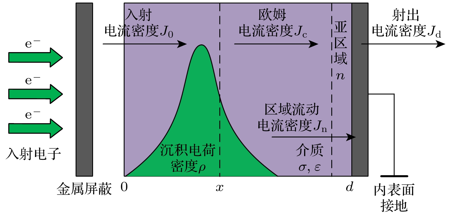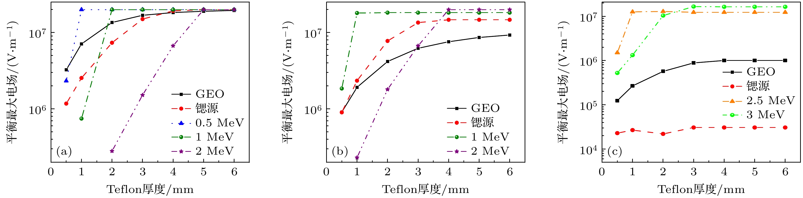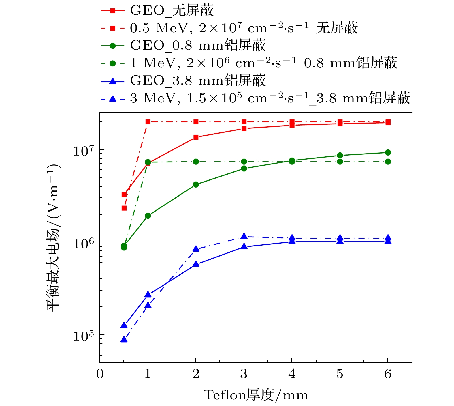 The deep charge-discharge effect in dielectrics induced by high-energy electrons is a major cause of spacecraft anomalies and failures in geosynchronous orbit (GEO) and medium earth orbit (MEO). To evaluate the in-orbit deep charging and discharging behavior of satellite dielectric materials, ground-based simulation testing is essential. However, due to limitations in ground test conditions, it is necessary to conduct a comprehensive analysis of the effectiveness of such evaluations. This paper introduces the key physical model of deep dielectric charging, taking a grounded planar dielectric with an irradiated inner surface as a representative case to analyze the internal charging process and the evolution of critical physical quantities governing deep charging phenomena. In this study, the DICTAT simulation tool is used to investigate the charging effects of three distinct electron sources: strontium-90 decay electrons, monoenergetic electron beams, and GEO ambient electrons. In ground-based simulations, researchers typically use monoenergetic or continuous-spectrum electron beams with flux intensities on the order of pA·cm–2 to irradiate test specimens with varying shielding configurations, dielectric thicknesses, and material compositions, aiming to replicate in-situ deep charging phenomena and assess associated risks. Therefore, the simulations are conducted under electron flux levels representative of GEO orbital conditions. This study focuses on polytetrafluoroethylene (PTFE) dielectric samples under three typical spacecraft shielding configurations: 1) externally mounted on the cabin surface, 2) housed inside the pressurized cabin, and 3) embedded within standalone electronic subsystems, while systematically incorporating variations in dielectric thickness. The results show that the disparity between the electron flux deposited within the dielectric bulk and the flux at dielectric interfaces critically governs the severity of charging under varying irradiation conditions. Two key findings emerge as follows. 1) Discrepancies in electron energy spectra and their influence: the differences in energy spectra between the test electron source and the actual space environment lead to variations in deposited electron flux across different aluminum shielding thicknesses and dielectric depths. This discrepancy influences the equilibrium charging state by changing the current density and conductivity in sub-region-n (the dielectric-ground interface), potentially resulting in either underestimation or overestimation of deep charging effects compared with true space conditions. 2) Effectiveness of different electron sources for simulation: strontium-based sources (e.g. Sr-90 β-decay spectra) effectively replicate the internal charging behavior of Teflon (PTFE) materials on cabin exteriors and inside pressurized compartments under GEO-like electron flux conditions. 0.5 MeV monoenergetic electron beams are suitable for simulating surface dielectric charging on cabin exteriors. However, higher-energy monoenergetic beams exhibit limited applicability at varying dielectric thicknesses. Despite the similar flux intensity used in the tests compared with that in the actual space environment, the differences in energy distribution between the test beams and space electrons can lead to underestimation or overestimation of the charging effects. Based on the simulation results, this work provides recommendations for selecting appropriate test beam parameters under different shielding conditions to improve the accuracy of ground-based evaluations of in-orbit deep dielectric charging.