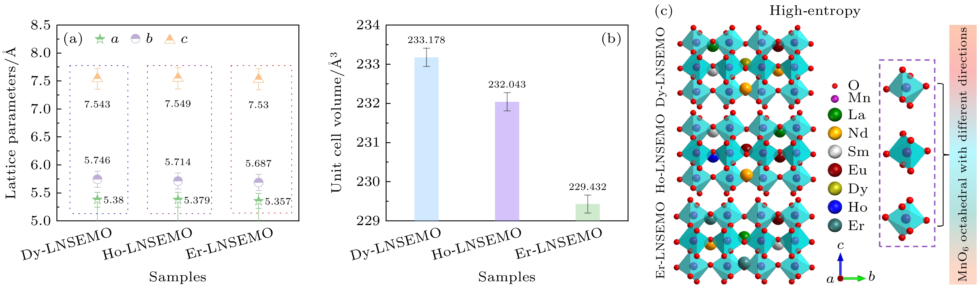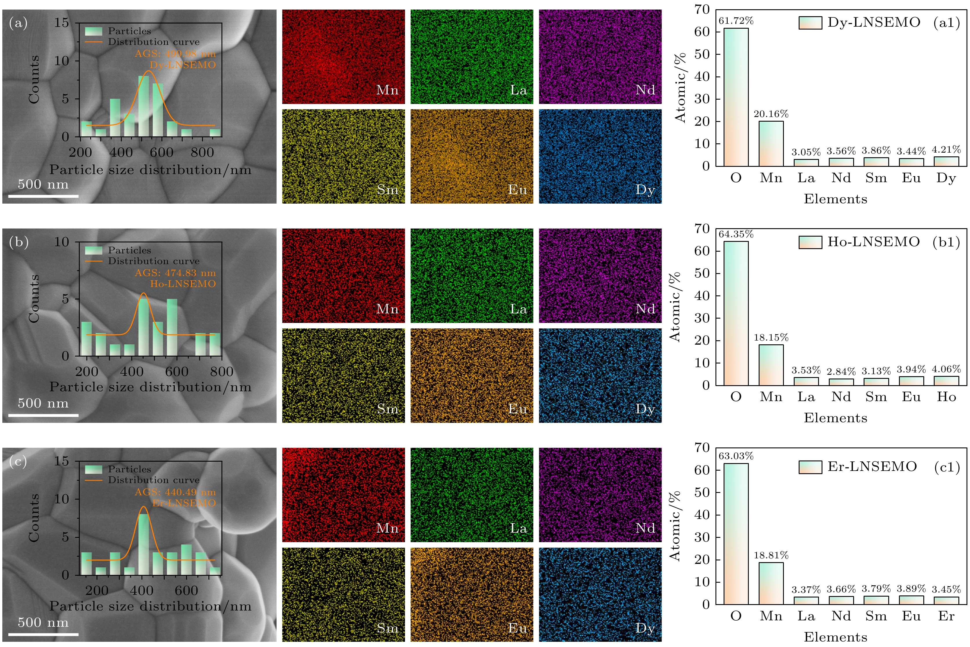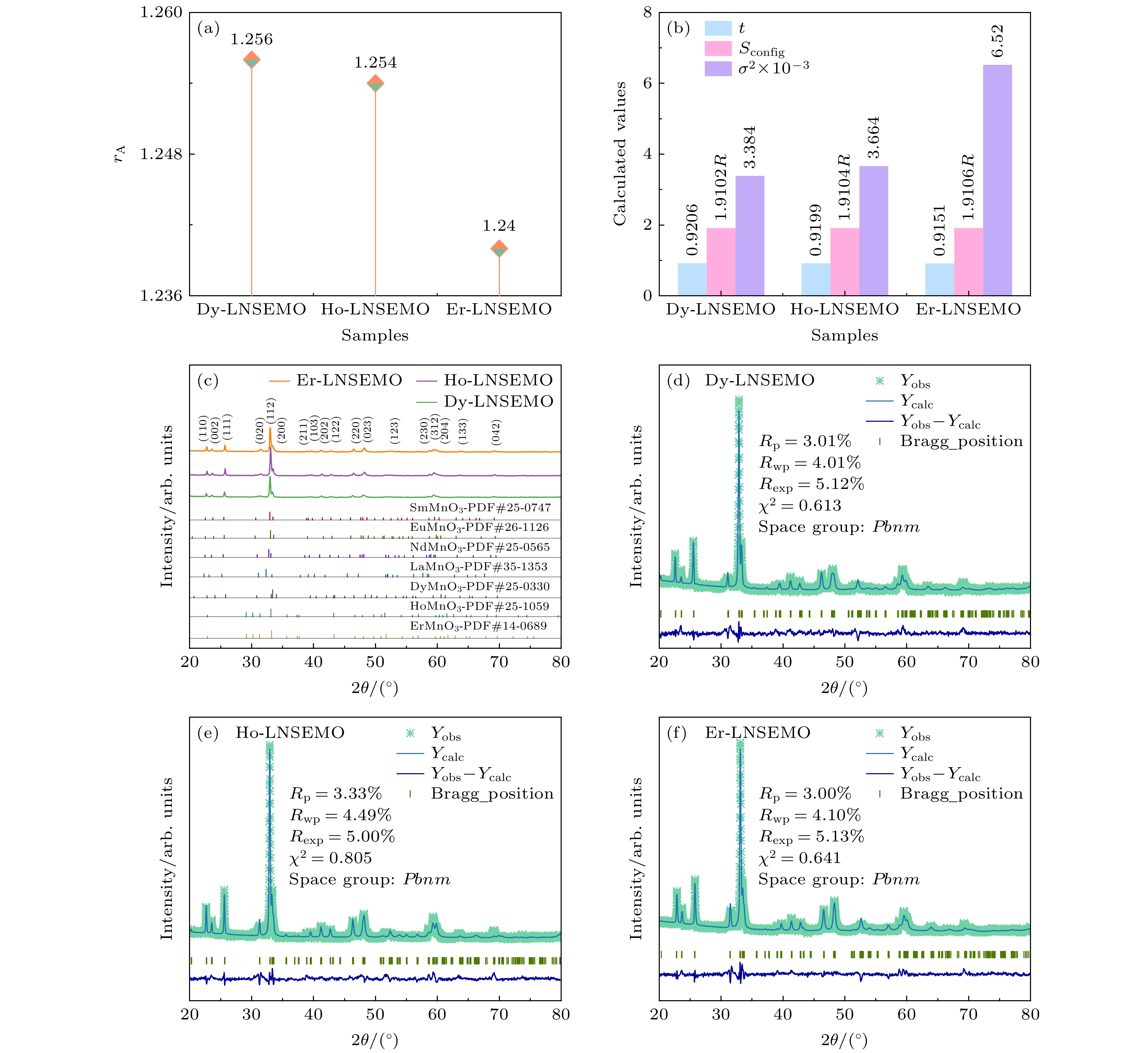 Equimolar ratio high-entropy perovskite ceramics (HEPCs) have attracted much attention due to their excellent magnetization intensity. To further enhance their magnetization intensities, (Ln0.2La0.2Nd0.2Sm0.2Eu0.2)MnO3 (Ln = Dy, Ho and Er, labeled as Ln-LNSEMO) HEPCs are designed based on the configuration entropy Sconfig, tolerance factor t, and mismatch degree σ2. Single-phase HEPCs are synthesized by the solid-phase method in this work, in which the effects of the heavy rare-earth elements Dy, Ho and Er on the structure and magnetic properties of Ln-LNSEMO are systematically studied. The results show that all Ln-LNSEMO HEPCs exhibit high crystallinity and maintain excellent structural stability after sintering at 1250 ℃ for 16 h. Ln-LNSEMO HEPCs exhibit significant lattice distortion effects, with smooth surface morphology, clearly distinguishable grain boundaries, and irregular polygonal shapes. In the present work, the influences of A-site average ion radius, grain size and lattice distortion on the magnetic interactions of Ln-LNSEMO HEPCs are investigated. The three high-entropy ceramic samples exhibit hysteresis behavior at T = 5 K, with the Curie temperature TC decreasing as the radius of the introduced rare-earth ions decreases, while the saturation magnetization and coercivity increase accordingly. When the average ionic radius of A-site decreases, the interaction between their valence electrons and local electrons in the crystal increases, thereby enhancing the conversion of electrons to oriented magnetic moments under an external magnetic field. Thus, Er-LNSEMO HEPC shows a higher saturation magnetization strength (42.8 emu/g) and coercivity (2.09 kOe) than the other samples, which is attributed to the strong magnetic crystal anisotropy, larger lattice distortion σ2 (6.52×10–3), smaller average grain size (440.49 ± 22.02 nm), unit cell volume (229.432 Å3) and A-site average ion radius (1.24 Å) of its magnet. The Er-LNSEMO HEPC has potential applications in magnetic recording materials.