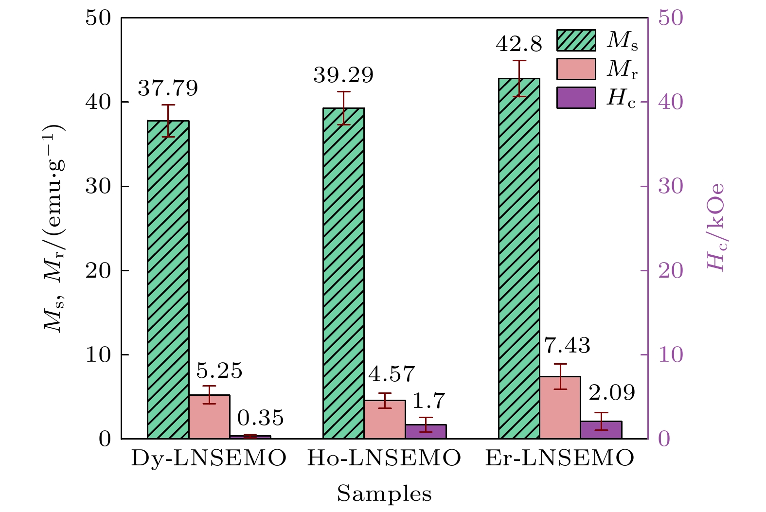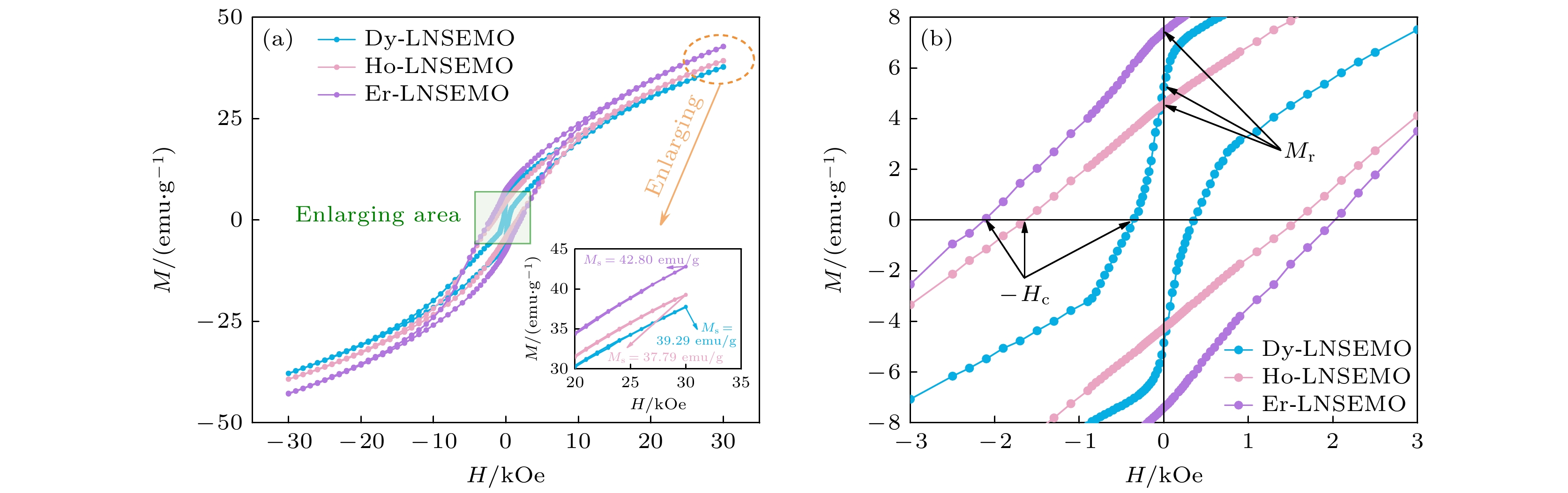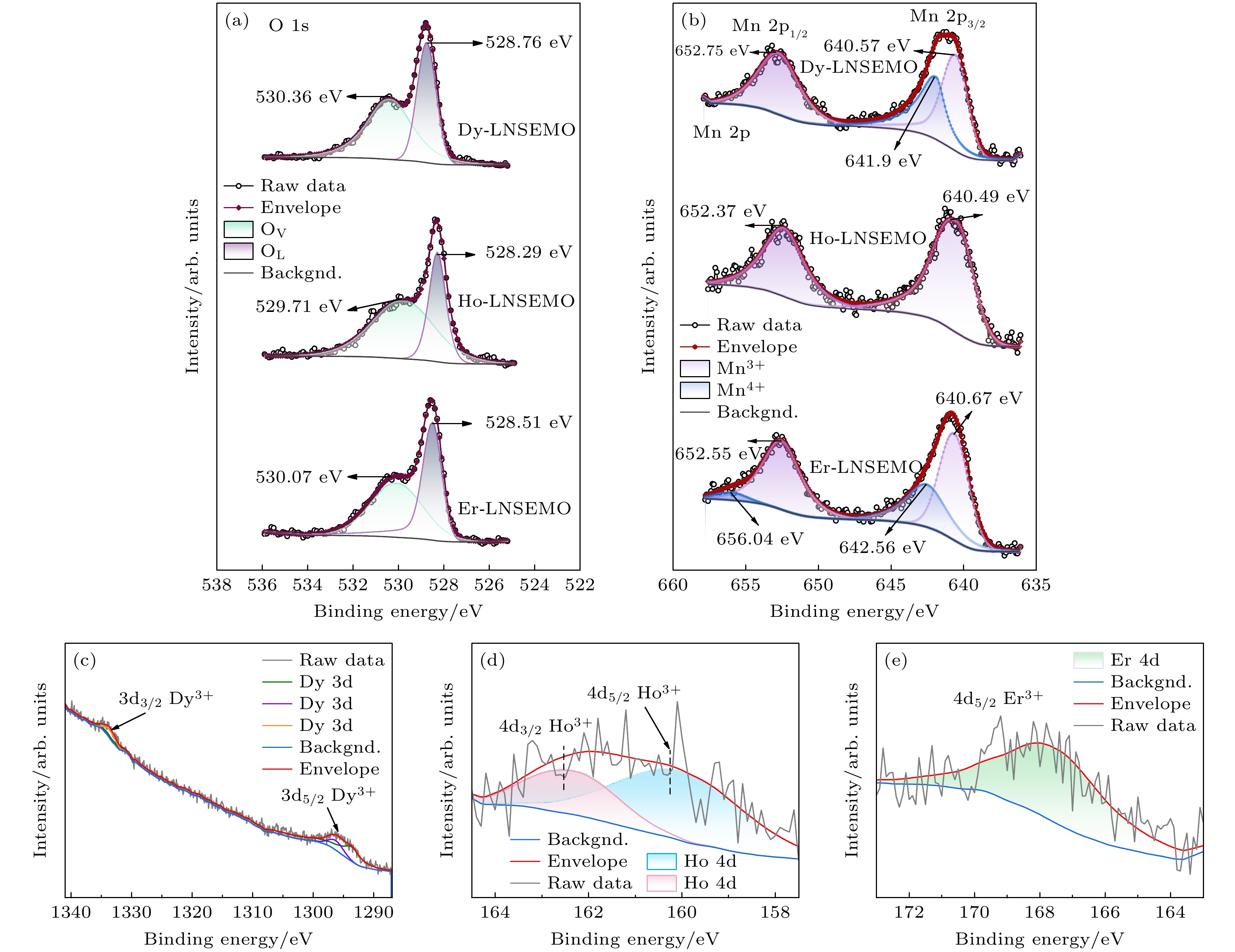 Equimolar ratio high-entropy perovskite ceramics (HEPCs) have attracted much attention due to their excellent magnetization intensity. To further enhance their magnetization intensities, (Ln0.2La0.2Nd0.2Sm0.2Eu0.2)MnO3 (Ln = Dy, Ho and Er, labeled as Ln-LNSEMO) HEPCs are designed based on the configuration entropy Sconfig, tolerance factor t, and mismatch degree σ2. Single-phase HEPCs are synthesized by the solid-phase method in this work, in which the effects of the heavy rare-earth elements Dy, Ho and Er on the structure and magnetic properties of Ln-LNSEMO are systematically studied. The results show that all Ln-LNSEMO HEPCs exhibit high crystallinity and maintain excellent structural stability after sintering at 1250 ℃ for 16 h. Ln-LNSEMO HEPCs exhibit significant lattice distortion effects, with smooth surface morphology, clearly distinguishable grain boundaries, and irregular polygonal shapes. In the present work, the influences of A-site average ion radius, grain size and lattice distortion on the magnetic interactions of Ln-LNSEMO HEPCs are investigated. The three high-entropy ceramic samples exhibit hysteresis behavior at T = 5 K, with the Curie temperature TC decreasing as the radius of the introduced rare-earth ions decreases, while the saturation magnetization and coercivity increase accordingly. When the average ionic radius of A-site decreases, the interaction between their valence electrons and local electrons in the crystal increases, thereby enhancing the conversion of electrons to oriented magnetic moments under an external magnetic field. Thus, Er-LNSEMO HEPC shows a higher saturation magnetization strength (42.8 emu/g) and coercivity (2.09 kOe) than the other samples, which is attributed to the strong magnetic crystal anisotropy, larger lattice distortion σ2 (6.52×10–3), smaller average grain size (440.49 ± 22.02 nm), unit cell volume (229.432 Å3) and A-site average ion radius (1.24 Å) of its magnet. The Er-LNSEMO HEPC has potential applications in magnetic recording materials.