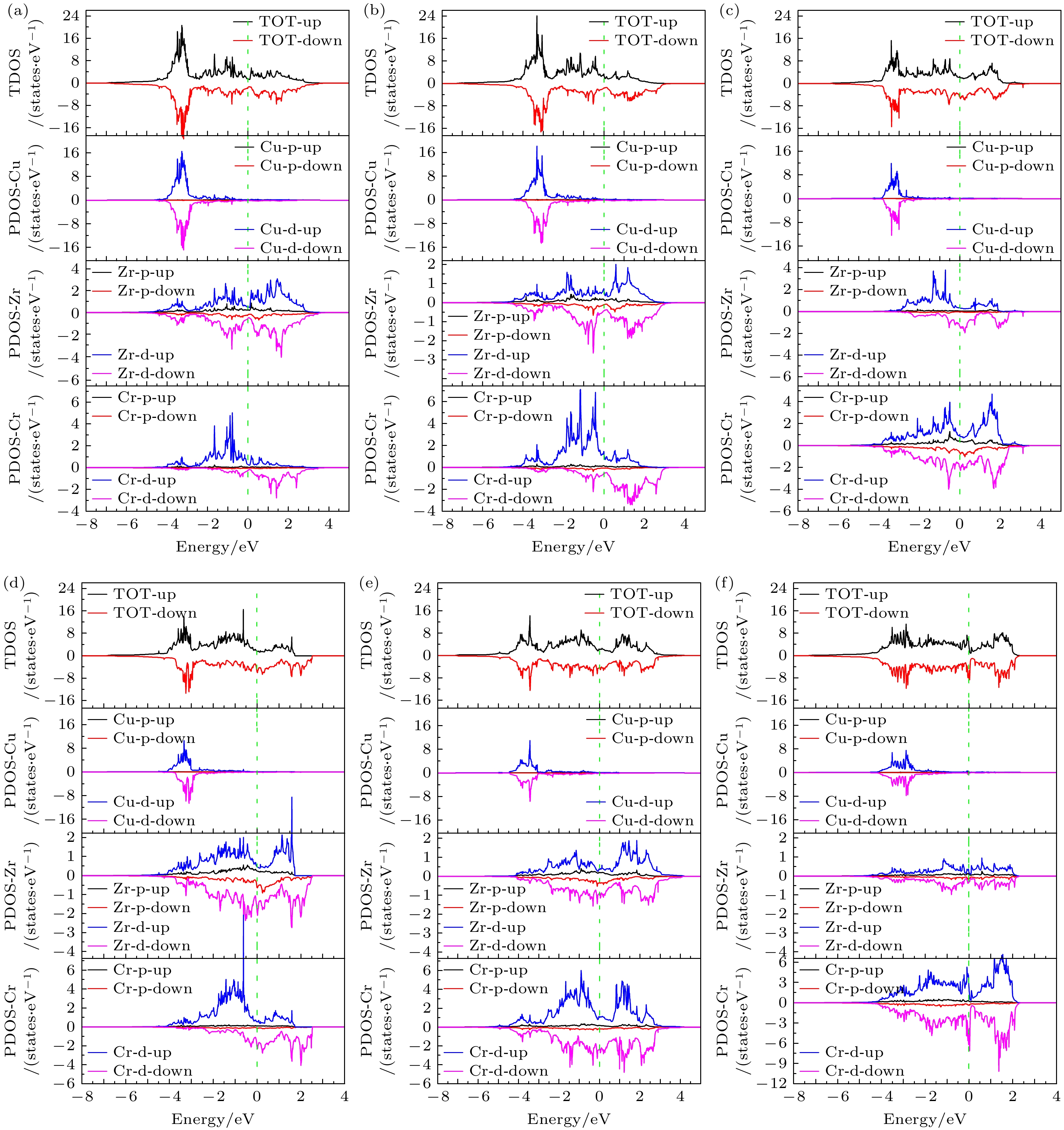 In recent years, the design and development of new high-performance alloys based on first principles have received extensive attention. However, there are few reports on the structural design and thermodynamic properties of Cu-Zr alloys at nanoscale. In this work, based on the crystal structure characteristics of CuZr2, 12 kinds of Cr-doped CuZr2 structures are designed and optimized by the method of Cr atom doping through the first-principle calculation based on the density functional theory, and 6 kinds of mechanically and dynamically stable doped structure models are found. By calculating the electronic structure, elastic properties and hardness of the CuZr2 and its dynamically stable Cr-doped structure, it is found that the studied objects have all energy bands that pass through the Fermi energy level and are metallic. The main contributors to the metallic properties of the CuZr2 are the p and d orbital electrons of Zr, while the main contributors to the metallic properties of the 6 dynamically stable Cr-doped CuZr2 structures are the p and d orbital electrons of Cr and Zr. Meanwhile, CuZr2 has symmetrically distributed spin electrons, which do not show magnetism externally. However, the doping of Cr atoms increases the elemental species of the matrix. In addition to the difference of spin electrons brought by the d-orbital electrons of Cr atoms, the doped Cr atoms destroy the symmetrical distribution of electrons with different spin directions in the p- and d-orbitals of Zr atoms in the matrix, so that the designed 6 dynamically stable Cr-doped CuZr2 structures exhibit ferromagnetic properties with magnetic moments ranging from 0.303μB to 5.243μB. In addition, it is found that Cr atoms can improve the mechanical properties of CuZr2. When the Cr atom is used to replace the Zr atom in the matrix, the elastic modulus and hardness of the material can be improved, and when the Cr atom is used to replace the Cu atom in the matrix, the machining properties of the material can be improved due to the reduction of hardness. The datasets presented in this work, including the band structure, density of states, and phonon dispersion frequency, are available fromhttps://www.doi.org/10.57760/sciencedb.j00213.00122 .