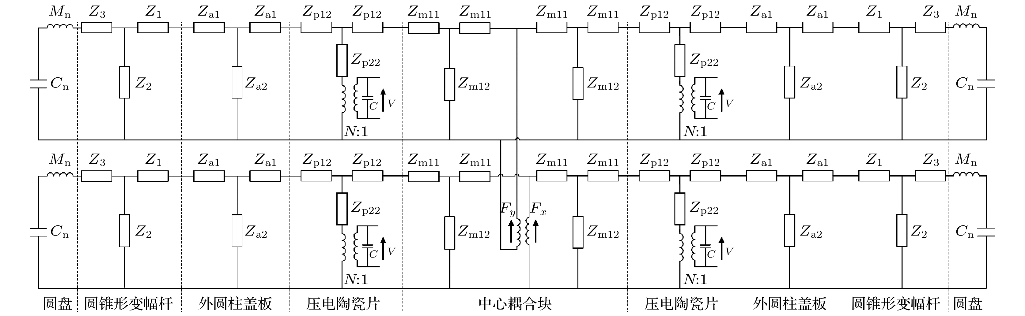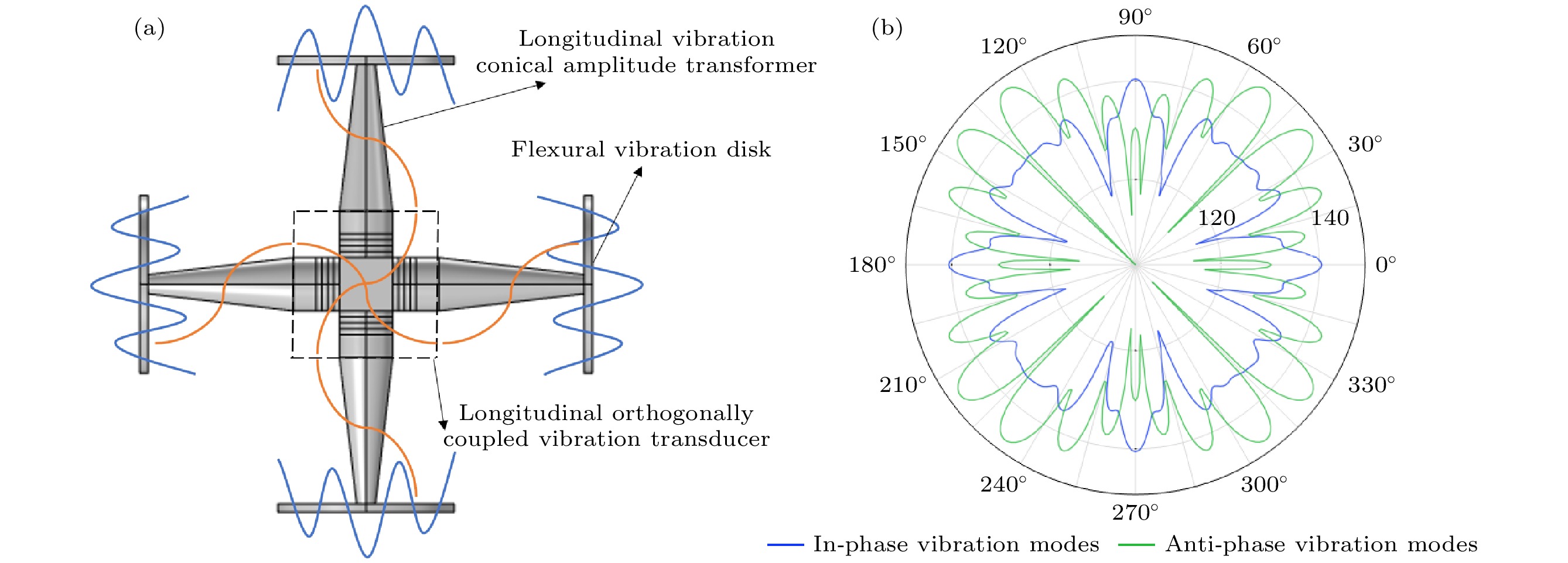 To address the limitations of traditional one-dimensional longitudinal vibration transducers in terms of single-directional acoustic radiation and limited radiation area, this study proposes a novel longitudinal-bending orthogonal coupled piezoelectric ultrasonic vibration system (The vibration schematic diagram of the vibration system is shown in Fig.(a)). By synergistically integrating the orthogonal longitudinal vibration of a sandwich-type piezoelectric transducer, displacement amplification via conical horns, and flexural vibration of metal disks, the system achieves two-dimensional four-directional large-area ultrasonic radiation. A combination of theoretical modeling, finite element simulation, and experimental validation is adopted to investigate the dynamic characteristics the system. First, an electromechanical equivalent circuit model is established based on coupled vibration theory and electro-mechanical analogy principles, from which resonance frequency equation and anti-resonance frequency equation are both derived. Subsequently, finite element simulations are conducted using COMSOL multiphysics to analyze the impedance responses, vibration modes, and acoustic radiation characteristics in air. Finally, prototype fabrication and performance verification are performed through impedance-analyzer measurements, laser vibrometry, and ultrasonic de-misting experiments. Compared with experimental results (22086 Hz and 22196 Hz), the theoretical predictions of anti-phase (22871 Hz) and in-phase (23016 Hz) resonance frequencies show relative errors below 3.7%. Finite element simulations combined with experimental validation confirm the excitation mechanism of 5th-order flexural vibration in the disks. Acoustic directivity patterns reveal a multi-beam radiation pattern with coexistence of main lobes and side lobes (The directional patterns under anti-phase and in-phase vibration modes is shown in Fig.(b)), while in-phase vibration mode demonstrates higher ultrasonic radiation intensity in the near-field region. Furthermore, under 200-W input power, the system reduces smoke concentration within 70 s, demonstrating its feasibility for gas treatment applications. By leveraging the synergistic effect of orthogonal longitudinal coupling and flexural vibration, this design overcomes the limitations of traditional transducers and provides theoretical and technical support for high-power multi-directional acoustic radiation. The research outcomes provide the promising solutions for applications in ultrasonic smoke removal, ultrasonic dust removal, and other gas-phase processing fields.