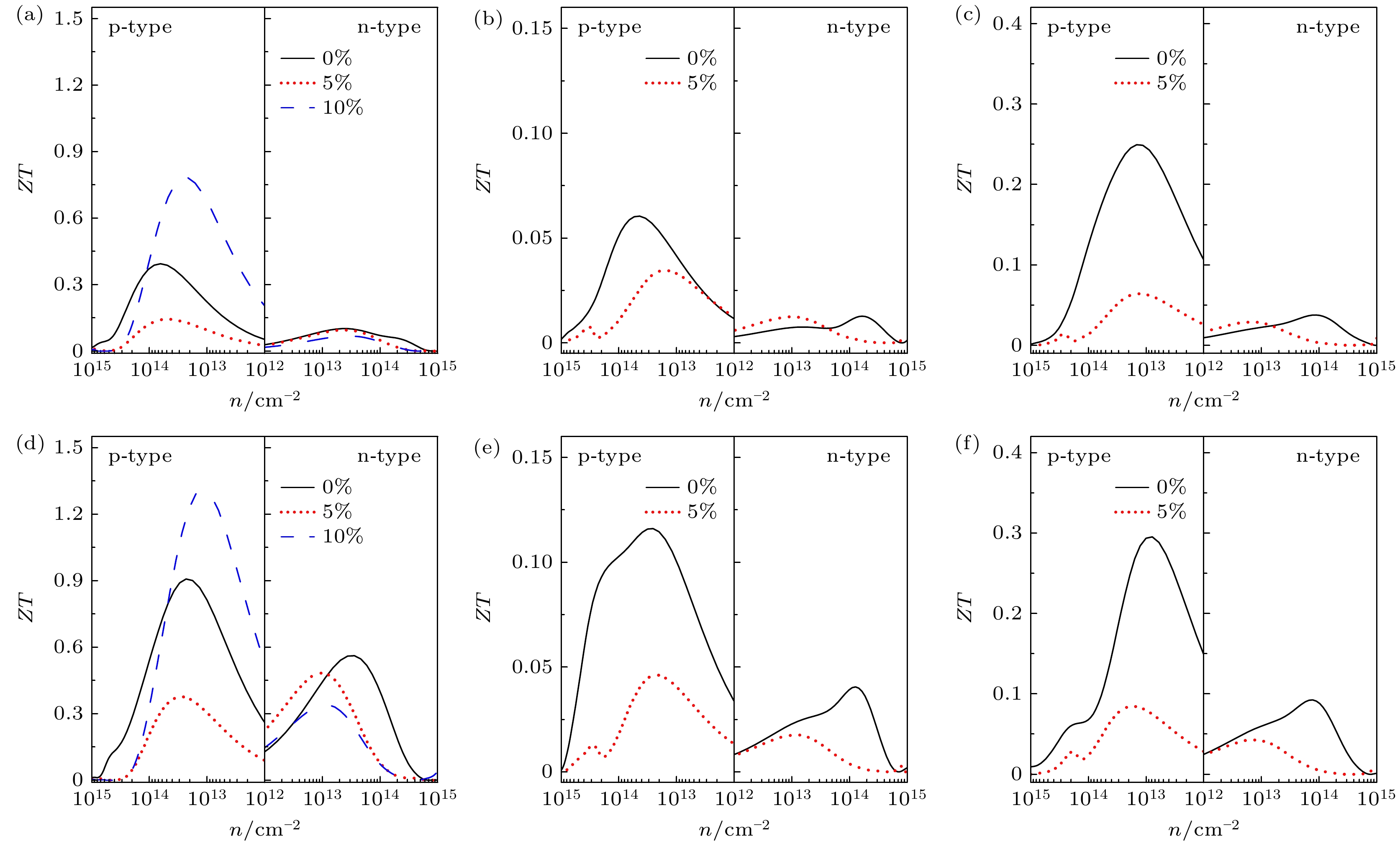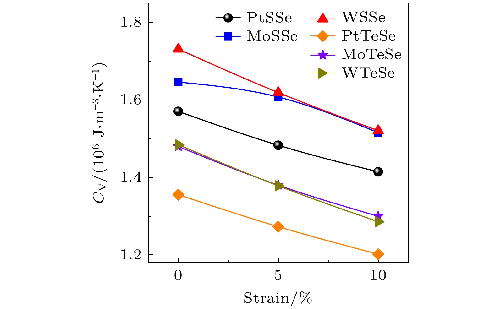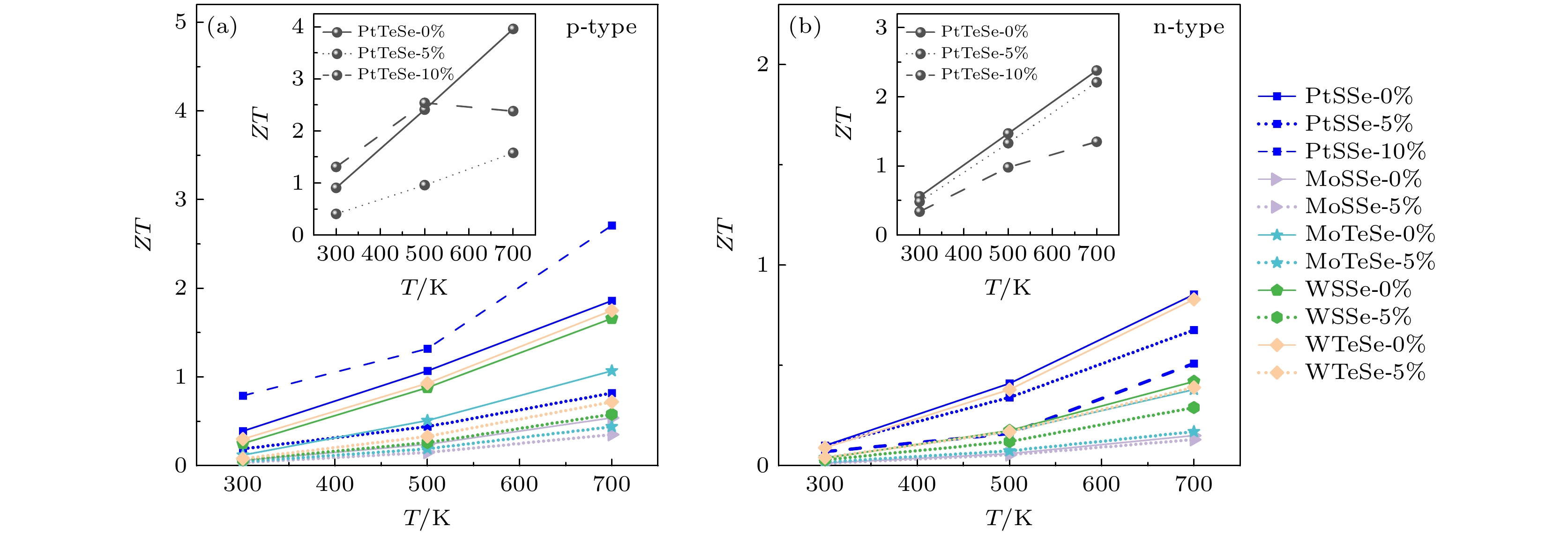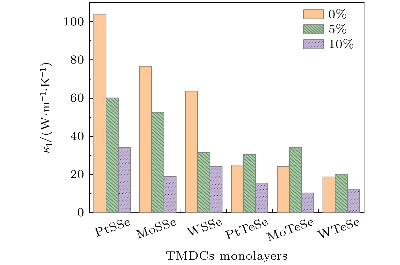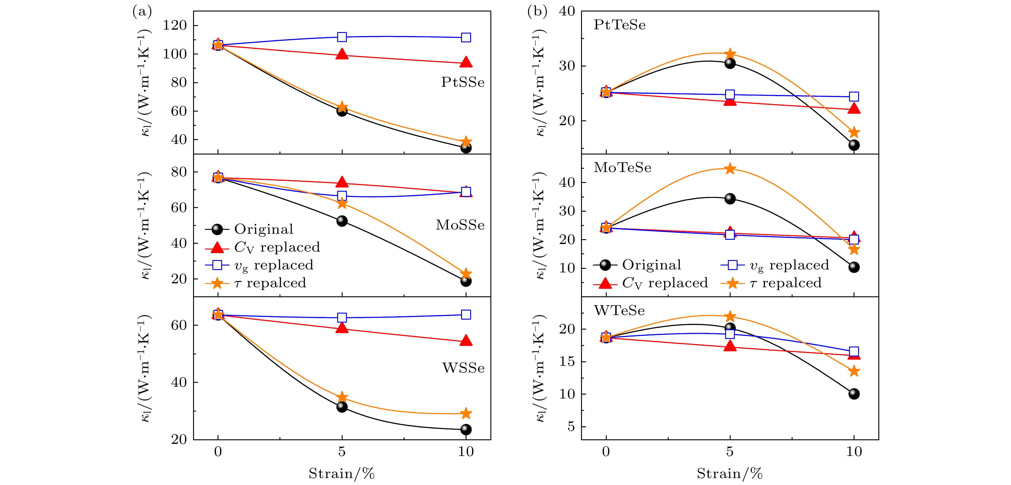 Janus transition metal dichalcogenide monolayers, characterized by antisymmetric crystal structures and unique physical properties, show great potential applications in micro/nano-electronic devices and thermoelectrics. In this work, the strain-tuned phonon thermal transport and thermoelectric performance of six Janus transition metal dichalcogenide monolayers are systematically investigated by first-principles calculations. This study focuses on monolayers of PtSSe and PtTeSe with a 1T-phase crystal structure, as well as monolayers of MoSSe, MoTeSe, WSSe, and WTeSe with a 1H-phase crystal structure. For all these monolayers, first-principles calculations are performed using the open-source software Quantum ESPRESSO. The lattice thermal conductivity is obtained based on lattice dynamics and iterative solutions of the Boltzmann transport equation. The thermal conductivities of PtSSe, MoSSe, and WSSe monolayers are generally higher than those of PtTeSe, MoTeSe, and WTeSe. Acoustic phonons are responsible for the majority of thermal transport, contributing over 95%. Under unstrained conditions, monolayer PtSSe demonstrates a superior thermal conductivity of 104 W·m–1·K–1, making it advantageous for thermal management applications in electronic devices. Under tensile strain, the thermal conductivities of PtSSe, MoSSe, and WSSe monolayers exhibit a monotonic decrease trend; however, for PtTeSe, MoTeSe, and WTeSe monolayers, their thermal conductivities initially show an increase trend, followed by a subsequent decrease trend. Under a 10% tensile strain, the thermal conductivities of these six Janus monolayers all demonstrate a reduction exceeding 60%. Furthermore, this work provides a comprehensive analysis of the influences of strain on specific heat capacity, phonon group velocity, and phonon lifetime. The phonon mode-level analysis and cross-calculated thermal conductivity (with specific heat capacity, phonon group velocity, and phonon lifetime replaced by values under different strain conditions) reveal that phonon lifetime is the dominant factor governing thermal conductivity under strain. For electrical transport properties, calculations are performed using the Boltzmann transport equation based on deformation potential theory. At room temperature, the thermoelectric figure of merit (ZT) for PtTeSe is 0.91 without strain, which can be improved to 1.31 under 10% tensile strain. The ZT value reaches as high as 3.96 for p-type PtTeSe and 2.38 for n-type PtTeSe at 700 K, indicating that the PtTeSe monolayer is a highly promising thermoelectric material. Strain-induced enhancement in the thermoelectric performance of PtTeSe is facilitated by reducing lattice thermal conductivity and reconfigurating the band structure. This work demonstrates that strain engineering is an effective strategy for adjusting the thermal transport and thermoelectric properties of Janus transition metal dichalcogenide monolayers.