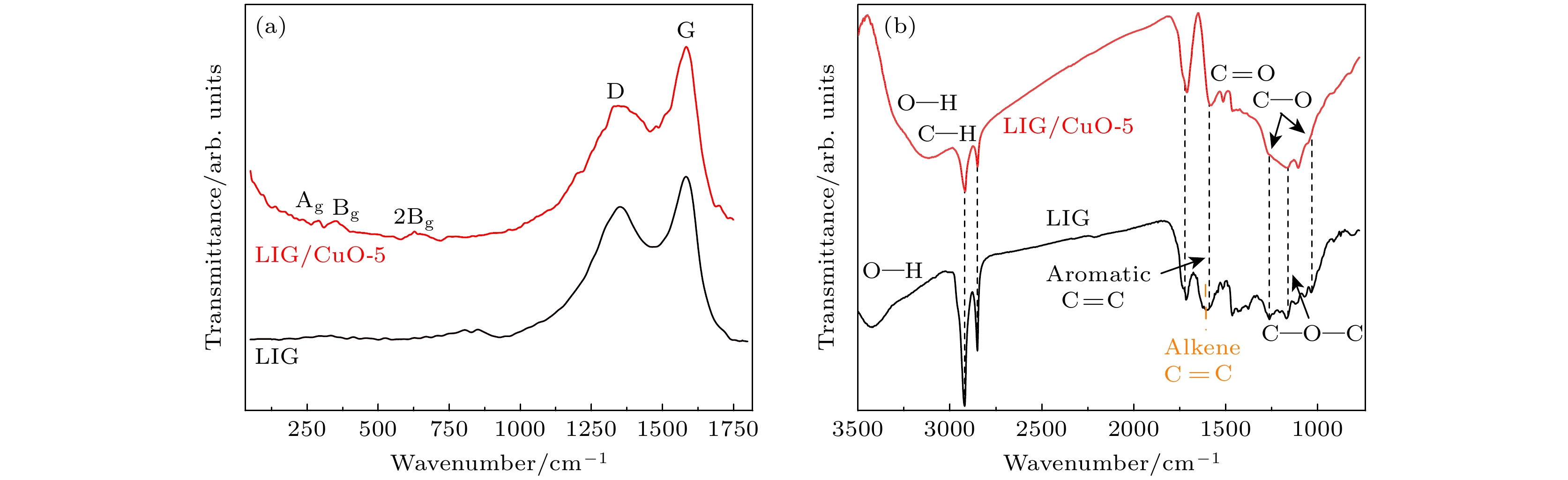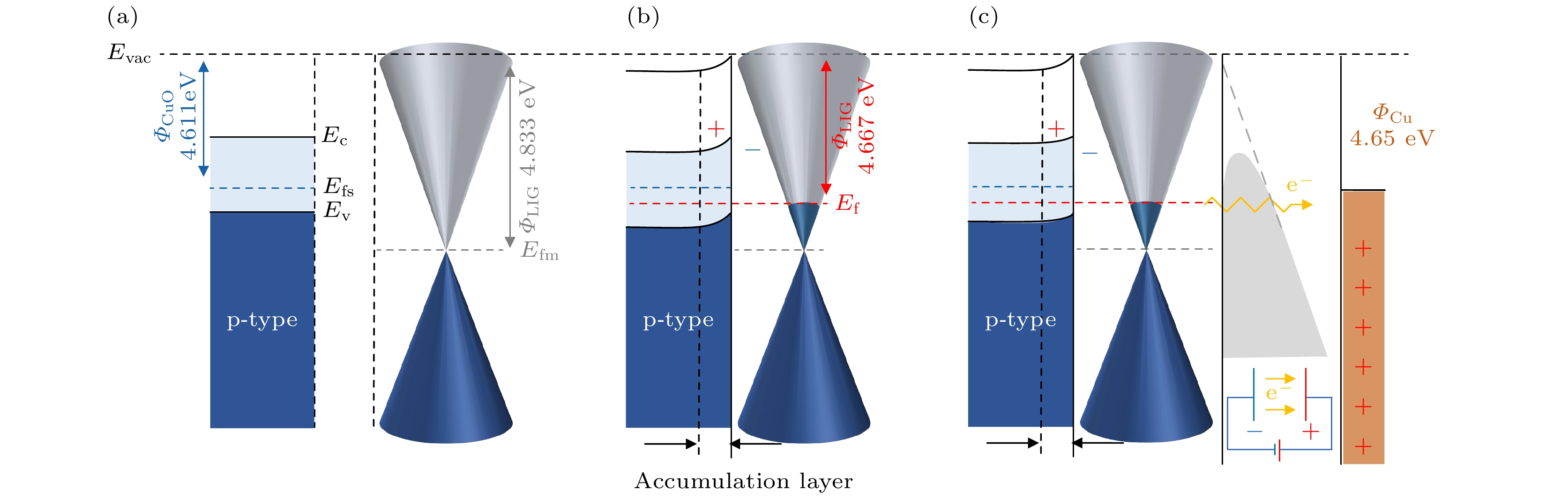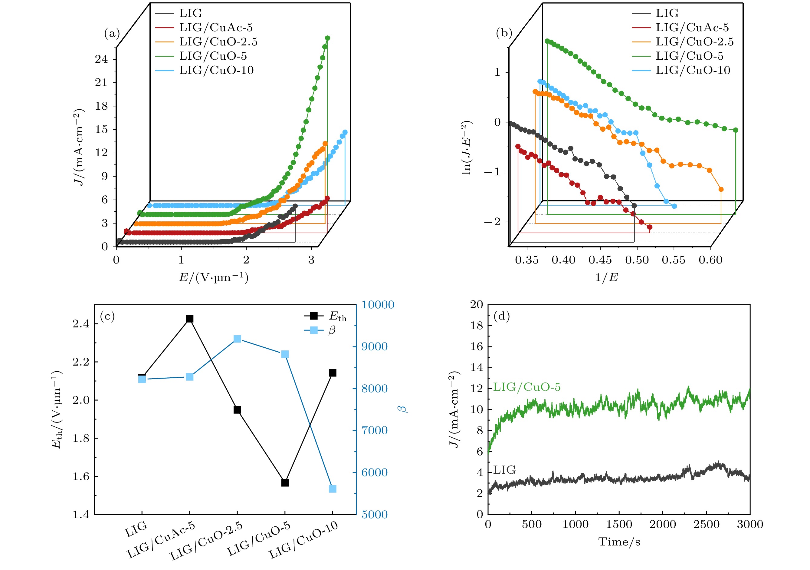Three-dimensional (3D) graphene materials have excellent electronic emission performance and mechanical stability, showing significant advantages in the field of high current density field emitters. In this study, copper oxide modified three-dimensional graphene composites (LIG/CuO) are prepared in situ by a femtosecond laser one-step method, which realizes the simultaneous regulation of cork carbonization and copper oxidation. Shallow copper-rich precursors are constructed by copper salt infiltration and ascorbic acid reduction. Laser irradiation is used to synchronously induce the carbonization of cellulose into few-layer graphene and the transformation of Cu into CuO, forming a three-dimensional fiber network of microcrystalline graphene coated with CuO nanoparticles (30–80 nm). The structure exhibits excellent field emission performance: the threshold field of preparing pure laser- induced graphene (LIG) is ~2.12 V/μm and the field enhancement factor is ~8223. After optimizing CuO loading, the threshold field of LIG/CuO-5 is reduced to 1.57 V/μm, the field enhancement factor rises up to ~8823, and the ultra-high current density of 22.71 mA/cm2 is achieved at 2.89 V/μm. The density functional theory (DFT) calculations show that the electrons at the heterojunction interface transfer from CuO to graphene, which reduces the work function of graphene from 4.833 eV to 4.677 eV, and the band bending of CuO surface synergistically reduces the tunneling barrier. In addition, the local electric field enhancement effect of CuO nanoparticles and the optimized distribution density synergistically increase the effective emission point density. The performance improvement is mainly attributed to three synergistic effects: 1) the three-dimensional porous graphene network provides abundant tip emission sites; 2) the introduction of CuO nanoparticles reduces the work function of the composite material from 4.833 eV to 4.667 eV, effectively reducing the electron escape barrier; 3) the heterojunction interface forms a directional electron migration channel under a positive bias electric field, combined with the excellent conductivity of LIG, which significantly improves the electron tunneling efficiency.