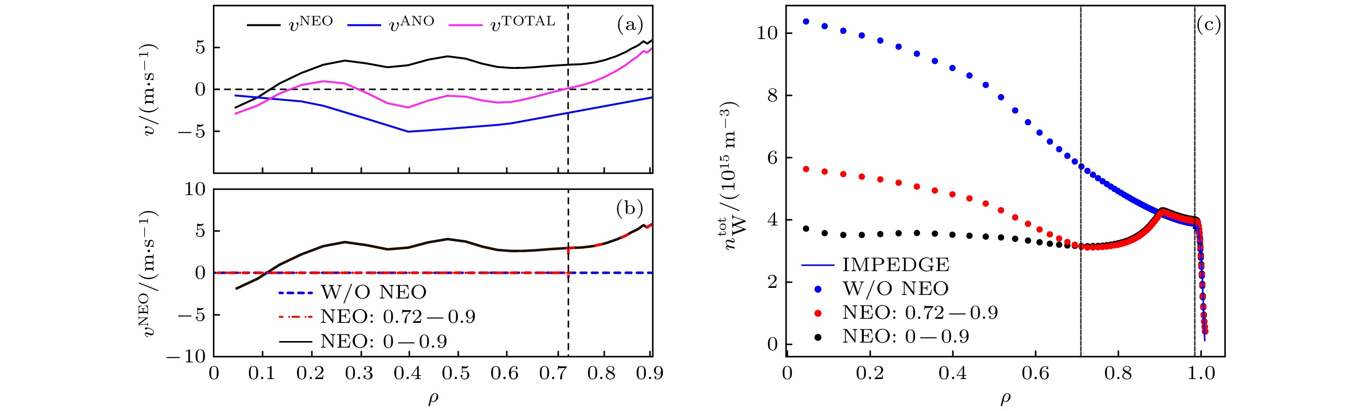 Controlling of tungsten (W) impurity core accumulation is of great significance for the steady-state operation of tokamaks. This work mainly investigates the effect of neoclassical transport on the core accumulation of W impurities by using STRAHL code. The study focuses on the HL-3 device, which will use tungsten divertor and conduct research under argon gas injection discharge conditions. In the simulation, the edge and core background plasma parameters are obtained by SOLPS-ITER and OMFIT simulations, respectively. The distribution of tungsten impurities in the boundary region is simulated using the IMPEDGE code. The edge anomalous transport coefficient in STRAHL is adjusted accordingly, and the simulation results are compared with those from the IMPEDGE to ensure consistency in impurity distribution between the core and edge. In the core region, a numerical scan is performed to adjust the simulation results so that the energy radiation matches the setting values, thereby determining the specific turbulence convection velocity. By setting the coefficients for both the core region and the boundary region, a complete distribution of W impurities from boundary to the core is obtained. To account for the neoclassical transport effects, the neoclassical transport coefficients are calculated using the subroutine NEOART and applied to the impurity transport simulation, and the simulation region is set from\begin{document}$ \rho =0 $\end{document} to 0.9. On this basis, the transport of W impurities with and without neoclassical convection is simulated. The simulation results show that without neoclassical convection, anomalous transport dominates the impurity transport, which is inward and enhances impurity accumulation in the core, and the core impurity density reaches \begin{document}$ 1.1\times {10}^{16}\;{{\mathrm{m}}}^{-3} $\end{document} . After introducing neoclassical convection which is outward, it can offset the inward anomalous convection and significantly reduces the W impurity density in the core, thereby significantly reducing the core tungsten impurity density to \begin{document}$ 4.0\times {10}^{15}\;{{\mathrm{m}}}^{-3} $\end{document} . In addition, the neoclassical convection in the region of \begin{document}$ \rho$\end{document} = 0.72–0.90 plays a more important role in reducing the core impurity density. Further analysis of the components of neoclassical convection shows that the Pfirsche-Schlüter (PS) component dominates the neoclassical convection term, which is mainly driven by the ion temperature gradient term. Therefore, experimentally, plasma heating can be used to enhance the temperature gradient and suppress impurity core accumulation.