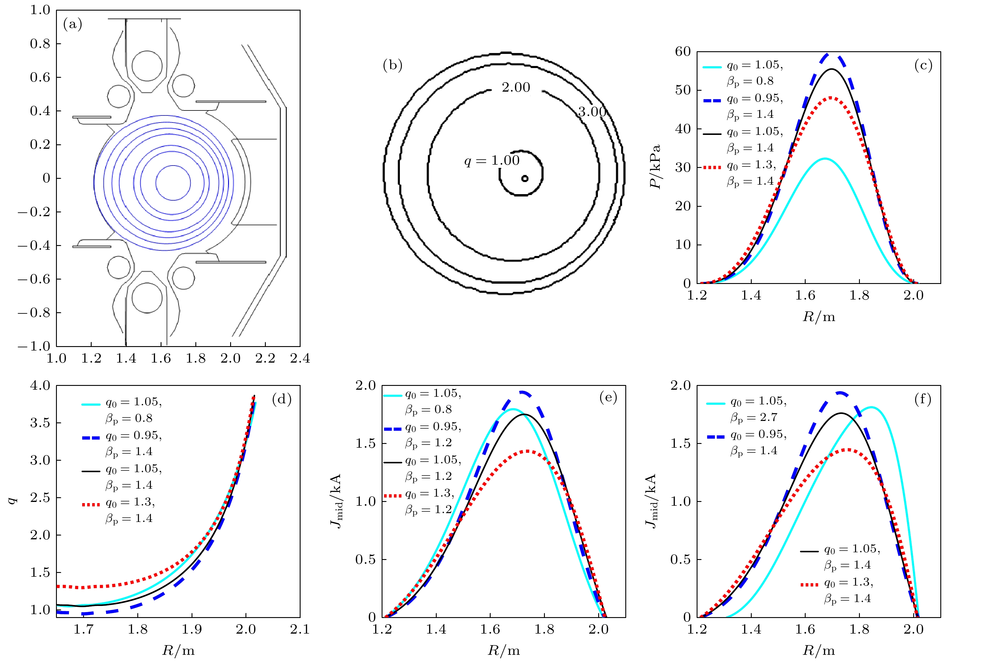 Circular cross-section plasma is the most basic form of tokamak plasma and the fundamental configuration for magnetic confinement fusion experiments. Based on the HL-2A limiter discharge experiments, the magnetohydrodynamic (MHD) equilibrium and MHD instability of circular cross-section tokamak plasmas are investigated in this work. The results show that when\begin{document}$ {q}_{0}=0.95 $\end{document} , the internal kink mode of \begin{document}$ m/n=1/1 $\end{document} is always unstable. The increase in plasma \begin{document}$ \beta $\end{document} (the ratio of thermal pressure to magnetic pressure) can lead to the appearance of external kink modes. The combination of axial safety factor \begin{document}$ {q}_{0} $\end{document} and edge safety factor \begin{document}$ {q}_{{\mathrm{a}}} $\end{document} determines the equilibrium configuration of the plasma and also affects the MHD stability of the equilibrium, but its growth rate is also related to the size of \begin{document}$ \beta $\end{document} . Under the condition of \begin{document}$ {q}_{{\mathrm{a}}} > 2 $\end{document} and \begin{document}$ {q}_{0} $\end{document} slightly greater than 1, the internal kink mode and surface kink mode can be easily stabilized. However the plasma becomes unstable again and the instability intensity increases as \begin{document}$ {q}_{0} $\end{document} continues to increase when \begin{document}$ {q}_{0} $\end{document} exceeds \begin{document}$ 1 $\end{document} . As the poloidal specific pressure (\begin{document}$ {\beta }_{{\mathrm{p}}} $\end{document} ) increases, the MHD instability develops, the equilibrium configuration of MHD elongates laterally, and the Shafranov displacement increases, which in turn has the effect on suppressing instability. Calculations have shown that the maximum \begin{document}$ \beta $\end{document} value imposed by the ideal MHD mode in a plasma with free boundary in tokamak experiments is proportional to the normalized current \begin{document}$ {I}_{{\mathrm{N}}} $\end{document} (\begin{document}$ {I}_{{\mathrm{N}}}={I}_{{\mathrm{p}}}\left({\mathrm{M}}{\mathrm{A}}\right)/a\left({\mathrm{m}}\right){B}_{0}\left({\mathrm{T}}\right) $\end{document} ), and the maximum specific pressure \begin{document}$ \beta \left({\mathrm{m}}{\mathrm{a}}{\mathrm{x}}\right) $\end{document} is calibrated to be \begin{document}$ ~2.01{I}_{{\mathrm{N}}},{\mathrm{ }}{\mathrm{i}}. {\mathrm{e}}. $\end{document} \begin{document}$ \beta \left({\mathrm{m}}{\mathrm{a}}{\mathrm{x}}\right)\sim 2.01{I}_{{\mathrm{N}}} $\end{document} . The operational \begin{document}$ \beta $\end{document} limit of HL-2A circular cross-section plasma is approximately \begin{document}$ {\beta }_{{\mathrm{N}}}^{{\mathrm{c}}}\approx 2.0 $\end{document} . Too high a value of \begin{document}$ {q}_{0} $\end{document} is not conducive to MHD stability and leads the \begin{document}$ \beta $\end{document} limit value to decrease. When \begin{document}$ {q}_{0}=1.3 $\end{document} , we obtain a maximum value of \begin{document}$ {\beta }_{{\mathrm{N}}} $\end{document} of approximately \begin{document}$ 1.8 $\end{document} . Finally, based on the existing circular cross-section plasma, some key factors affecting the operational \begin{document}$ \beta $\end{document} and the relationship between the achievable high \begin{document}$ \beta $\end{document} limit and the calculated ideal \begin{document}$ \beta $\end{document} limit are discussed.