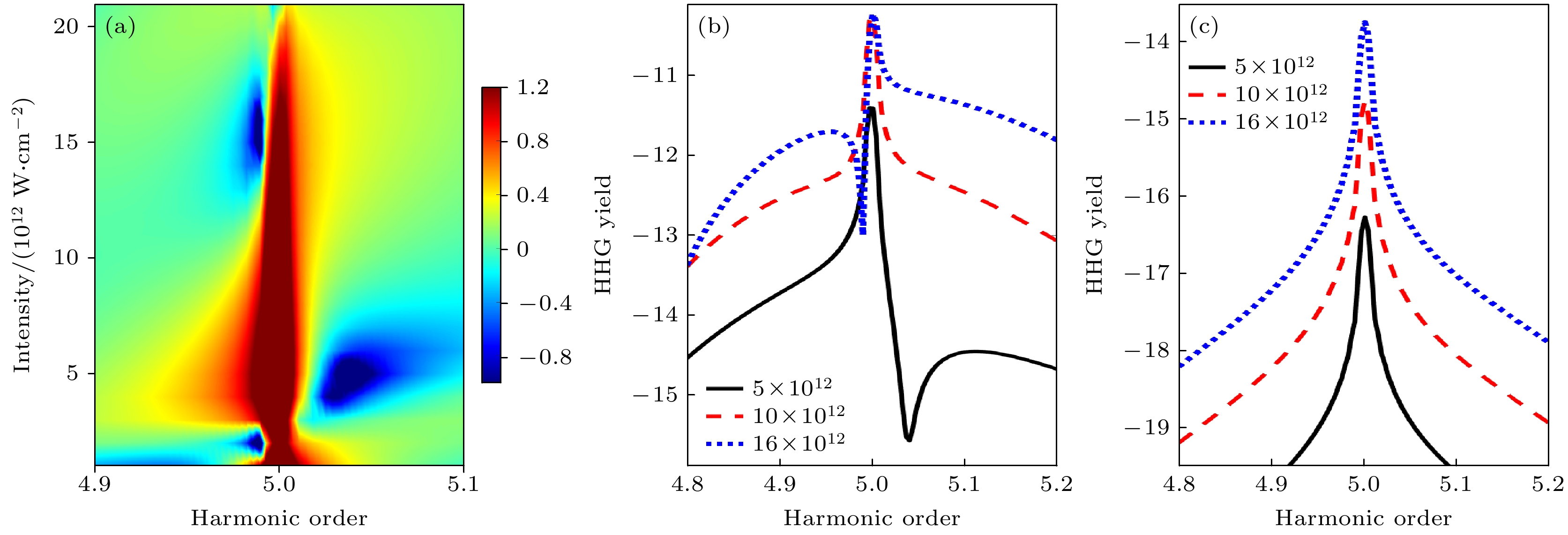 We numerically solved the time-dependent Schrödinger equation (TDSE) for a hydrogen atom interacting with intense near-infrared laser fields to investigate the mechanism of below-threshold high-harmonic generation (HHG). The primary focus was on understanding the spectral features, particularly resonant structures, arising in the fifth harmonic region under specific driving conditions. Our simulations utilized a laser wavelength of 608 nm. At this wavelength, hydrogen atoms can resonantly absorb five photons, promoting electrons from the ground stateWe numerically solved the time-dependent Schrödinger equation (TDSE) for a hydrogen atom interacting with intense near-infrared laser fields to investigate the mechanism of below-threshold high-harmonic generation (HHG). The primary focus was on understanding the spectral features, particularly resonant structures, arising in the fifth harmonic region under specific driving conditions. Our simulations utilized a laser wavelength of 608 nm. At this wavelength, hydrogen atoms can resonantly absorb five photons, promoting electrons from the ground state