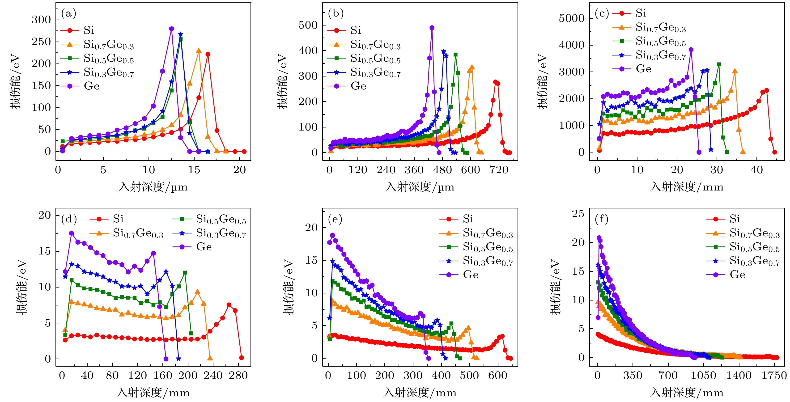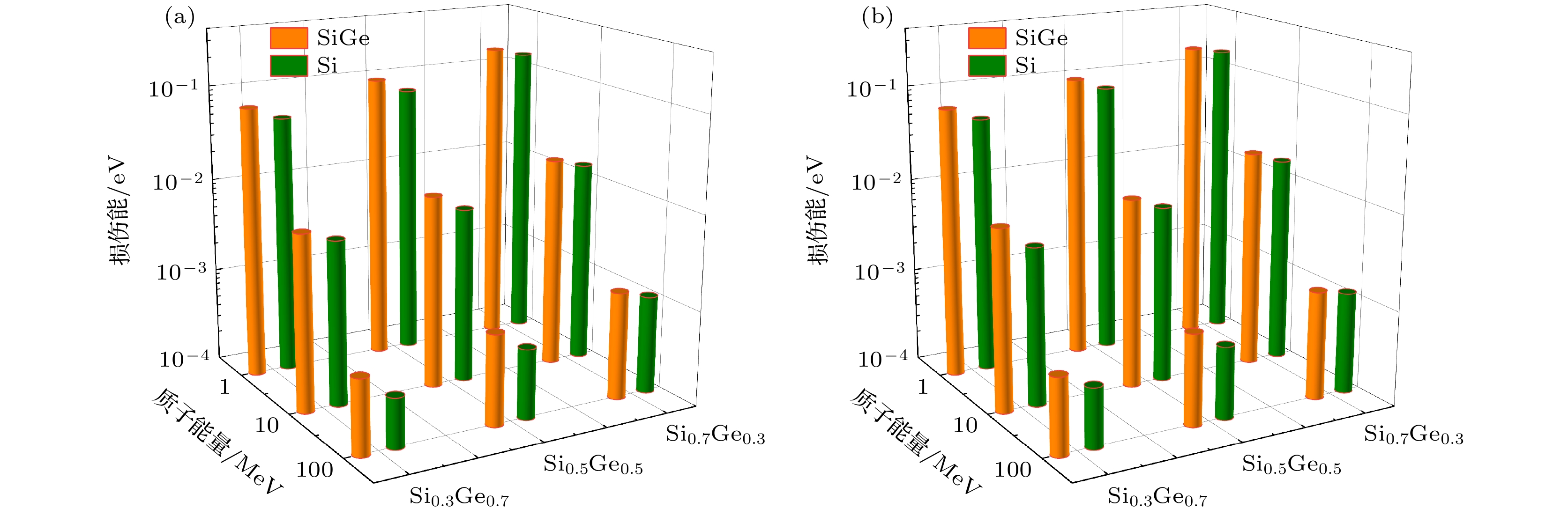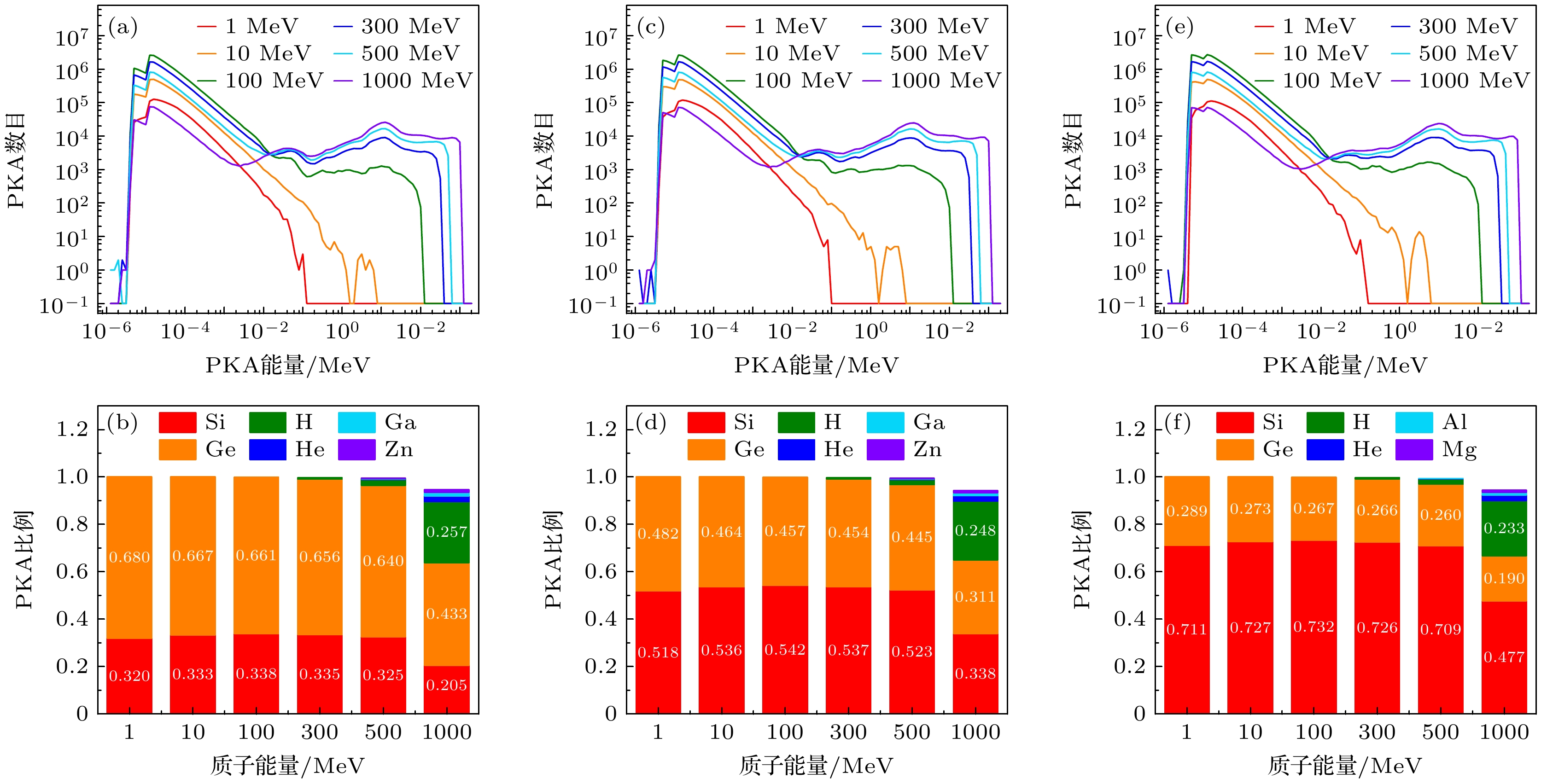 SiGe-based electronics have a promising prospect in the field of space exploration due to the controllable bandgap of SiGe alloys and high compatibility with Si technology. However, they may be susceptible to the influence of energetic particles in space radiation environments. In order to explain the potential displacement damage in SiGe-based electronics, Monte Carlo simulations are conducted to investigate the displacement damage in SiGe alloys and SiGe/Si heterostructures induced by 1–1000 MeV protons. The displacement damage in SiGe alloys is studied by the energy spectra and types of proton-induced primary knock-on atoms (PKAs) and the related damage energy distribution, while the displacement damage in SiGe/Si heterostructures is studied by the damage energy distribution caused by forward- and reverse-incident protons. Low-energy protons (1–100 MeV) primarily generate Si PKAs and Ge PKAs in SiGe alloys through Coulomb scattering and elastic collisions, and the corresponding damage energy distribution exhibits a distinct Bragg peak at the end of the proton range. Meanwhile, high-energy protons (300–1000 MeV) cause significant inelastic collisions in SiGe alloys, leading to a series of other PKA types, with the associated damage energy distribution predominantly located in the front of the proton range. In addition, the damage energy in SiGe/Si heterostructures generally decreases as the proton energy increases, and compared with the forward-incident protons, the reverse-incident protons (10 MeV and 100 MeV) cause greater damage energy on the side of Si substrate at the interface, and result in more noticeable fluctuations in damage energy on both sides of the interface, probably leading to severe displacement damage. Besides, Ge content can affect the PKA type, damage energy distribution, and nonionizing energy loss. As for high-energy protons, high Ge content may lead to a great nonionizing energy loss in SiGe alloys, whereas the Ge content has an insignificant effect on the total damage energy of small-size SiGe/Si heterostructures. In summary, this work indicates that the proton-induced displacement damage in SiGe alloys and SiGe/Si heterostructures is greatly dependent on the proton energy, and low-energy protons are prone to generating massive self-recoil atoms, inducing significant displacement damage in small-size SiGe/Si heterostructures, which will provide theoretical basis and reference for studying displacement damage effect and developing radiation hardening techniques of SiGe-based electronics.