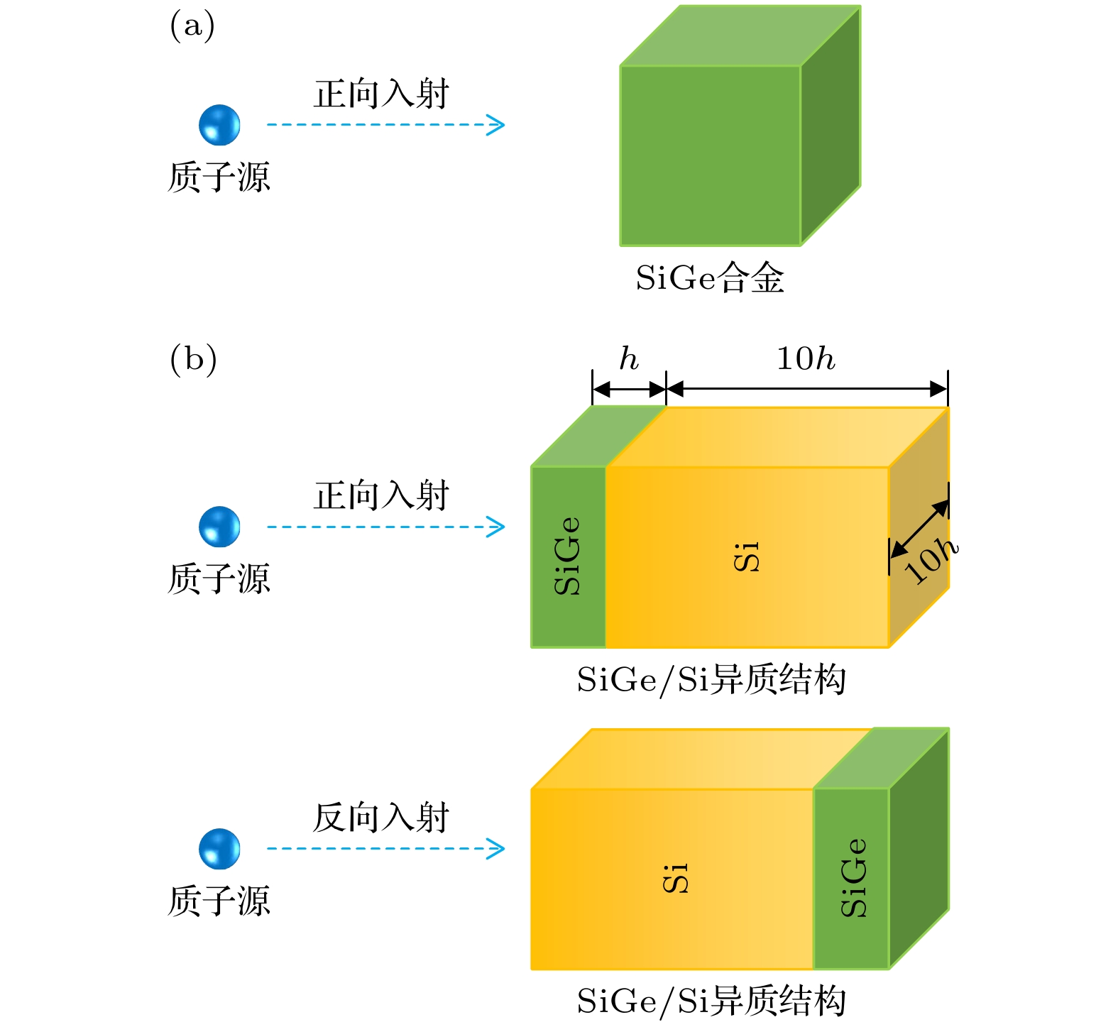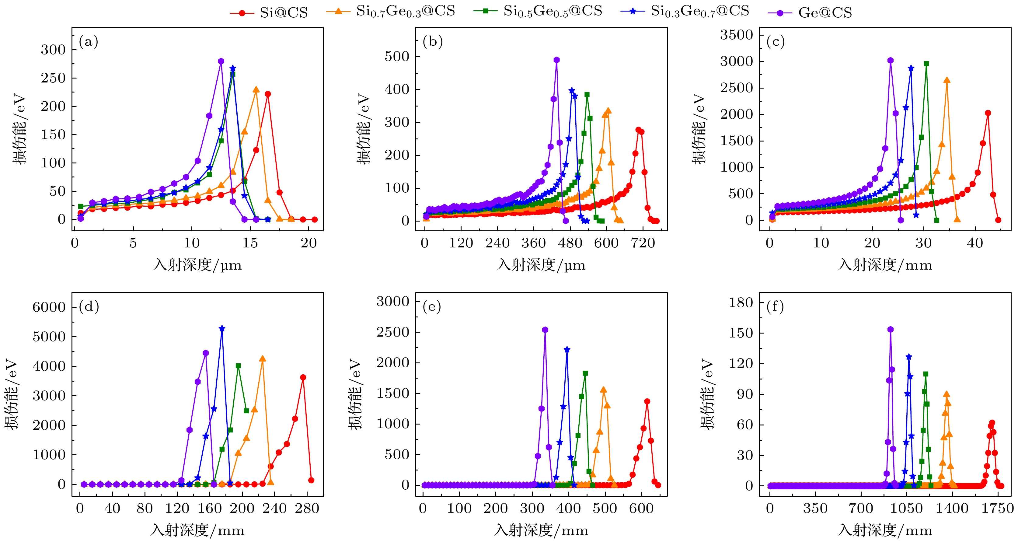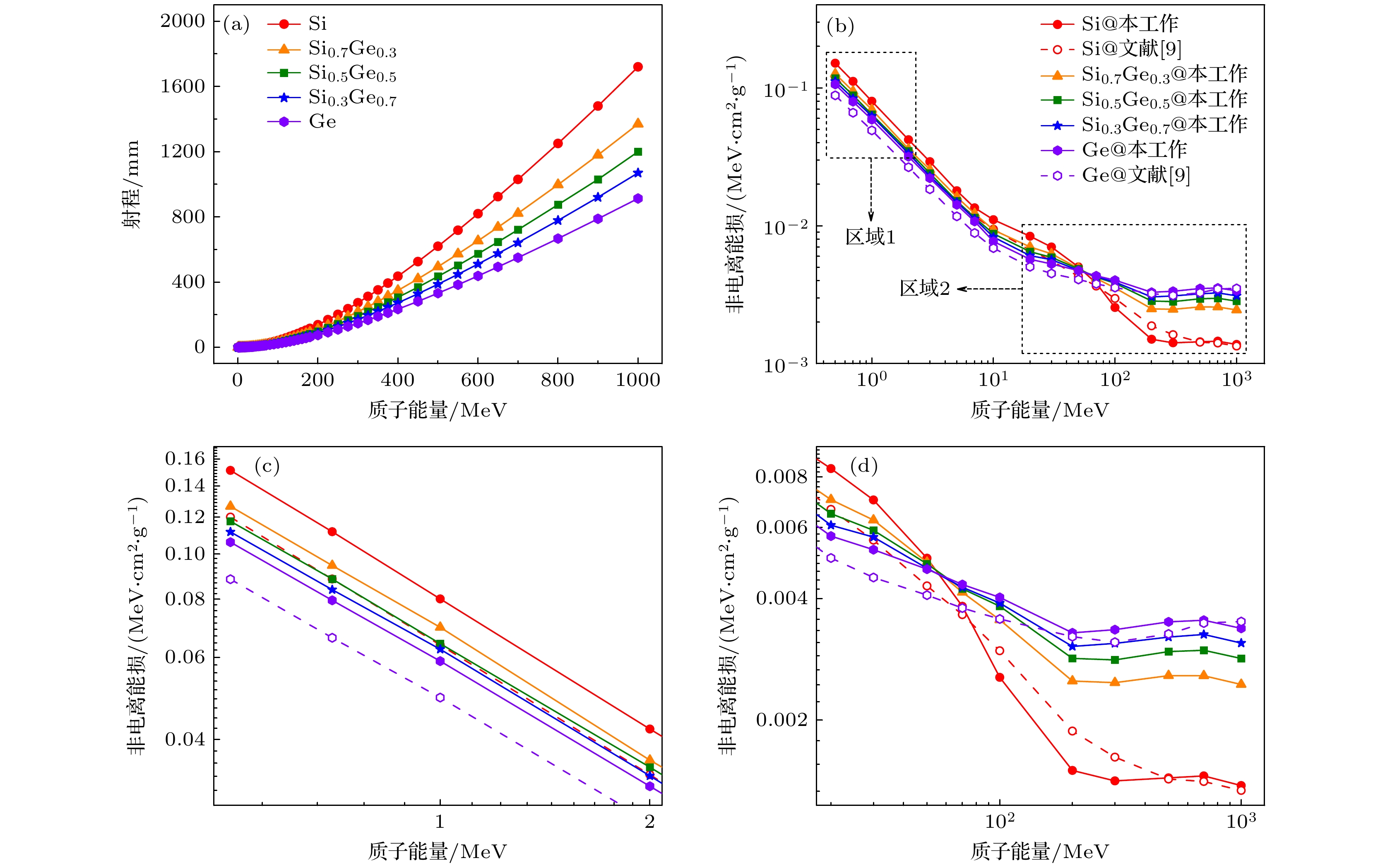 SiGe-based electronics have a promising prospect in the field of space exploration due to the controllable bandgap of SiGe alloys and high compatibility with Si technology. However, they may be susceptible to the influence of energetic particles in space radiation environments. In order to explain the potential displacement damage in SiGe-based electronics, Monte Carlo simulations are conducted to investigate the displacement damage in SiGe alloys and SiGe/Si heterostructures induced by 1–1000 MeV protons. The displacement damage in SiGe alloys is studied by the energy spectra and types of proton-induced primary knock-on atoms (PKAs) and the related damage energy distribution, while the displacement damage in SiGe/Si heterostructures is studied by the damage energy distribution caused by forward- and reverse-incident protons. Low-energy protons (1–100 MeV) primarily generate Si PKAs and Ge PKAs in SiGe alloys through Coulomb scattering and elastic collisions, and the corresponding damage energy distribution exhibits a distinct Bragg peak at the end of the proton range. Meanwhile, high-energy protons (300–1000 MeV) cause significant inelastic collisions in SiGe alloys, leading to a series of other PKA types, with the associated damage energy distribution predominantly located in the front of the proton range. In addition, the damage energy in SiGe/Si heterostructures generally decreases as the proton energy increases, and compared with the forward-incident protons, the reverse-incident protons (10 MeV and 100 MeV) cause greater damage energy on the side of Si substrate at the interface, and result in more noticeable fluctuations in damage energy on both sides of the interface, probably leading to severe displacement damage. Besides, Ge content can affect the PKA type, damage energy distribution, and nonionizing energy loss. As for high-energy protons, high Ge content may lead to a great nonionizing energy loss in SiGe alloys, whereas the Ge content has an insignificant effect on the total damage energy of small-size SiGe/Si heterostructures. In summary, this work indicates that the proton-induced displacement damage in SiGe alloys and SiGe/Si heterostructures is greatly dependent on the proton energy, and low-energy protons are prone to generating massive self-recoil atoms, inducing significant displacement damage in small-size SiGe/Si heterostructures, which will provide theoretical basis and reference for studying displacement damage effect and developing radiation hardening techniques of SiGe-based electronics.