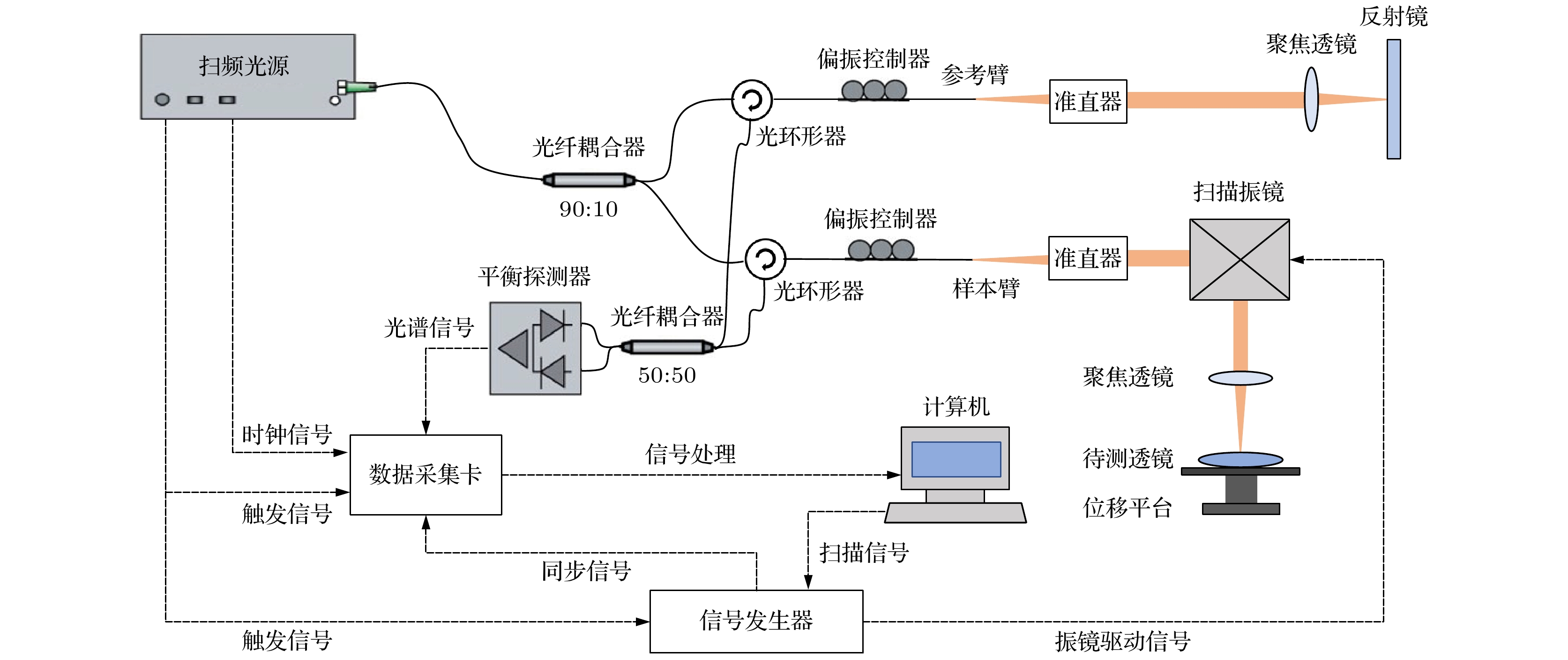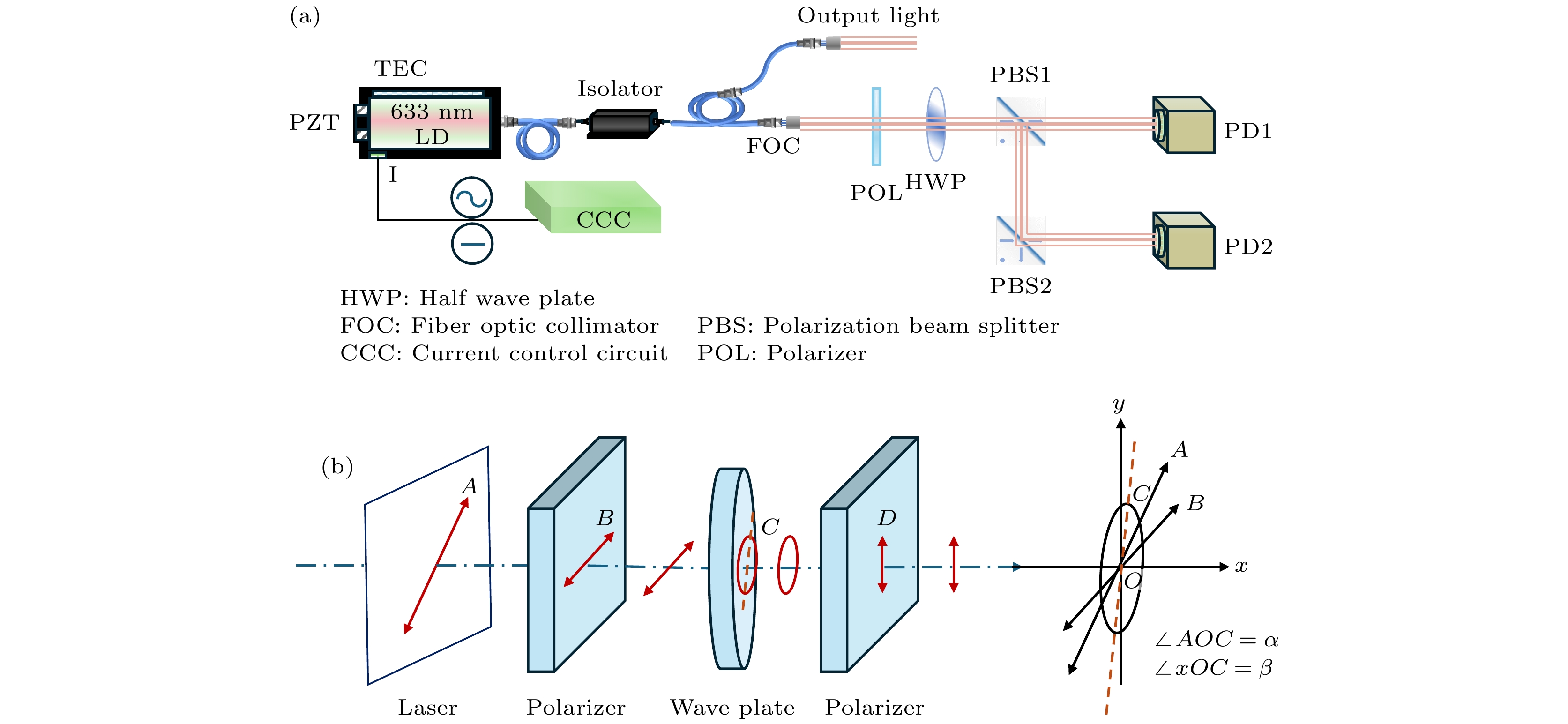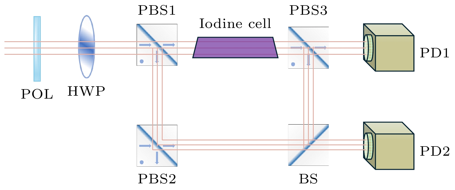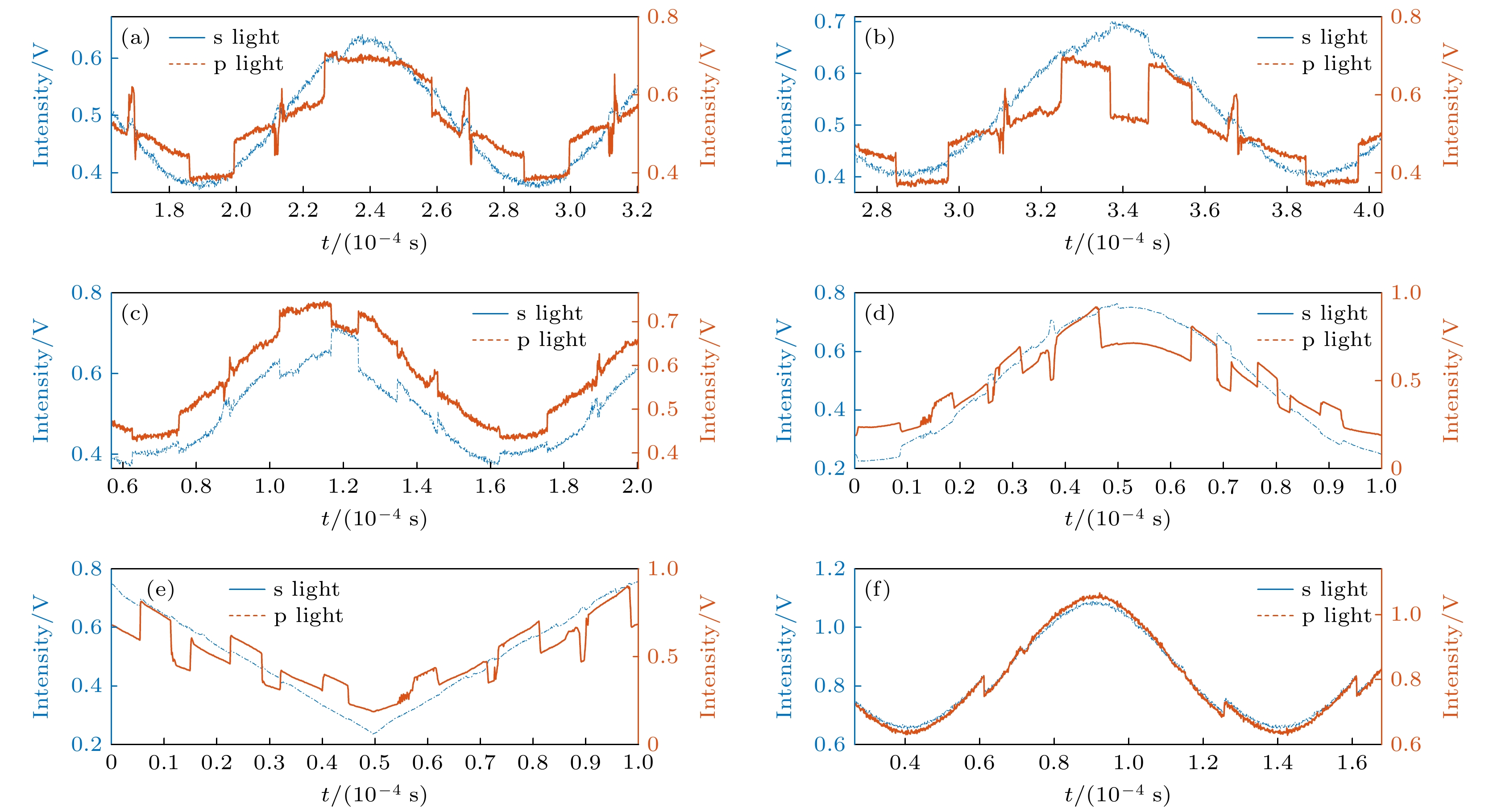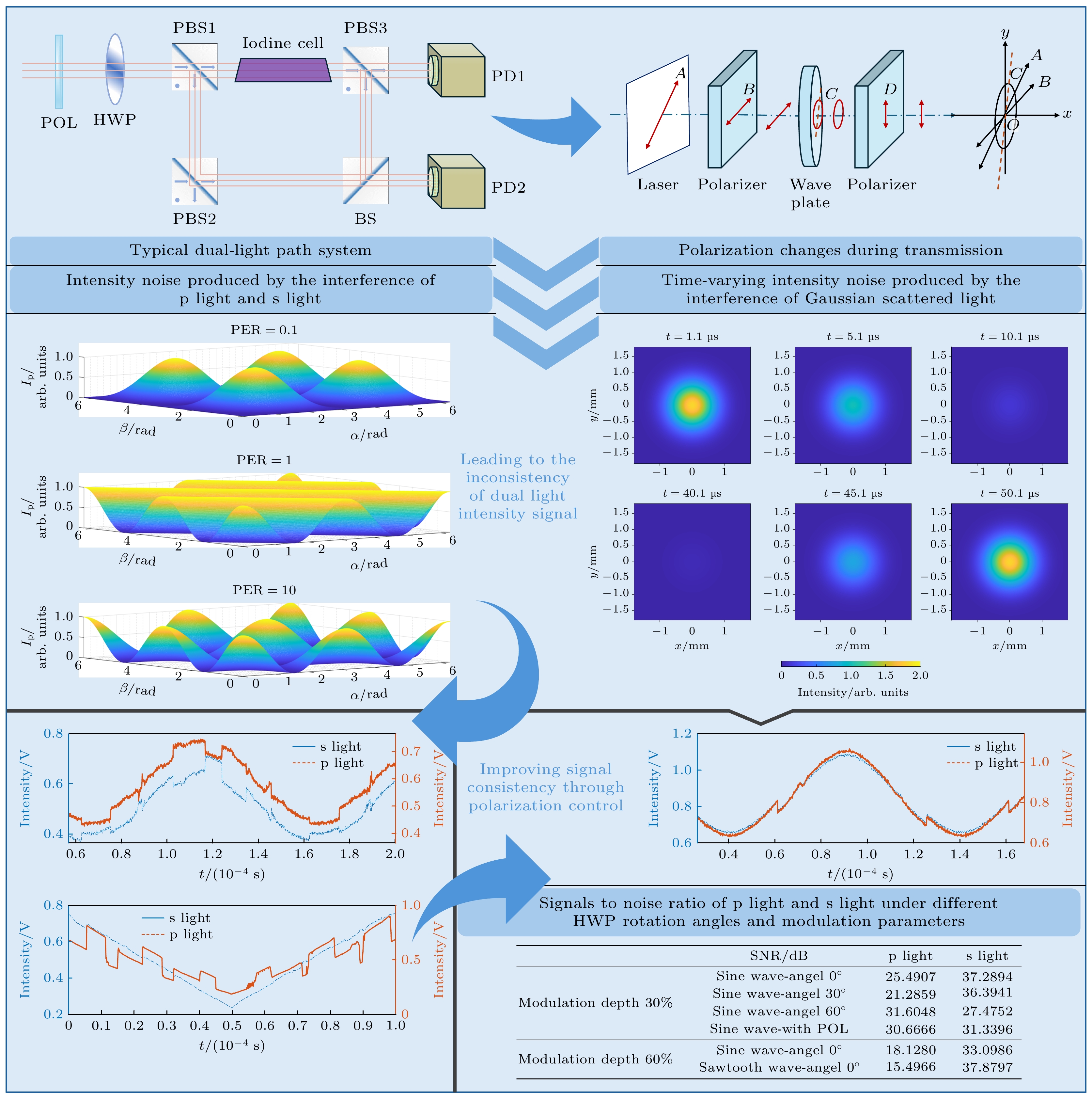 Wavelength-tunable lasers play a crucial role in fields such as precision interferometry and ultra-stable laser applications. The precision of wavelength tuning and the accuracy of frequency stabilization in lasers are the key indicators of their performance. To improve these performance, closed-loop control with dual-beam paths, such as saturated absorption spectrum spatial stabilization, is commonly utilized. The signal-to-noise ratio (SNR) of the control beam detection significantly affects the control precision. Investigating the parameters that influence this SNR and analyzing their relationships are of great engineering significance for further improving the tuning precision and frequency stabilization accuracy of lasers. To increase the SNR, this work examines intensity noise in wavelength-modulation systems based on the polarizer-phase-delay-polarizer model. A polarization beam splitter (PBS) cannot achieve a zero polarization extinction ratio (PER), thus introducing intensity noise from the interference between p and s polarization light. Additionally, non-ideal stray light, such as back-reflected and scattered light from optical components, further reduces the SNR of the detection signal when it converges on the detector’s active area. This work carries out a detailed analysis of these two types of noise, exploring the effects of factors such as PER, wavelength-modulation range, beam diameter, laser polarization direction, and modulation frequency. Based on the theoretical analysis, it also simulates optical phenomena involving half-wave plates with different tilt angles and rotation angles, as well as dual-frequency Gaussian elliptically polarized light under various modulation parameters. The theoretical analysis indicates that the intensities of p and s polarization light undergo periodic variations as the angle between the half-wave plate’s optical axis and the PBS’s slow-axis direction, as well as the angle between the linear-polarization direction and the half-wave plate’s optical axis, changes. The extreme positions of these intensities move with the PER changing. At certain specific angles, destructive interference leads to extremely low intensities in both transmitted and reflected light. Furthermore, when the detector receives stray light of multiple frequencies, the synthesized phase varies periodically with wavelength tuning. This means that over time (corresponding to tuning the center wavelength to different values), the interference intensity exhibits periodic changes from constructive interference to destructive interference and then to constructive interference. Consequently, abnormal dips and peaks may appear in the optical signal intensity. A 633-B-A81-SA-PZT laser from LD-PD INC with a 10 mW output is used in the experiment. A true zero-order half-wave plate model centered at 633 nm is adopted in the simulation. The laser wavelength is tunable in the range of 633 nm±10 pm, and 10 kHz sine-wave current modulation is used, with a wavelength-current tuning coefficient of 1 pm/mA. After an isolator, a 90∶10 coupler splits the beam into a 9 mW output and a 1 mW experiment beam, which is collimated and adjusted by a polarizer, a true zero-order half-wave plate, and a PBS to set the ratio of p light power to s light power. Two Thorlabs FDS100 detectors capture the beams, with signals collected via a data acquisition card. The PD1 and PD2 signals show significant differences under certain conditions, and the p and s light signals vary periodically with half-wave plate rotating. Adding a polarizer at the laser exit and adjusting its angle can improve signal consistency. After alignment, the SNR increases from 10 dB to 31 dB. In this study, wavelength of a 633 nm semiconductor laser is tuned by using a saturated absorption spectrum ring light path. Under different modulation conditions, inconsistencies in the intensity signals of two beams are observed. Polarization control increases the SNR to 31 dB, confirming the theoretical model. Additionally, time domain analysis of stray light from the wavelength-tuned source shows that reducing the wavelength tuning range and modulation frequency can effectively suppress high frequency noise.