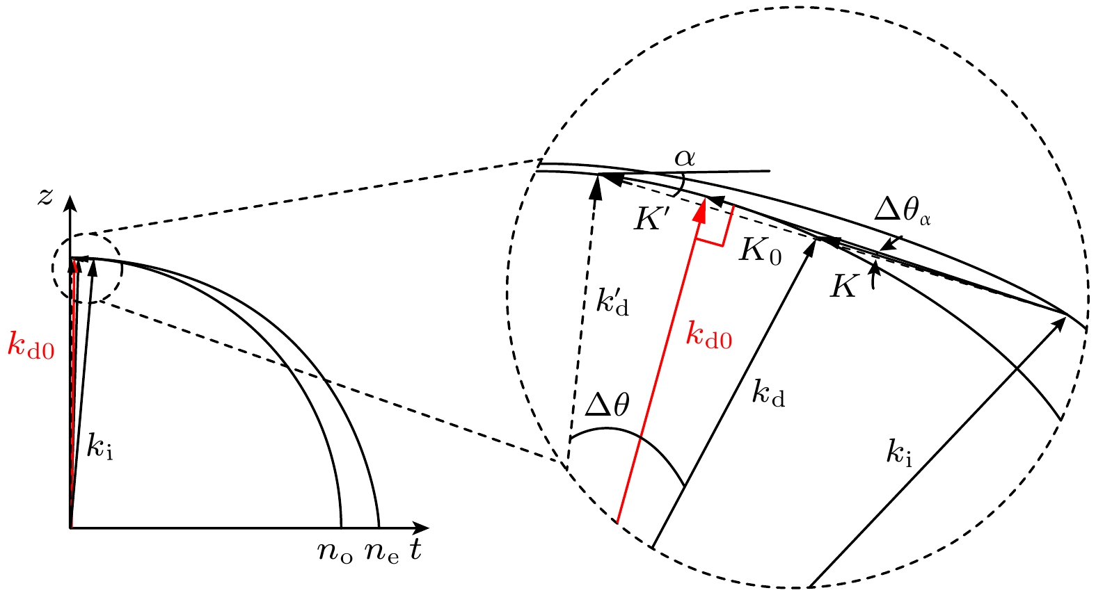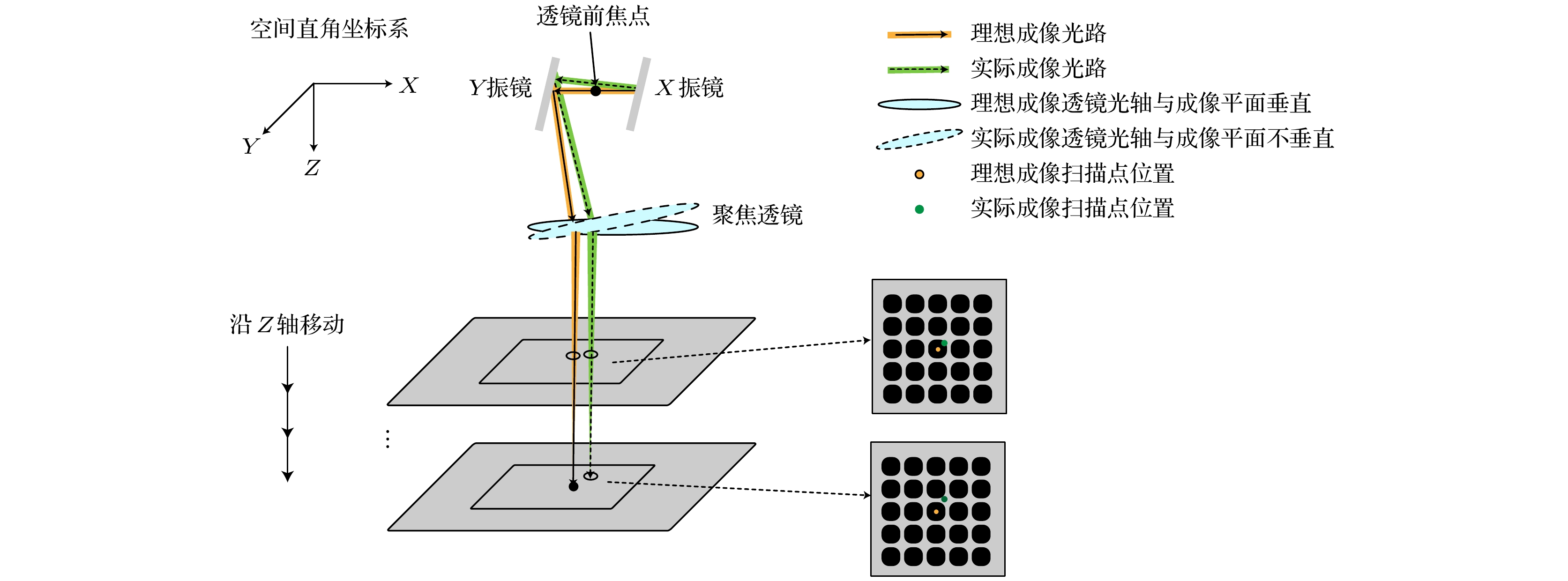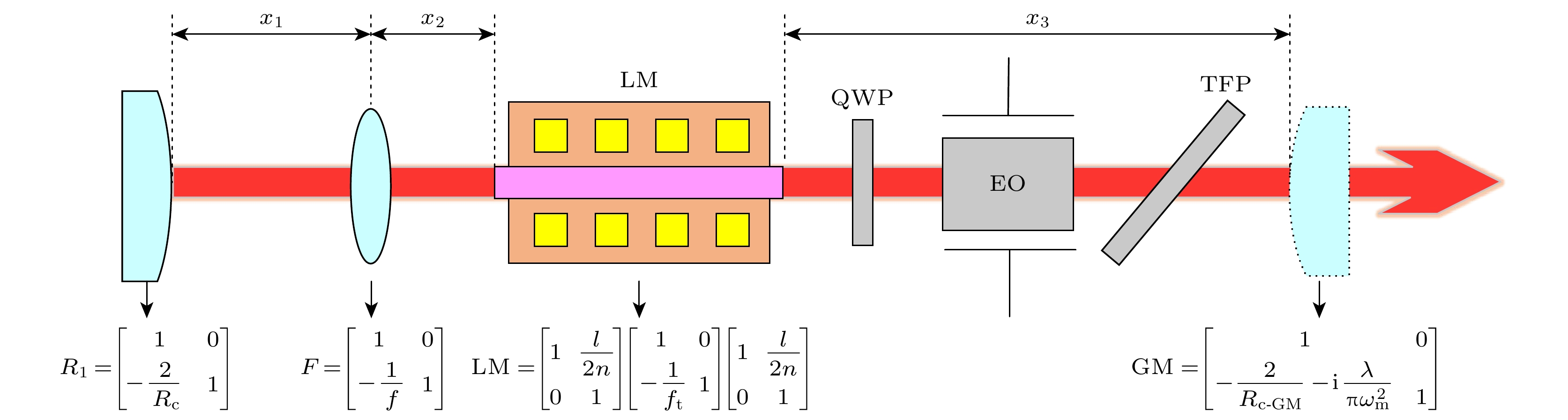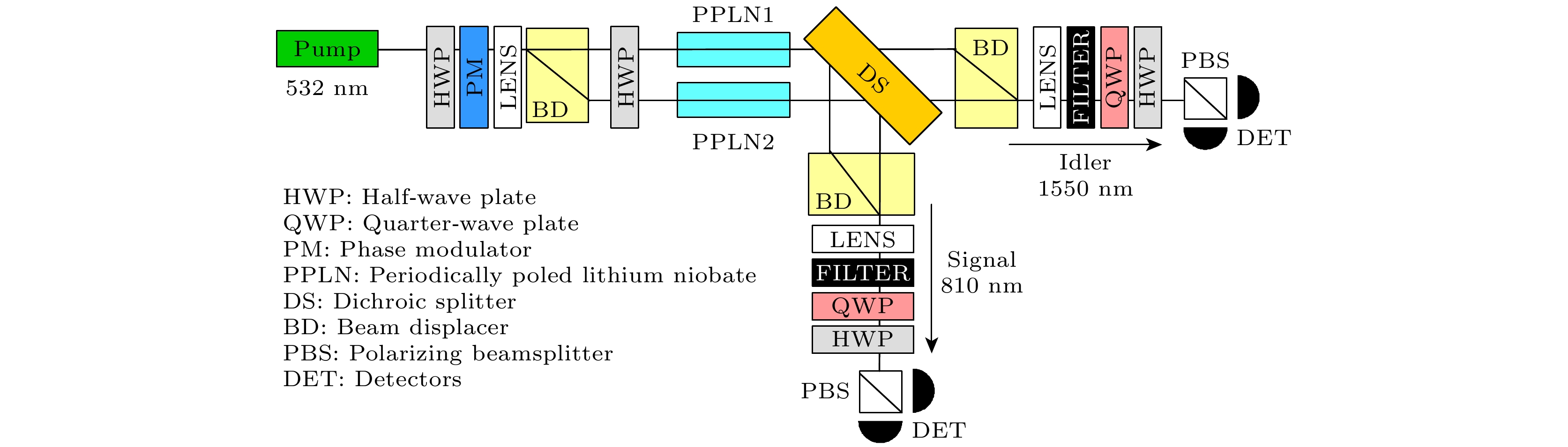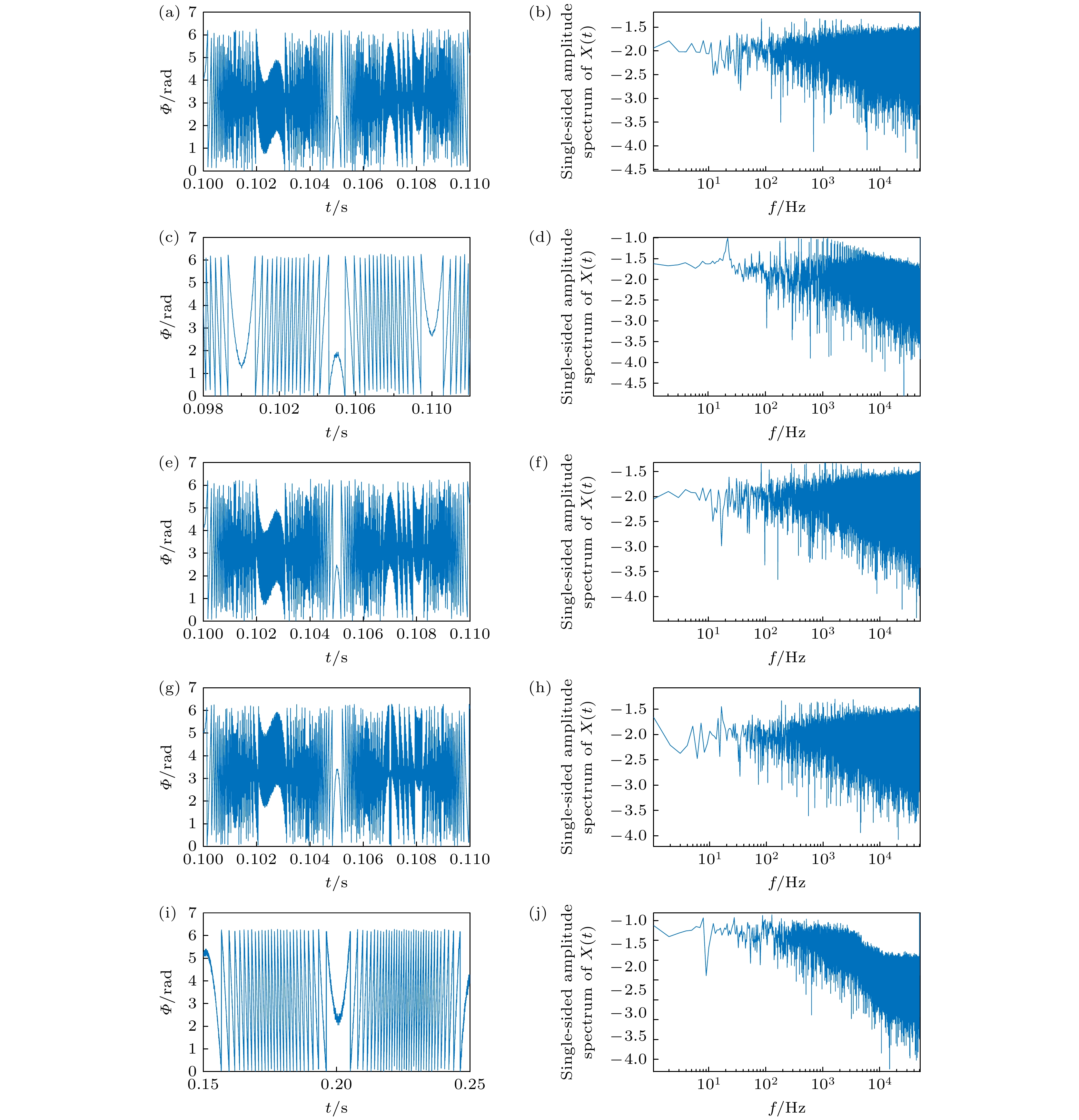 Wavelength-tunable lasers play a crucial role in fields such as precision interferometry and ultra-stable laser applications. The precision of wavelength tuning and the accuracy of frequency stabilization in lasers are the key indicators of their performance. To improve these performance, closed-loop control with dual-beam paths, such as saturated absorption spectrum spatial stabilization, is commonly utilized. The signal-to-noise ratio (SNR) of the control beam detection significantly affects the control precision. Investigating the parameters that influence this SNR and analyzing their relationships are of great engineering significance for further improving the tuning precision and frequency stabilization accuracy of lasers. To increase the SNR, this work examines intensity noise in wavelength-modulation systems based on the polarizer-phase-delay-polarizer model. A polarization beam splitter (PBS) cannot achieve a zero polarization extinction ratio (PER), thus introducing intensity noise from the interference between p and s polarization light. Additionally, non-ideal stray light, such as back-reflected and scattered light from optical components, further reduces the SNR of the detection signal when it converges on the detector’s active area. This work carries out a detailed analysis of these two types of noise, exploring the effects of factors such as PER, wavelength-modulation range, beam diameter, laser polarization direction, and modulation frequency. Based on the theoretical analysis, it also simulates optical phenomena involving half-wave plates with different tilt angles and rotation angles, as well as dual-frequency Gaussian elliptically polarized light under various modulation parameters. The theoretical analysis indicates that the intensities of p and s polarization light undergo periodic variations as the angle between the half-wave plate’s optical axis and the PBS’s slow-axis direction, as well as the angle between the linear-polarization direction and the half-wave plate’s optical axis, changes. The extreme positions of these intensities move with the PER changing. At certain specific angles, destructive interference leads to extremely low intensities in both transmitted and reflected light. Furthermore, when the detector receives stray light of multiple frequencies, the synthesized phase varies periodically with wavelength tuning. This means that over time (corresponding to tuning the center wavelength to different values), the interference intensity exhibits periodic changes from constructive interference to destructive interference and then to constructive interference. Consequently, abnormal dips and peaks may appear in the optical signal intensity. A 633-B-A81-SA-PZT laser from LD-PD INC with a 10 mW output is used in the experiment. A true zero-order half-wave plate model centered at 633 nm is adopted in the simulation. The laser wavelength is tunable in the range of 633 nm±10 pm, and 10 kHz sine-wave current modulation is used, with a wavelength-current tuning coefficient of 1 pm/mA. After an isolator, a 90∶10 coupler splits the beam into a 9 mW output and a 1 mW experiment beam, which is collimated and adjusted by a polarizer, a true zero-order half-wave plate, and a PBS to set the ratio of p light power to s light power. Two Thorlabs FDS100 detectors capture the beams, with signals collected via a data acquisition card. The PD1 and PD2 signals show significant differences under certain conditions, and the p and s light signals vary periodically with half-wave plate rotating. Adding a polarizer at the laser exit and adjusting its angle can improve signal consistency. After alignment, the SNR increases from 10 dB to 31 dB. In this study, wavelength of a 633 nm semiconductor laser is tuned by using a saturated absorption spectrum ring light path. Under different modulation conditions, inconsistencies in the intensity signals of two beams are observed. Polarization control increases the SNR to 31 dB, confirming the theoretical model. Additionally, time domain analysis of stray light from the wavelength-tuned source shows that reducing the wavelength tuning range and modulation frequency can effectively suppress high frequency noise.