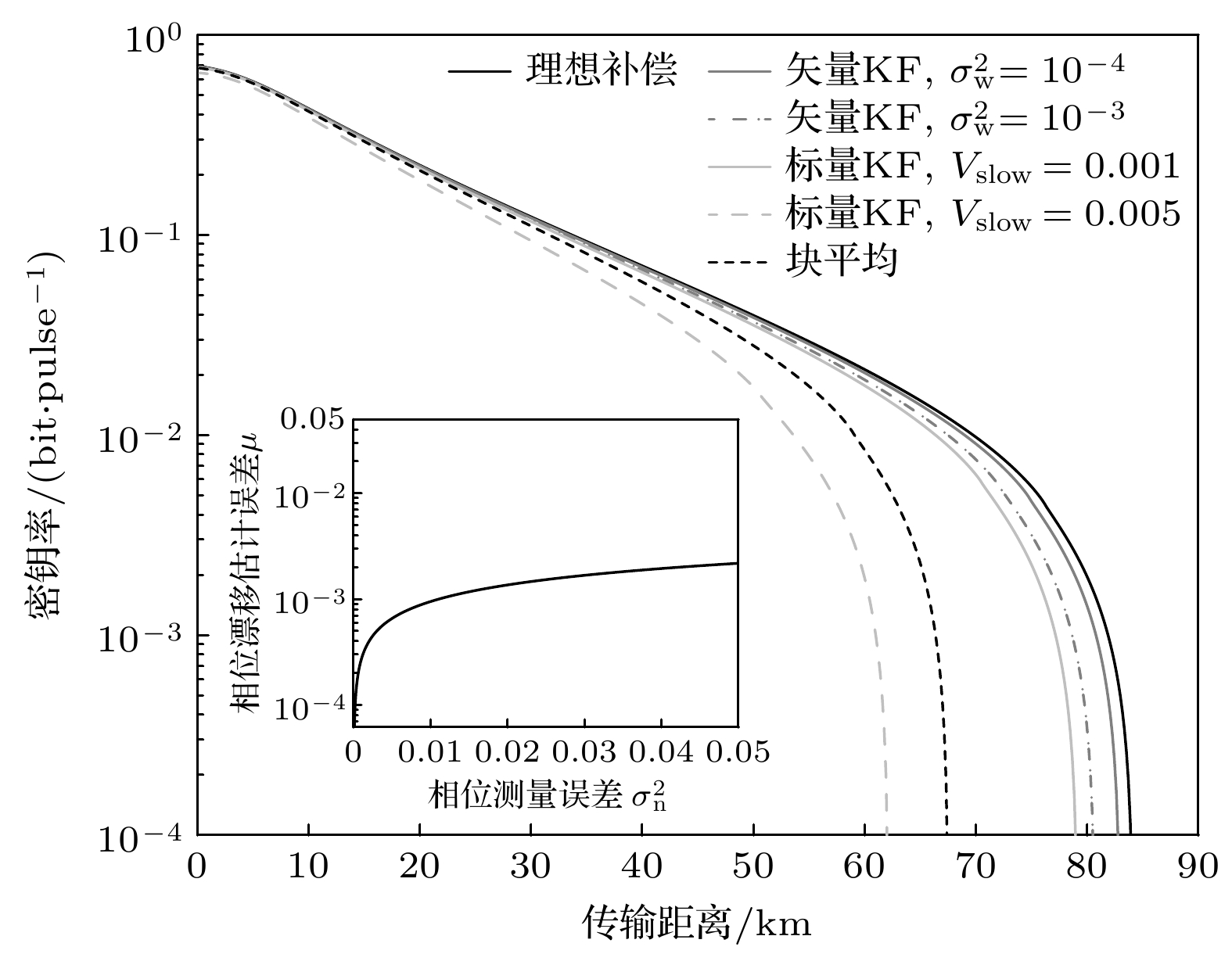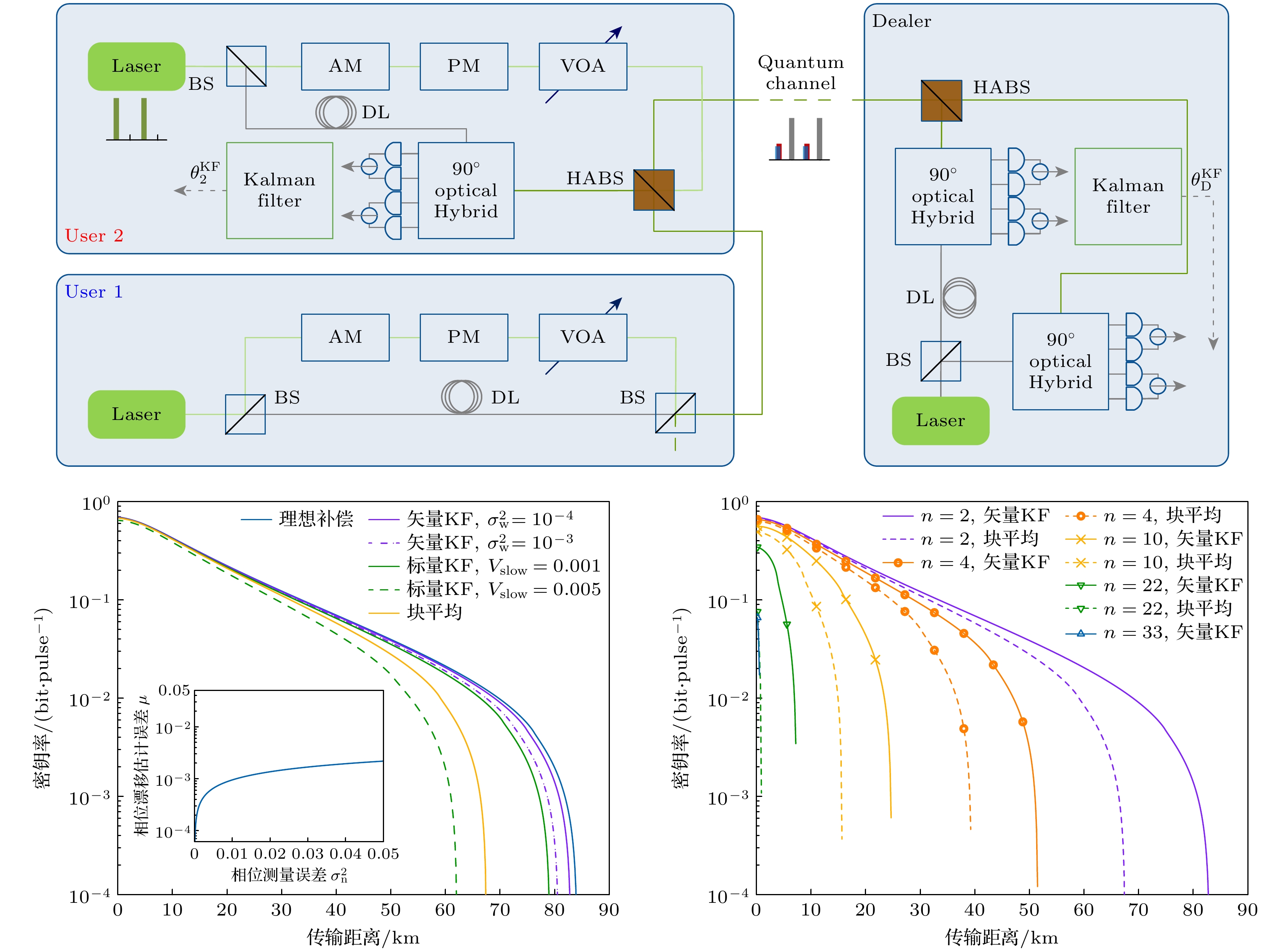 In a practical continuous-variable quantum secret sharing system, the local oscillator transmitted via an insecure channel may be subjected to security threats due to various targeted attacks. To solve this problem, this paper proposes a continuous-variable quantum secret sharing scheme with local intrinsic oscillator, in which the intrinsic oscillator is generated locally at the trusted end without being sent by each user, thus completely plugging the relevant security loopholes. The scheme consists of three stages: preparation, where users generate Gaussian-modulated coherent states and reference signals; measurement, where the dealer performs heterodyne detection by using the local intrinsic oscillator and reference phases; post-processing, which involves parameter estimation, phase compensation, and secure key extraction. On this basis, Kalman filter (KF) is utilized to estimate the minimum mean square error for each reference phase separately, reducing the phase drift estimation error and suppressing the phase measurement noise. Phase compensation methods for scalar KF and vector KF are developed respectively, where scalar KF requires additional block averaging for slow phase drift, while vector KF simultaneously models fast and slow drifts, enabling one-step compensation with minimized estimation errors. The excess noise of the filtered system including modulation noise, phase noise, photon leakage noise, and ADC quantization noise is modeled, with KF reducing phase measurement noise via dynamic gain optimization. Security bound against eavesdroppers and dishonest users is derived. Numerical simulations under practical parameters demonstrate significant improvements: vector KF achieves a maximum transmission distance of 82.6 km (vs. 67.3 km for block averaging) and supports 33 users (vs. 22), with excess noise reduced by 40% at 60 km. The scheme’s robustness is further validated under varying reference signal amplitudes, showing stable performance even at lower levels, minimizing interference with quantum signals. These results highlight that the proposed scheme has significant advantages in terms of maximum transmission distance and maximum number of supported users, and has the potential to build adaptive KF algorithms for dynamic user scenarios and quantum machine learning integration.