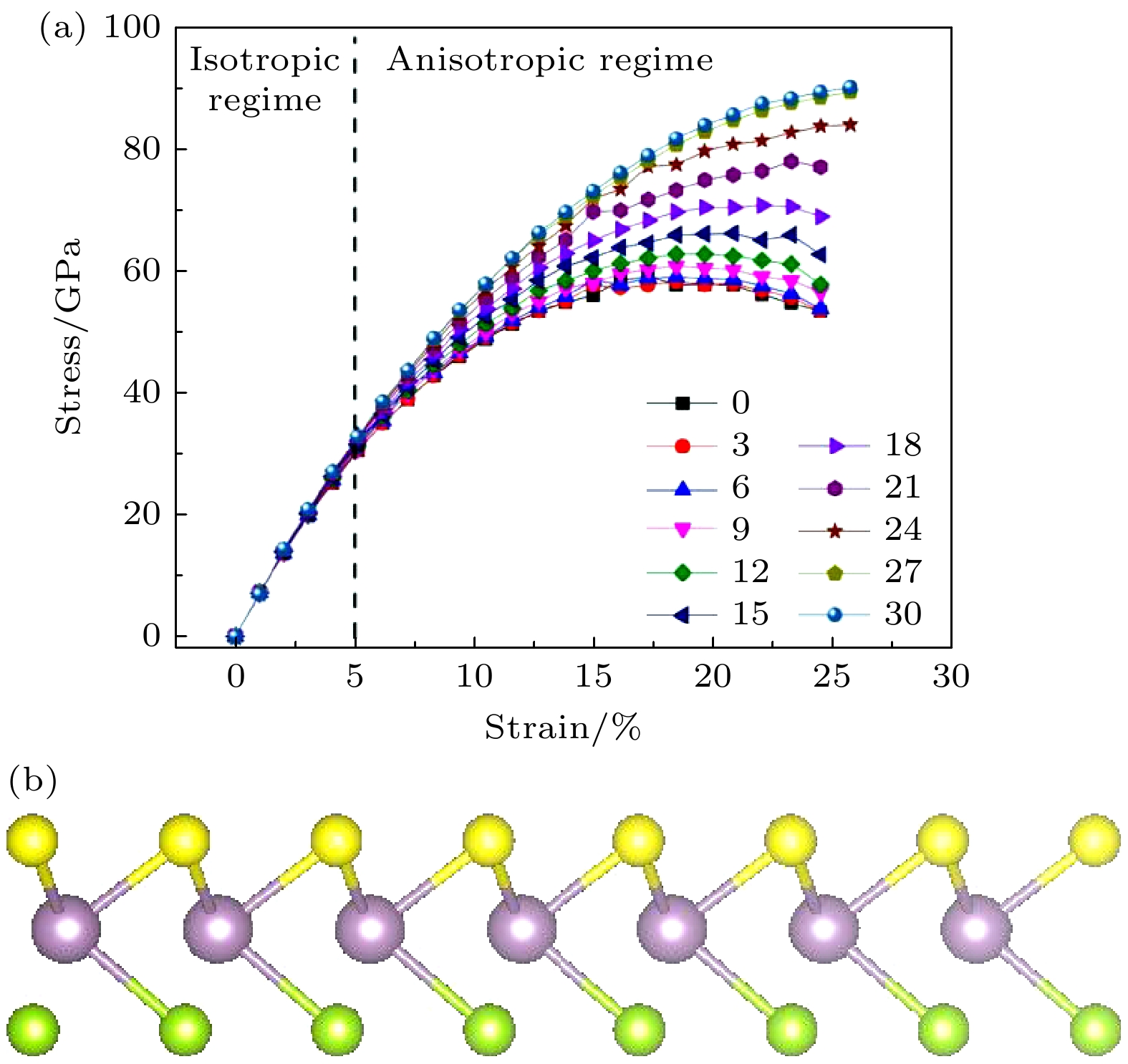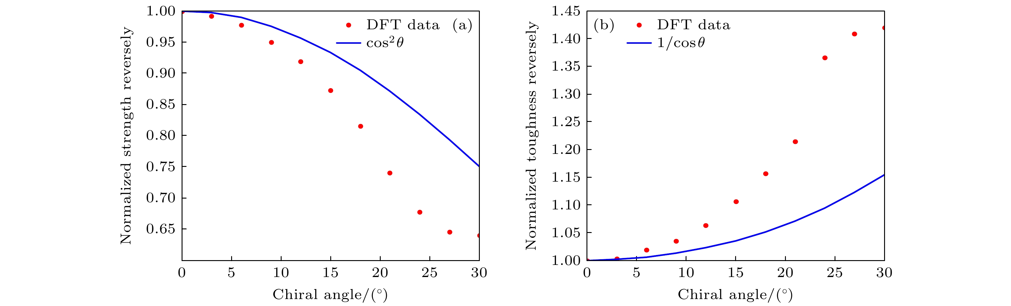 The monolayer Janus MoSSe is different from its parent materials MoS2 and MoSe2. It is of great significance to study the unique mechanical properties of monolayer Janus MoSSe under uniaxial strain due to the asymmetry of its structure. Theoretical studies can provide useful support for improving the mechanical properties of monolayer Janus materials under strain. By using the first-principles method based on the density functional theory and combining the classical mechanics analysis, the mechanical properties of monolayer Janus MoSSe with broken symmetry under uniaxial tensile strain at different chiral angles are investigated. The results show that the stress-strain curves are isotropic at different chiral angles when the strain is less than 5%. When the strain exceeds 5% and the Mo—S bond and Mo—Se bond are not broken, the stress-strain curves at different chiral angles show strong anisotropic responses. The strength and toughness of monolayer Janus MoSSe are highly anisotropy- and chirality-dependent. In contrast, its in-plane stiffness remains constant at different chiral angles. By comparing the results from the first-principles method of quantum mechanics with those from the classical mechanics method, it is shown that first-principles calculations involving many-body interactions between electrons play an important role in determining the strength and toughness of this material. This is because the first-principles method can incorporate more accurately the many-body interactions between electrons. This study provides guidance for constructing and developing monolayer Janus MoSSe based nanomechanical devices.