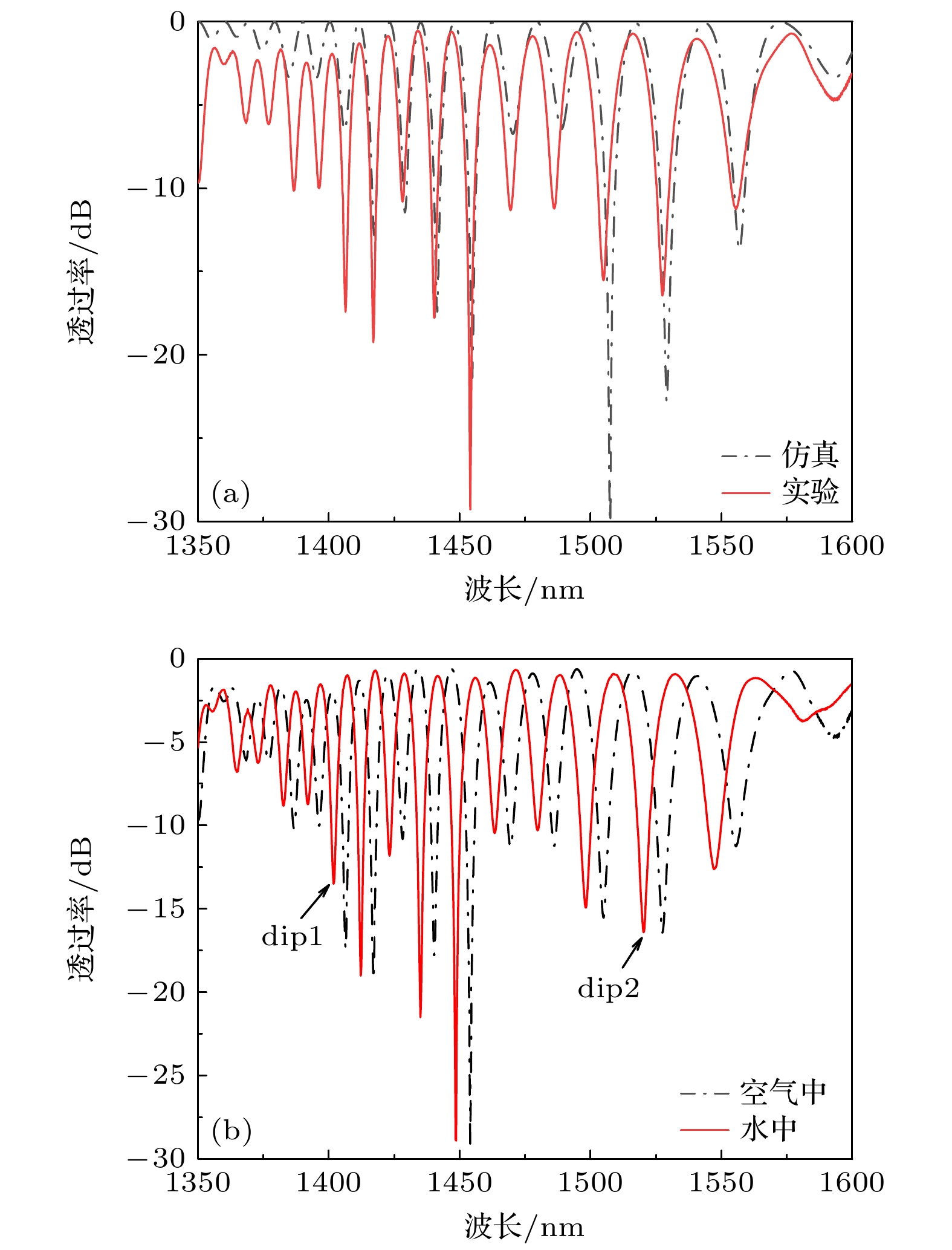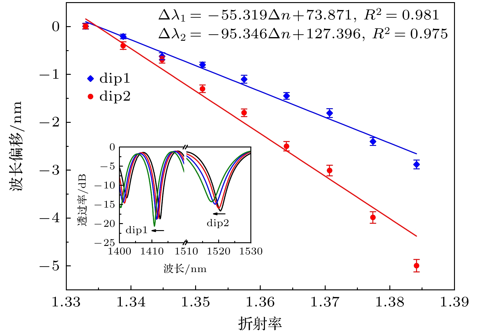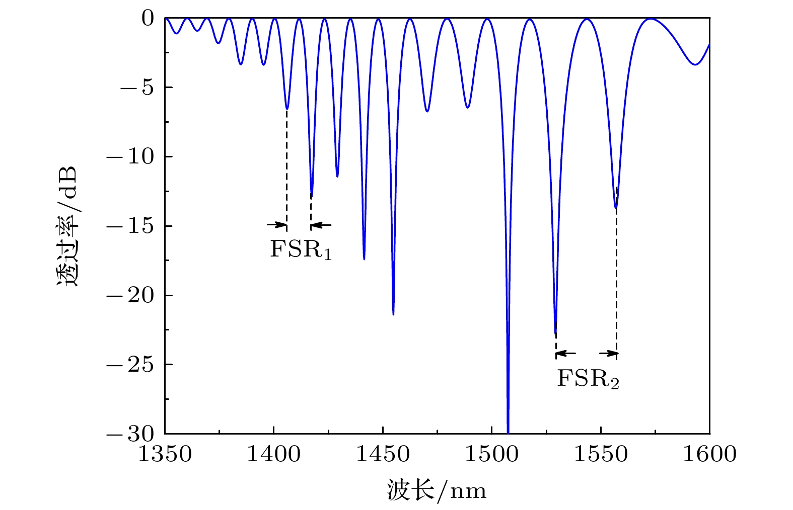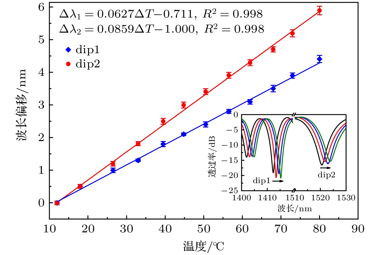 A dual-parameter sensor based on a symmetrically chirped long-period fiber grating (SCLPFG) is proposed and demonstrated. The SCLPFG consists of two segments of long-period fiber gratings (LPFGs) with the same length and average period but opposite chirp coefficients, forming an in-fiber Mach-Zehnder interferometer (MZI). Due to the chirping effect of the LPFG, the core mode at different wavelength couples to the cladding modes at different positions within the positively chirped LPFG. Integrated with the symmetry of the SCLPFG, the stimulated cladding mode recouples to the core at the symmetrical position in the negatively chirped LPFG. Consequently, in this MZI configuration, the effective length of the interference arm is not fixed but varies with wavelength. As a result, the transmission spectrum of the SCLPFG is characterized by a nonuniform fringe pattern where the free spectrum range (FSR) increases with wavelength increasing. For the MZI-based fiber sensor, the phase difference between the core and cladding modes, influenced by environmental parameters, plays a crucial role in determining sensitivity, as this phase difference is directly proportional to the length of the interference arm. Therefore, for a specific measurand, the sensitivities interrogated by the dips at different wavelengths in the fringe pattern are inherently different, which leads to the possibility of multi-parameter sensing through a differential modulation method. The fringe characteristics and sensing mechanism are systematically investigated through theoretical analysis and numerical simulation. In the experimental section, the SCLPFG structure is engraved on a Corning single-mode fiber by irradiating photosensitive core with point-by-point UV pulsed laser. The grating exhibits an average period of 321 μm and a chirping coefficient of ±21.9 μm/cm, with the total length of the symmetrically chirped grating determined to be 4.34 cm. Experimental implementation of simultaneous dual-parameter sensing for surrounding refractive index (SRI) and temperature is conducted, verifying the differential response of distinct fringe dips to SRI and temperature variations. A 2×2 sensitivity coefficient matrix is established by linearly fitting the SRI and temperature response data, which are obtained by interrogating two dips at different wavelengths. Thus, the variations of SRI and temperature are determined by multiplying the inverse sensitivity coefficient matrix with the wavelength shift array. Furthermore, temperature sensitivities are corrected by considering the thermal effect on the refractive index of the liquid. Finally, the maximum sensitivity of the sensor to SRI is –95.316 nm/RIU and a maximum sensitivity to temperature is 0.0849 nm/℃, both of which have excellent linearity. This sensing scheme features a compact structure, high sensitivity, and the ability to measure multiple parameters. Moreover, the multi-channel nonuniform fringe characteristics enable the sensor configuration to be extended for simultaneous measurement of three or more parameters, thus providing a promising lab-on-fiber platform for multi-parameter sensing applications.