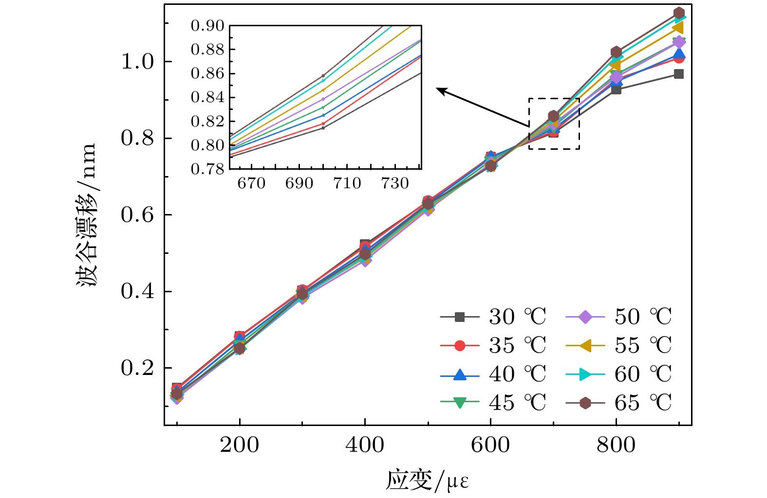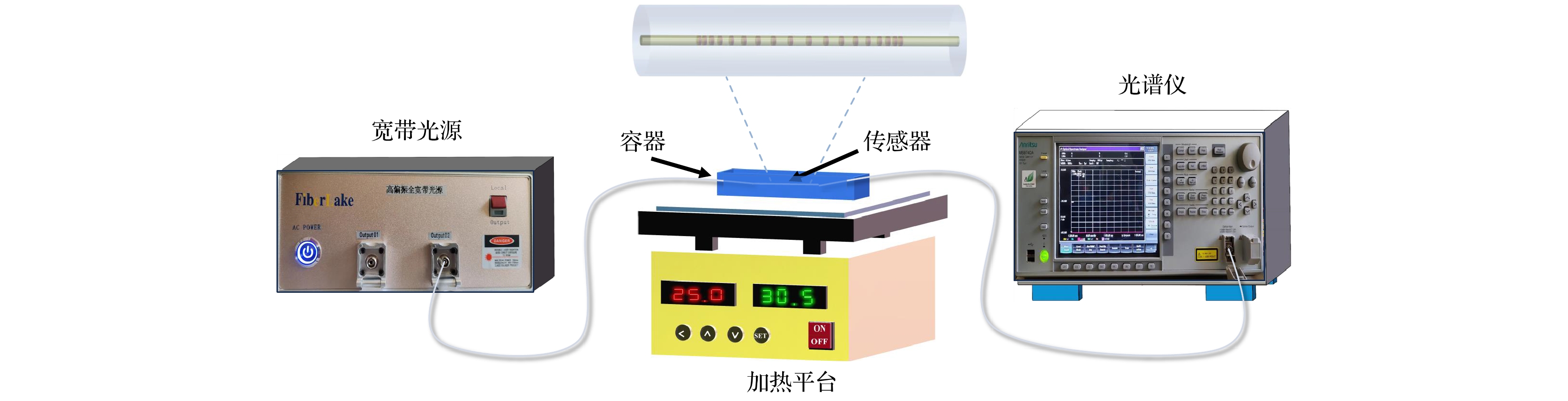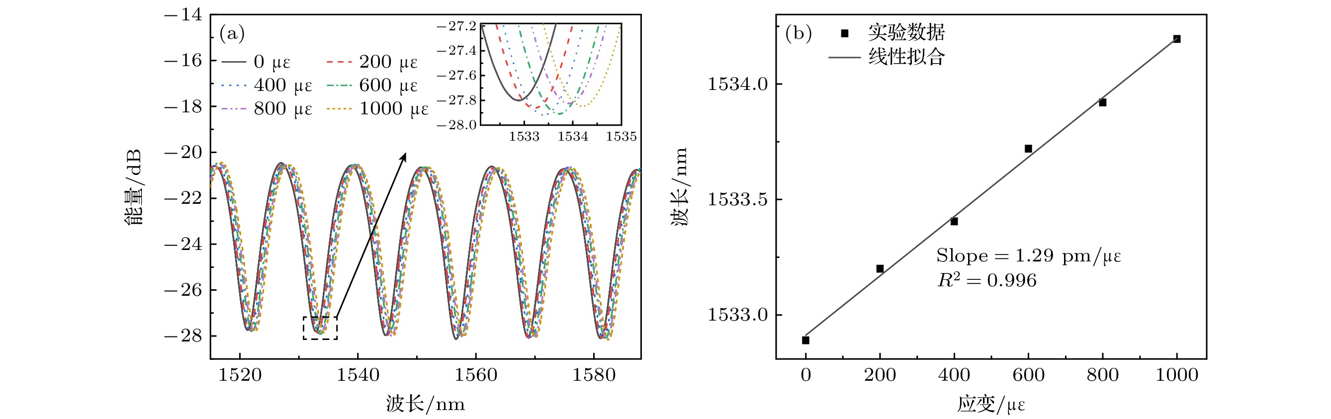 A dual-parameter sensor based on a symmetrically chirped long-period fiber grating (SCLPFG) is proposed and demonstrated. The SCLPFG consists of two segments of long-period fiber gratings (LPFGs) with the same length and average period but opposite chirp coefficients, forming an in-fiber Mach-Zehnder interferometer (MZI). Due to the chirping effect of the LPFG, the core mode at different wavelength couples to the cladding modes at different positions within the positively chirped LPFG. Integrated with the symmetry of the SCLPFG, the stimulated cladding mode recouples to the core at the symmetrical position in the negatively chirped LPFG. Consequently, in this MZI configuration, the effective length of the interference arm is not fixed but varies with wavelength. As a result, the transmission spectrum of the SCLPFG is characterized by a nonuniform fringe pattern where the free spectrum range (FSR) increases with wavelength increasing. For the MZI-based fiber sensor, the phase difference between the core and cladding modes, influenced by environmental parameters, plays a crucial role in determining sensitivity, as this phase difference is directly proportional to the length of the interference arm. Therefore, for a specific measurand, the sensitivities interrogated by the dips at different wavelengths in the fringe pattern are inherently different, which leads to the possibility of multi-parameter sensing through a differential modulation method. The fringe characteristics and sensing mechanism are systematically investigated through theoretical analysis and numerical simulation. In the experimental section, the SCLPFG structure is engraved on a Corning single-mode fiber by irradiating photosensitive core with point-by-point UV pulsed laser. The grating exhibits an average period of 321 μm and a chirping coefficient of ±21.9 μm/cm, with the total length of the symmetrically chirped grating determined to be 4.34 cm. Experimental implementation of simultaneous dual-parameter sensing for surrounding refractive index (SRI) and temperature is conducted, verifying the differential response of distinct fringe dips to SRI and temperature variations. A 2×2 sensitivity coefficient matrix is established by linearly fitting the SRI and temperature response data, which are obtained by interrogating two dips at different wavelengths. Thus, the variations of SRI and temperature are determined by multiplying the inverse sensitivity coefficient matrix with the wavelength shift array. Furthermore, temperature sensitivities are corrected by considering the thermal effect on the refractive index of the liquid. Finally, the maximum sensitivity of the sensor to SRI is –95.316 nm/RIU and a maximum sensitivity to temperature is 0.0849 nm/℃, both of which have excellent linearity. This sensing scheme features a compact structure, high sensitivity, and the ability to measure multiple parameters. Moreover, the multi-channel nonuniform fringe characteristics enable the sensor configuration to be extended for simultaneous measurement of three or more parameters, thus providing a promising lab-on-fiber platform for multi-parameter sensing applications.
