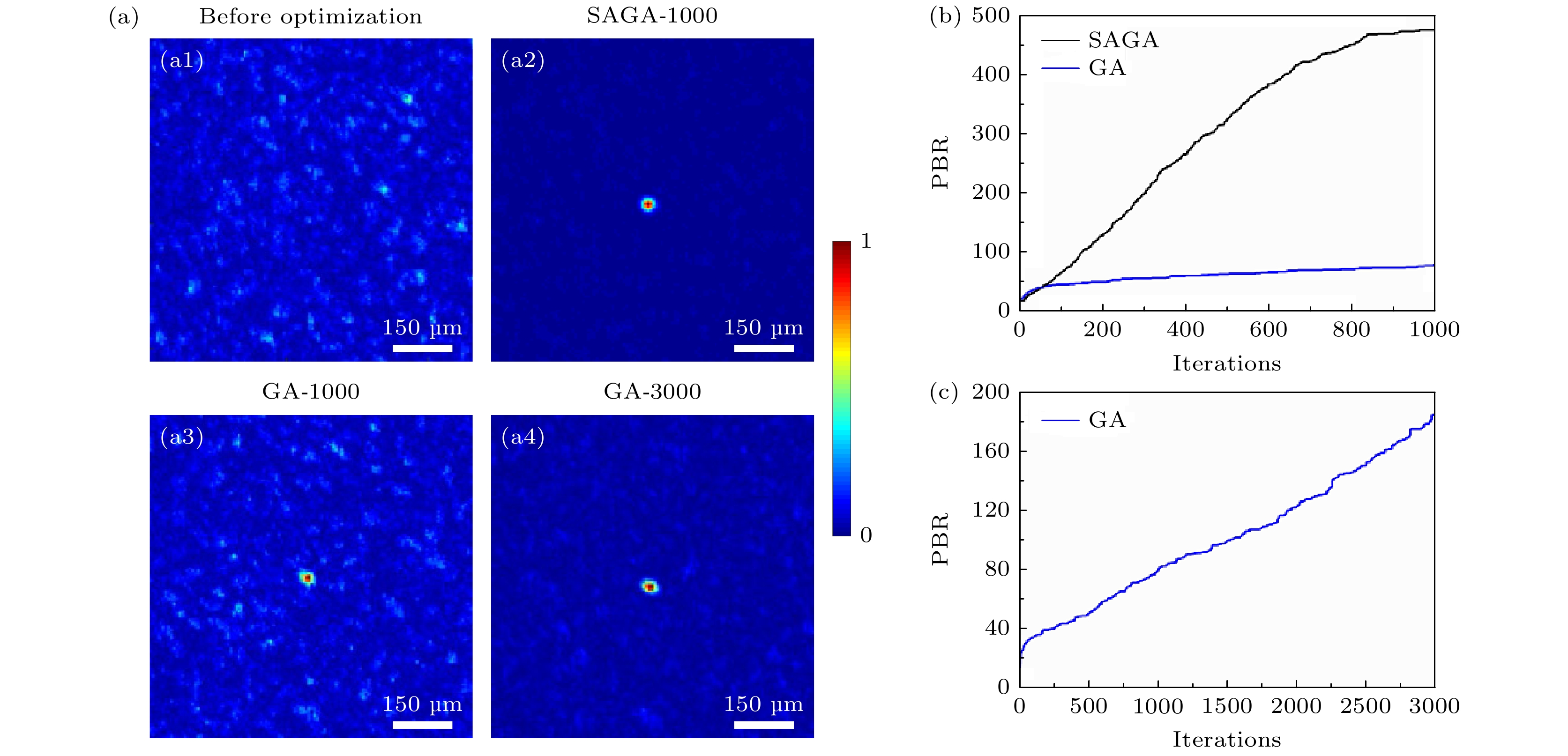 Modulating the light field scattered by scattering media has potential applications in biological tissue imaging, military anti-terrorism, and optical information transmission. However, light reflected by complex scattering media, such as biological tissues, clouds and fog, multi-mode fiber, and white paper, will produce disorderly scattering, and then disturb the wavefront of incident light. It has always been the main obstacle to optical imaging and effective information transmission. Therefore, the control of backscattered light field is also a research field worthy of attention, which is of great significance for the transmission of non-line-of-sight optical information. It is also very important to find a method of efficiently controlling backscattered light field for the breakthrough of related applications. It has been found that iterative wavefront shaping technology is an effective solution, which gradually modulates the amplitude or phase distribution of wavefront according to the feedback of the light intensity distribution in the target area of charge coupled device (CCD). An improved genetic algorithm, self-adaptation genetic algorithm (SAGA), is proposed, which can be used to rapidly modulate the backscattered light field. The amplitude distribution of wavefront is controlled, which makes it form the required pattern at the target position through the interference of light. During the implementation of the algorithm, the SAGA performs gene crossover and mutation separately, and selects gene crossover and mutation operations according to the number of iterations. At the beginning of evolution, the probability of selecting gene mutations is higher because the population needs to adapt to the environment, while at the end of evolution, the probability of selecting gene mutations is lower because it gradually adapts to the environment. In the experimental measurement, the effective modulation area of digital-micromirror device (DMD) is 1024×1024, which is divided into 64×64 modulation segments by pixel merging. Each segment number is assigned a value of 0 or 1. Focusing and image projection performance of scattered light field are evaluated based on peak-to-background ratio (PBR) and Pearson correlation coefficient (Cor), respectively. By comparing the scattered light focusing and image projection of SAGA and genetic algorithm (GA), it is found that SAGA can accurately control the backscattered light field and converge to the optimal value in a few iterations. After 1000 iterations, the GA still has a clear speckle background. With the increase of iteration times, GA will also show bright focus and clear projection image. Compared with GA, SAGA has a modulation speed that is 8.3 times faster in light focusing and 14.38 times faster in image projection, greatly improving the modulation speed of the scattered light field. The fast control technology for scattered light field can lead to numerous new optical communication applications and offer fresh insights into the study of optics and information science.