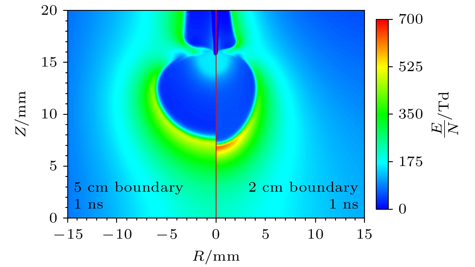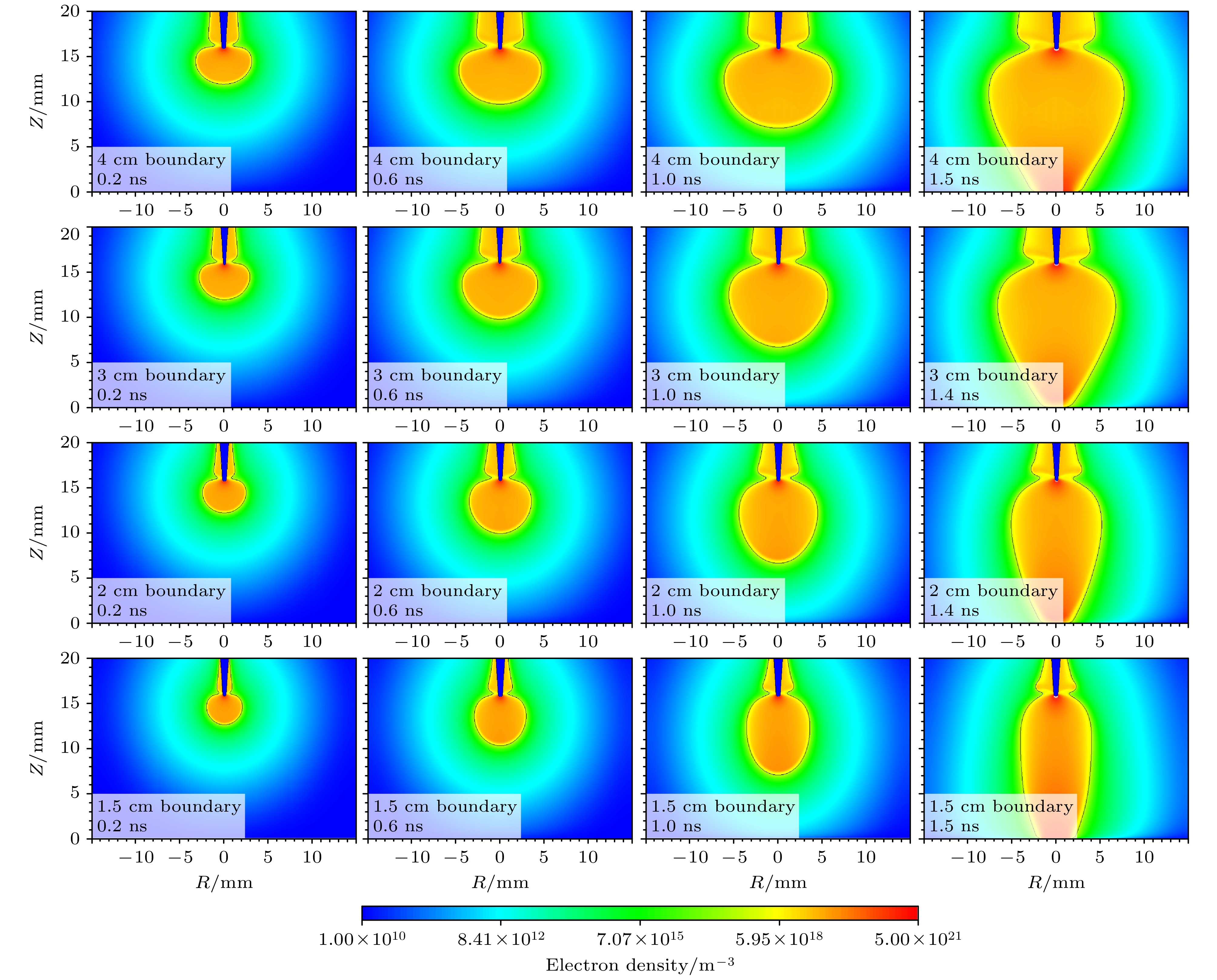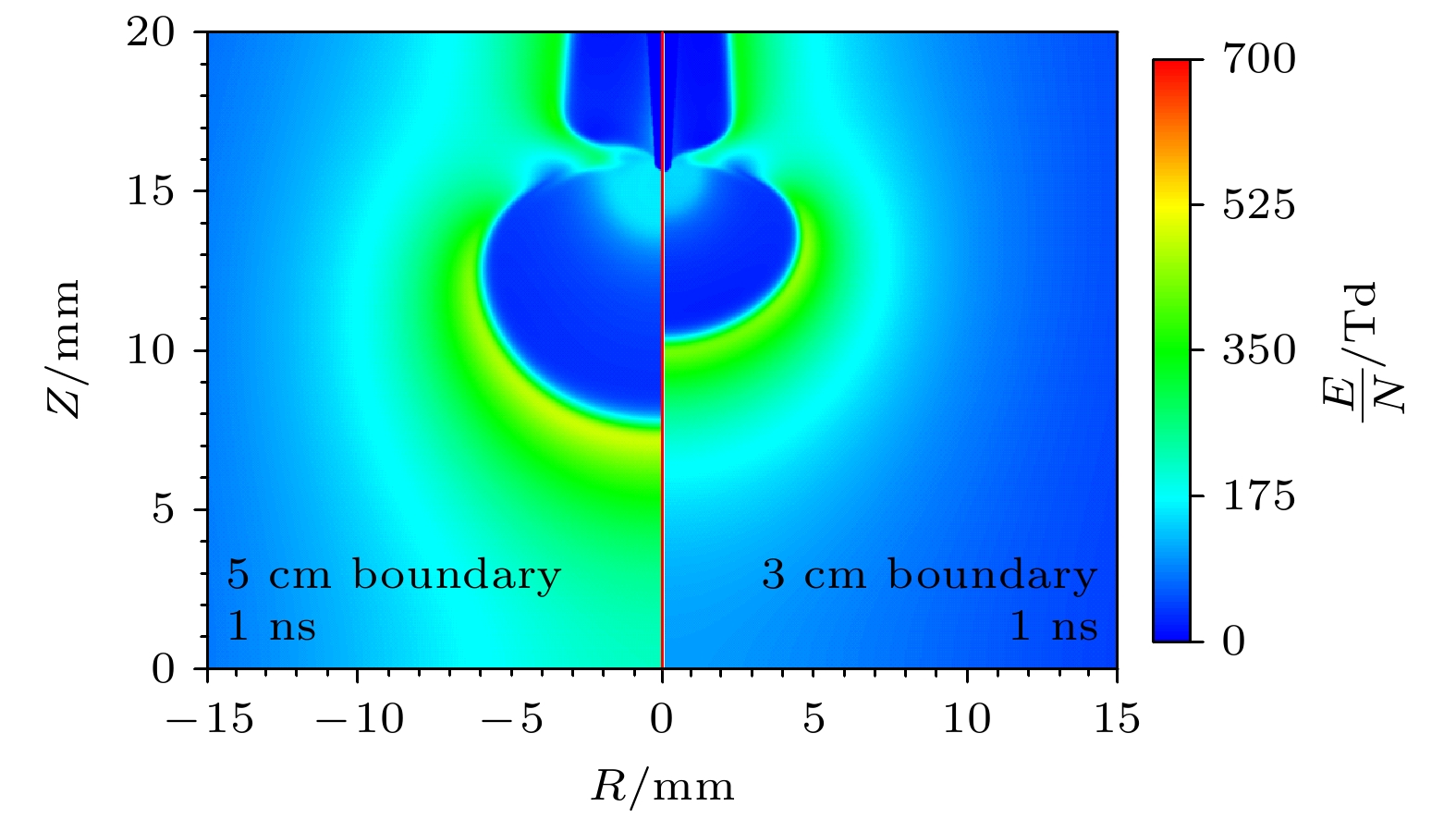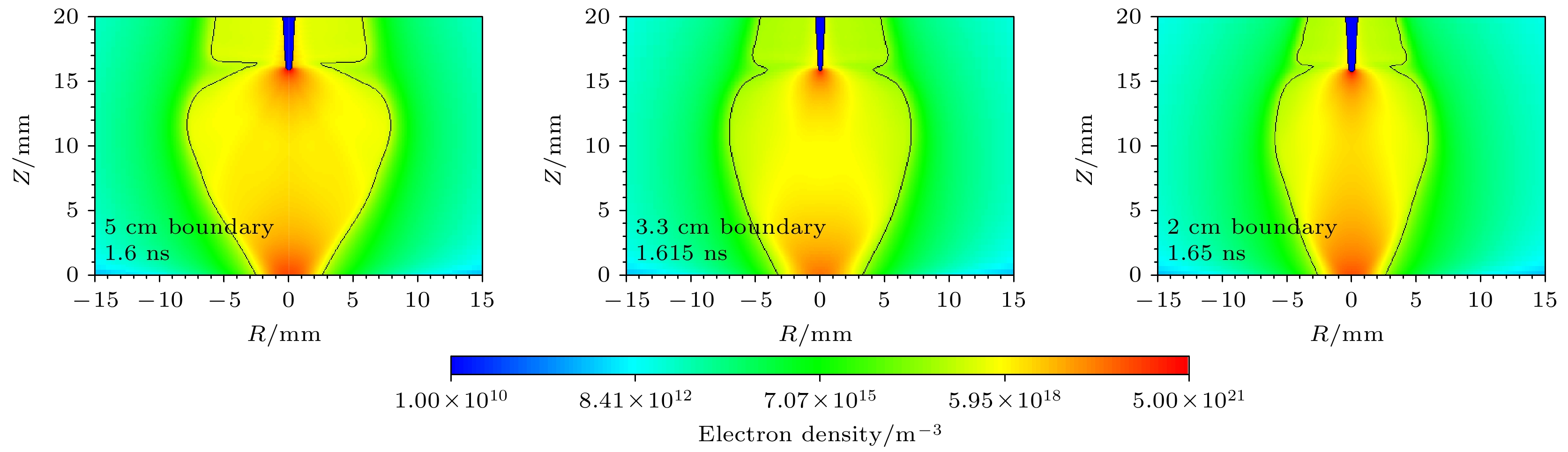 Diffuse discharges generated by fast rising edge of nanosecond pulses possess a larger discharge radius than classic streamer discharges. However, existing simulation studies often employ boundary ranges similar to those used for simulating streamer discharges, thus neglecting the influence of the boundary range on their characteristics. In this work, the characteristics of diffuse discharges in atmospheric-pressure air are investigated using a fluid model. The research focuses on the influences of plasma and Poisson equation boundary ranges, especially the top and right boundaries of the rectangular computational domain, on discharge evolution. The comparison between numerical simulations and experimental results reveals several key findings: When both plasma and Poisson equation boundaries are set to 5 cm×5 cm (exceeding six times the maximum discharge radius), the simulated discharge width and propagation velocity accord well with experimental measurements. However, consistent delays are observed in simulating the time required to reach the plate electrode, highlighting the inherent limitations of current fluid models in accurately simulating temporal scales. Reducing the plasma boundaries results in negligible fluctuations in electric field strength and electron density at the discharge head, indicating a minimal effect on macroscopic discharge characteristics. Narrowing the Poisson equation’s right boundary significantly reduces the discharge width while simultaneously increasing the discharge width relative to the domain size. Asymmetric propagation patterns occur between the upper and lower halves of the discharge gap. Nevertheless, appropriate reduction of the right boundary improves morphological consistency with experimental observations, thereby suggesting practical optimization strategies. Conversely, reducing the top boundary weakens the electric field “focusing effect” at the discharge head, homogenizes the spatial field distribution, and delays accelerating, thereby exacerbating deviations from experimental data. These results demonstrate that Poisson boundary conditions critically govern spatiotemporal discharge dynamics. Top boundary truncation significantly reduces the simulation accuracy, whereas adjusting the right boundary allows for a balanced optimization between computational efficiency and result reliability. This work provides theoretical guidance for selecting boundary conditions in the numerical modeling of diffuse discharges.