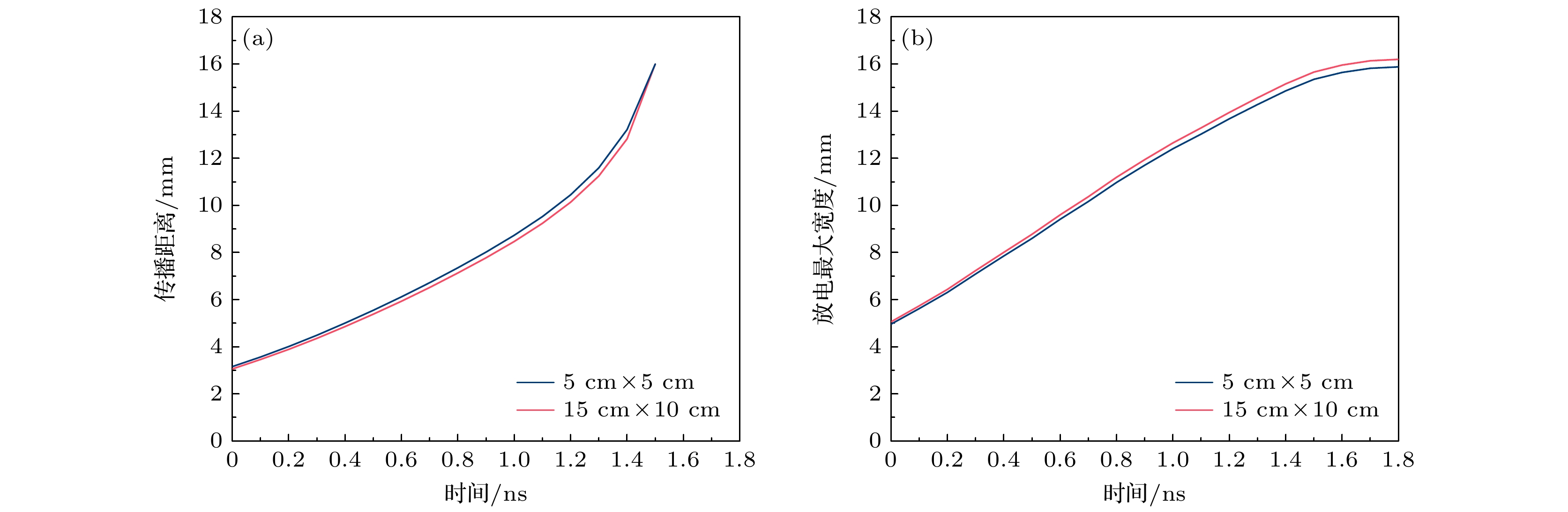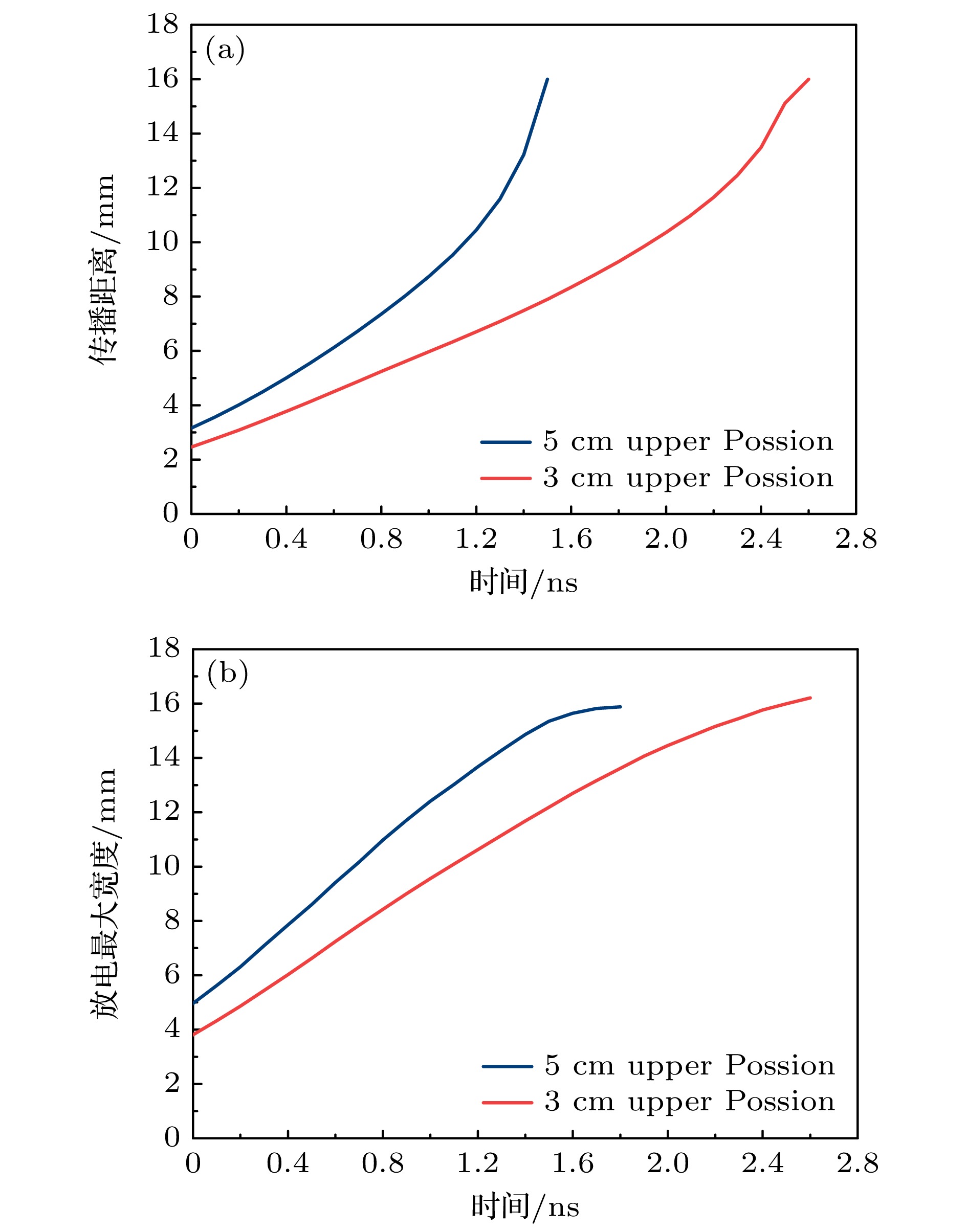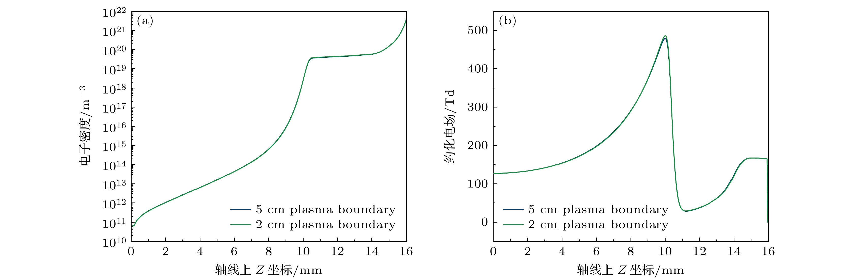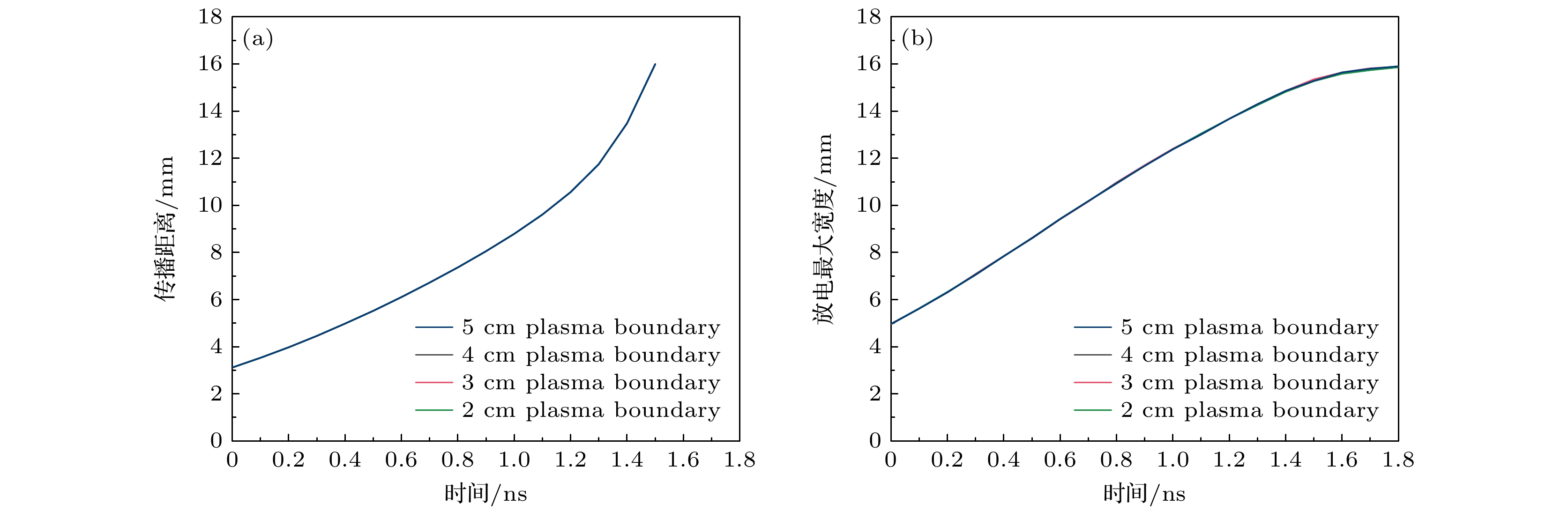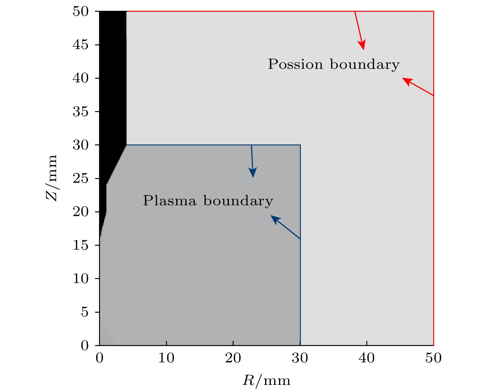 Diffuse discharges generated by fast rising edge of nanosecond pulses possess a larger discharge radius than classic streamer discharges. However, existing simulation studies often employ boundary ranges similar to those used for simulating streamer discharges, thus neglecting the influence of the boundary range on their characteristics. In this work, the characteristics of diffuse discharges in atmospheric-pressure air are investigated using a fluid model. The research focuses on the influences of plasma and Poisson equation boundary ranges, especially the top and right boundaries of the rectangular computational domain, on discharge evolution. The comparison between numerical simulations and experimental results reveals several key findings: When both plasma and Poisson equation boundaries are set to 5 cm×5 cm (exceeding six times the maximum discharge radius), the simulated discharge width and propagation velocity accord well with experimental measurements. However, consistent delays are observed in simulating the time required to reach the plate electrode, highlighting the inherent limitations of current fluid models in accurately simulating temporal scales. Reducing the plasma boundaries results in negligible fluctuations in electric field strength and electron density at the discharge head, indicating a minimal effect on macroscopic discharge characteristics. Narrowing the Poisson equation’s right boundary significantly reduces the discharge width while simultaneously increasing the discharge width relative to the domain size. Asymmetric propagation patterns occur between the upper and lower halves of the discharge gap. Nevertheless, appropriate reduction of the right boundary improves morphological consistency with experimental observations, thereby suggesting practical optimization strategies. Conversely, reducing the top boundary weakens the electric field “focusing effect” at the discharge head, homogenizes the spatial field distribution, and delays accelerating, thereby exacerbating deviations from experimental data. These results demonstrate that Poisson boundary conditions critically govern spatiotemporal discharge dynamics. Top boundary truncation significantly reduces the simulation accuracy, whereas adjusting the right boundary allows for a balanced optimization between computational efficiency and result reliability. This work provides theoretical guidance for selecting boundary conditions in the numerical modeling of diffuse discharges.