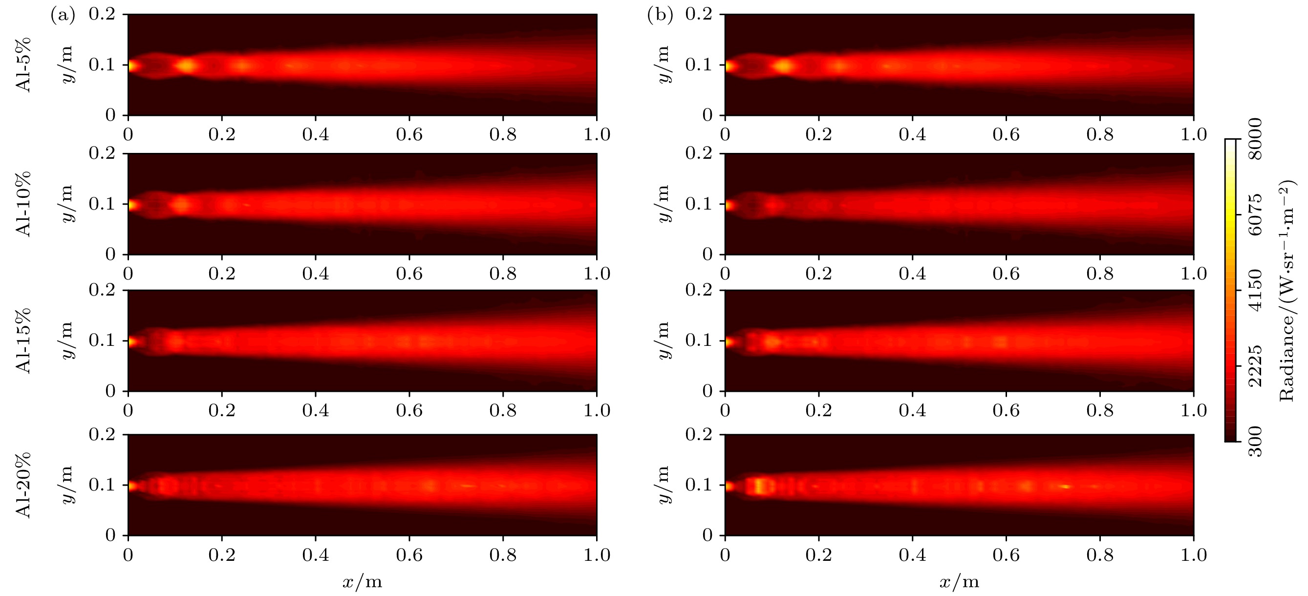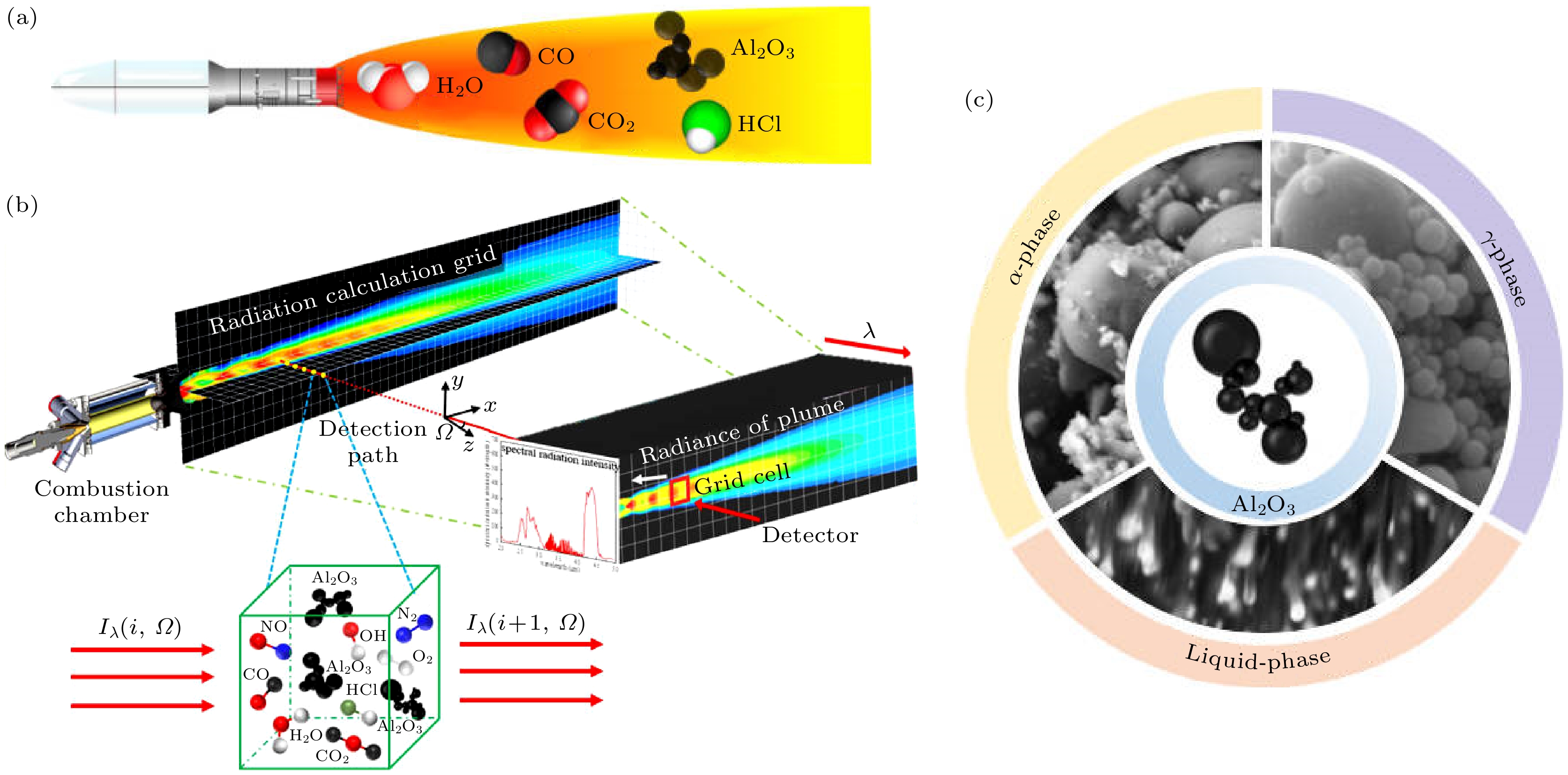Aluminum-doped propellants are widely used in strategic tactical missiles for their reliability, durability and adaptability. The accurate identification of infrared radiation characteristics of exhaust plumes, as a main means of passive detection, is helpful for rapid warning and tracking. In response to the shortcomings of traditional model that ignores the evolution of particle crystal phases, this paper proposes a radiation calculation model for multiphase Al2O3 containing the solid rocket plumes based on the changes of Al2O3 crystal structure in high temperature environments. The radiative transfer equation of the gas-solid two-phase plume is solved by using spherical harmonic discrete ordinate method (SHDOM). Compared with the classical method of simplifying the Al2O3 particles as single liquid phase particles, the model is more consistent with the results of experimental measurement data, which further improves the calculation accuracy. The infrared spectral radiation characteristics of plumes with different aluminum doping ratios are investigated using the model. The results show that under low aluminum doping ratios, the classical method significantly overestimates the plume radiation in the near-infrared band. At 1.7–2.0 μm, the maximum decrease is 67.2%; in the range of 2.5–3.0 μm, the difference in results between the two methods decreases from 21.6% to 3.6% with the increase of aluminum doping rate; and the particle phase transition in the range of 4.0–4.5 μm does not have much influence on the overall results, whose difference is about 7% on average. Therefore, it is necessary to accurately predict the radiation characteristics by considering the phase change of particles in the plume. These results contribute to the accurate detection and identification of solid rocket motors.