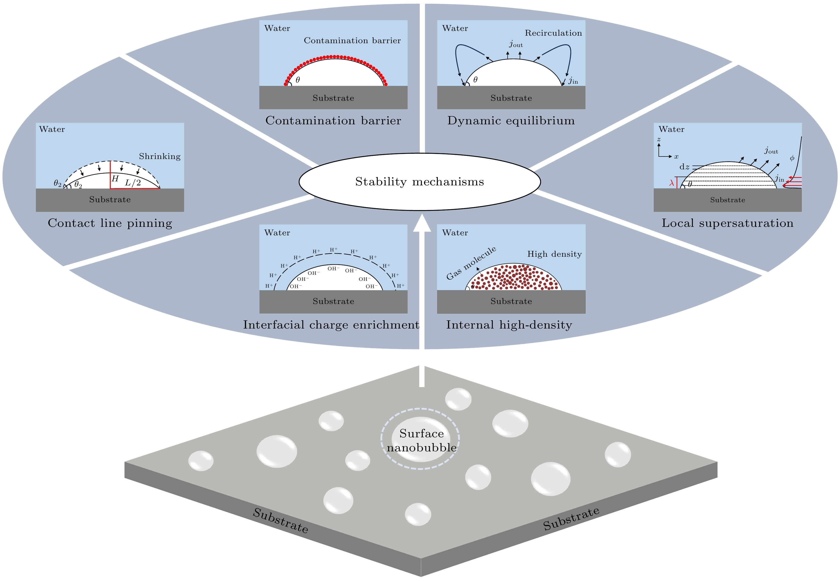 Surface nanobubbles, as nanoscale gaseous domains spontaneously formed at solid-liquid interfaces, exhibit significant potential applications in the biomedical field due to their unique nanoscale size effects, rapid dynamic response characteristics, and favorable biocompatibility. In ultrasonic imaging, surface nanobubbles enhance tissue acoustic contrast by generating strong harmonic scattering signals through nonlinear oscillation under stable cavitation. In antibacterial disinfection applications, the rupture of surface nanobubbles generates a transient high pressure, which synergizes with oxidative damage mediated by reactive oxygen species /hydroxyl radicals to achieve efficient bacterial inactivation. However, in physiological environments, blood flow shear stress and pH fluctuations may induce premature rupture of surface nanobubbles, leading to imaging signal attenuation or risks of non-specific tissue damage, rendering their stability a critical factor determining functional efficacy and biosafety. Notably, the experimental observation of surface nanobubble lifetimes (ranging from hours to days) significantly contradicts the dissolution behavior within microseconds predicted by classical thermodynamic theory, which urgently demands the construction of theoretical models of stability. Although existing theoretical modelshave elucidated the stability mechanisms of surface nanobubbles from multiple perspectives, they arelimited by the lack of intrinsic correlation and inherent limitations, thereby restricting targeted optimization of stability: the contamination barrier model emphasizes that surfactant adsorption inhibits gas diffusion; the dynamic equilibrium model explains that stability arises from the dynamic balance of gas exchange at the gas-liquid interface; the contact line pinning model reveals that substrate heterogeneity constrains the evolution of the three-phase contact line; the local supersaturation model proposes that local high-concentration gas layers formed by substrate adsorption delay dissolution; the interfacial charge enrichment model suggests that electrostatic pressure from the double layer counteracts the Laplace pressure driving dissolution; the internal high-density model assumes that the condensed high-density gas inside reduces diffusion rate and partially counteracts the Laplace pressure. This review systematically summarizes the research progress of the stability mechanisms of surface nanobubbles. It first reviews the discovery history of surface nanobubbles, then deeply analyzes the core mechanisms, intrinsic correlations, and limitations of the aforementioned theoretical models., Finally, it examines the technical challenges faced by surface nanobubbles with the application examples in the biomedical field, and proposes potential optimization strategies and future perspectives based on ther theoretical models of stability.
